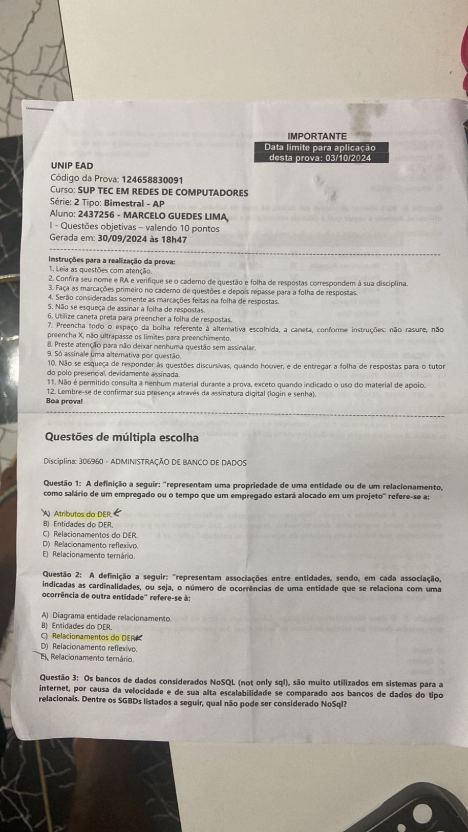 <p>IMPORTANTE Data limite para aplicação desta prova: 03/10/2024 UNIP EAD Código da Prova: 124658830091 Curso: SUP TEC EM REDES DE COMPUTADORES Série: 2 Tipo: Bimestral AP Aluno: 2437256 - MARCELO GUEDES I - Questões objetivas - valendo 10 pontos Gerada em: 30/09/2024 às 18h47 Instruções para a realização da prova: 1. Leia as questões com atenção. 2. Confira seu nome e RA e verifique se caderno de questão e folha de respostas correspondem à sua disciplina. 3. Faça as marcações primeiro no caderno de questões e depois repasse para a folha de respostas. 4. Serão consideradas somente as marcações feitas na folha de respostas. 5. Não se esqueça de assinar a folha de respostas. 6. Utilize caneta preta para preencher a folha de respostas. 7. Preencha todo o espaço da bolha referente à alternativa escolhida, a caneta, conforme instruções: não rasure, não preencha X, não ultrapasse os limites para preenchimento. 8. Preste atenção para não deixar nenhuma questão sem 9. Só assinale uma alternativa por questão. 10. Não se esqueça de responder às questões discursivas, quando houver, e de entregar a folha de respostas para o tutor do polo presencial, devidamente assinada. 11. Não é permitido consulta a nenhum material durante a prova, exceto quando indicado uso do material de apoio. 12. Lembre-se de confirmar sua presença através da assinatura digital (login e senha). Boa prova! Questões de múltipla escolha Disciplina: 306960 - ADMINISTRAÇÃO DE BANCO DE DADOS Questão 1: A definição a seguir: "representam uma propriedade de uma entidade ou de um relacionamento, como salário de um empregado ou o tempo que um empregado estará alocado em um projeto" refere-se a: A) Atributos do DER. B) Entidades do C) Relacionamentos do DER. D) Relacionamento reflexivo. E) Relacionamento ternário. Questão 2: A definição a seguir: "representam associações entre entidades, sendo, em cada associação, indicadas as cardinalidades, ou seja, o de ocorrências de uma entidade que se relaciona com uma ocorrência de outra entidade" refere-se à: A) Diagrama entidade B) Entidades do DER. C) Relacionamentos do DERK D) Relacionamento reflexivo. EX Relacionamento ternário. Questão 3: Os bancos de dados considerados NoSQL (not only sql), são muito utilizados em sistemas para a internet, por causa da velocidade e de sua alta escalabilidade se comparado aos bancos de dados do tipo relacionais. Dentre os SGBDs listados a seguir, qual não pode ser considerado NoSql?</p><p>A) Hadoop. B) Hypertable. MySQL D) E) Amazon SimpleDB. Questão 4: Para efetuar alterações em dados, no caso de tabelas, as cláusulas UPDATE e ALTER devem ser utilizadas. Assinale a seguir qual a cláusula correta para a inserção da coluna SEXO na tabela PESSOA. ID NOME IDADE SALARIO TELEFONE CODPOSTAL SEXO 1 Célia Morais 26 170000.00 4567-0098 1100 F 2 Nascimento Augusto 35 220000.00 5678-8990 2300 M 3 Paulo Viegas 32 95000.00 3456-0978 1500 M 4 Florinda Simões 35 147000.00 2350-0001 4000 F 5 Isabel Espada 28 86000.00 3690-1012 1100 F 6 Antônio Dias 43 74000.00 4490-1010 1500 M 12 Antônio 17 210000.00 2299-3035 1500 M A) UPDATE PESSOA SET SEXO CHAR (1) B) UPDATE TABLE PESSOA ADD SEXO CHAR (1) C) ALTER TABLE PESSOA ADD SEXO CHAR (1) D) ALTER PESSOA SET SEXO CHAR (1) E) ALTER TABLE PESSOA SET ADD SEXO CHAR (1) Questão 5: Data Transaction Language (DTL) é um tipo de linguagem que controla as transações que são executadas em um banco de dados. Transação é uma unidade de execução de programa que acessa e atualiza os dados. Assinale a seguir qual dos comandos pode ser acessado no DTL. A) Drop begin. B) Commit transaction. Create transaction. D) transaction. E) Procedure transaction. Questão 6: A definição a seguir: "representam categorias de fatos do mundo real, sejam eles concretos ou abstratos, como empregados, departamentos, despesas etc. São representados por retângulos nomeados por substantivos, que indicam um conjunto de ocorrências da entidade" refere-se à: A) Diagrama entidade relacionamento. B) Entidades do DER. C) Relacionamentos do DER. D) Relacionamento reflexivo. E) Relacionamento ternário. Questão 7: o Data Manipulation Language (DML) é um o tipo de linguagem que interage com os dados armazenados dentro das tabelas do banco de dados. Qual dos comandos a seguir não faz parte da DML? A) Insert. B) Update. C) Delete. D) Truncate. E) Create</p><p>mostrando onde o banco de o dados ponto está de sincronização (ou deveria estar) em estado a de consistência. As únicas operações Questão 8: Em um sistema, representa ligação entre duas transações consecutivas, que apresentam esse ponto são? COMMIT e B) Bloqueio e C) Bloqueio e D) Isolamento e E) Atomicidade e Questão 9: Um diagrama E-R é uma representação gráfica, na forma de um diagrama, no qual são utilizados apenas três conceitos. Assinale a seguir quais são esses conceitos: A) Entidades, relacionamentos e atributos. B) Chave primária, chave estrangeira e C) Variáveis, SQL e atributos. D) Inserts, Alters e Creates. E) Dados compostos, dados multivalorados e relacionamentos. Questão 10: Replicação de banco de dados é a cópia dos dados do original para outro banco de entre os dados. A replicação de banco de dados também pode ser usada para garantir a integração e a integridade replicação bancos de dados de sistemas com modelo de dados relacional distribuídos. Qual dos modelos de possui a transação concluída localmente e depois replicada, portanto, com alta escalabilidade? A) Replicação snapshot. B) Replicação síncrona (eager). C) Replicação (lazy) D) Replicação unidirecional (master-slave) E) Replicação multidirecional 7 D</p>