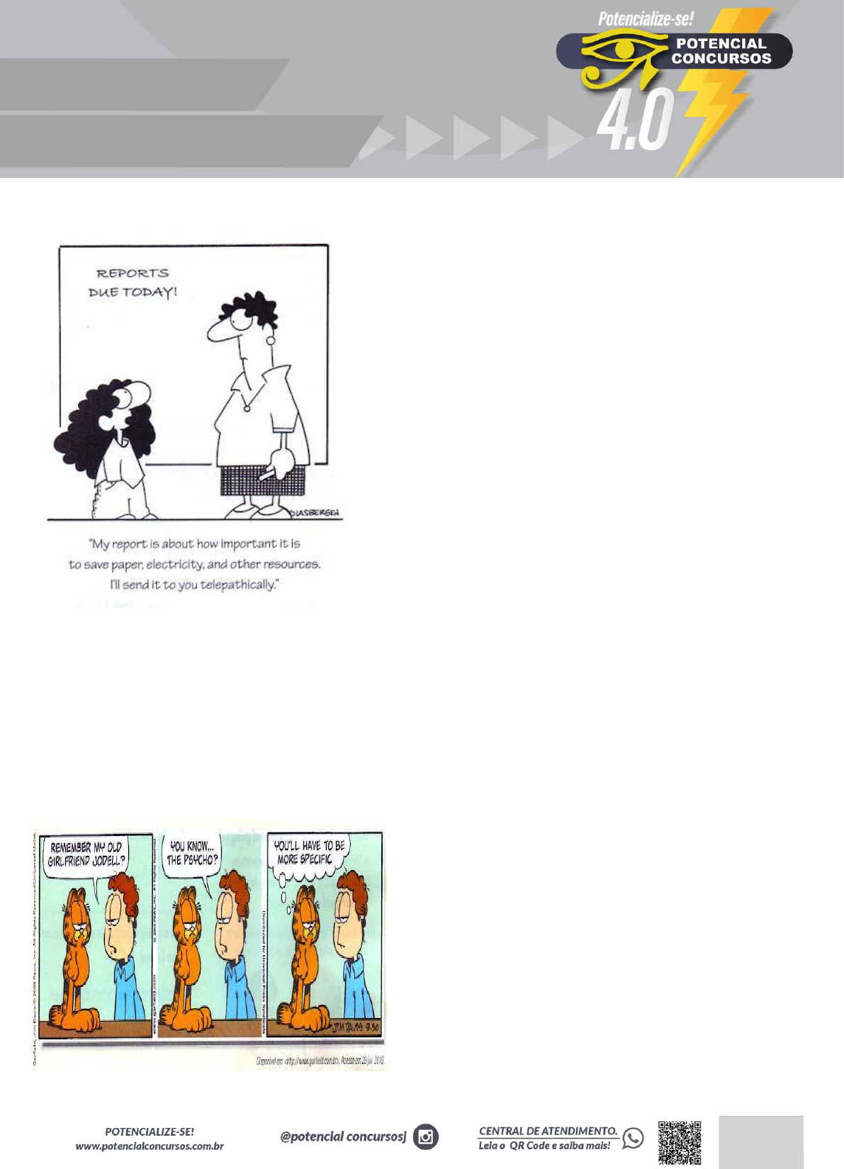 <p>1</p><p>INGLÊS</p><p>PROF:DIÓGENES PONTES</p><p>DATA: 27/08/24</p><p>1.</p><p>Na fase escolar, é prática comum que os professores passem atividades</p><p>extraclasses e marquem uma data para que as mesmas sejam entregues</p><p>para correção. No caso da cena da charge, a professora ouve uma estudante</p><p>apresentando argumentos para:</p><p>a) discutir sobre o conteúdo do seu trabalho já entregue.</p><p>b) elogiar o tema proposto para o relatório solicitado.</p><p>c) sugerir temas para novas pesquisas e relatórios.</p><p>d) reclamar do curto prazo para entrega do trabalho.</p><p>e) convencer de que fez o relatório solicitado.</p><p>2.</p><p>A tira, definida como um segmento de história em quadrinhos, pode</p><p>transmitir uma mensagem com efeito de humor. A presença desse efeito no</p><p>diálogo entre Jon e Garfield acontece porque</p><p>a) Jon pensa que sua ex-namorada é maluca e que Garfield não sabia</p><p>disso.</p><p>b) Jodell é a única namorada maluca que Jon teve, e Garfield acha isso</p><p>estranho.</p><p>c) Garfield tem certeza de que a ex-namorada de Jon é sensata, o maluco é</p><p>o amigo.</p><p>d) Garfield conhece as ex-namoradas de Jon e considera mais de uma como</p><p>maluca.</p><p>e) Jon caracteriza a ex-namorada como maluca e não entende a cara de</p><p>Garfield.</p><p>3.</p><p>THE WEATHER MAN</p><p>They say that the British love talking about the weather. For other</p><p>nationalities, this can be a banal and boring subject of conversation,</p><p>something that people talk about when they have nothing else to say to each</p><p>other. And yet the weather is a very important part of our lives. That at least</p><p>is the opinion of Barry Gromett, press officer for The Met Office. This is</p><p>located in Exeter, a pretty cathedral city in the southwest of England. Here</p><p>employees - and computers - supply weather forecasts for much of the</p><p>world.</p><p>Speak Up. Ano XXIII, nº 275.</p><p>Ao conversar sobre a previsão do tempo, o texto mostra</p><p>a) o aborrecimento do cidadão britânico ao falar sobre banalidades.</p><p>b) a falta de ter o que falar em situações de avaliação de línguas.</p><p>c) a importância de se entender sobre meteorologia para falar inglês.</p><p>d) as diferenças e as particularidades culturais no uso de uma língua.</p><p>e) o conflito entre diferentes ideias e opiniões ao se comunicar em inglês.</p><p>Parenting in the Digital Age: Two Problems with Technology</p><p>Parents can easily become too involved in their kids' lives, or so many</p><p>parents and experts are saying in response to a new wave of digital</p><p>monitoring of student performance, and social media engagement between</p><p>parents and teachers. CNN asks, "Do schools share too much with parents?"</p><p>Some parents love being able to see every assignment their child is</p><p>supposed to complete, what grades are being posted for every element of</p><p>coursework, and what teachers are willing to share about classroom</p><p>activities, using Twitter or Facebook. Parents can be involved in the</p><p>classroom in a way they never have before. What's more, they don't have to</p><p>ask their kids, "So, how was school today?" They already know. This, say</p><p>some experts, increases the anxiety and overall dread kids feel about their</p><p>oppressive school experience: they have no control. They cannot spin the</p><p>message. They know they will catch hell for a grade as soon as they get</p><p>home. Parents have too much control, are hovering too much.</p><p>4. A era digital também traz desvantagens para os alunos. Uma delas,</p><p>apontada no texto acima, está relacionada ao:</p><p>a) cerceamento à privacidade e autonomia dos jovens.</p><p>b) poder exagerado delegado à família.</p><p>c) espaço cada vez maior que a família ocupa na sociedade.</p><p>d) uso indiscriminado de novos aplicativos educacionais.</p><p>2</p><p>VOCÊ APROVADO(A)</p><p>e) compartilhamento de informações com a comunidade escolar.</p><p>Reader Stories: My First Love</p><p>He was 13 and I was 12. We met on Facebook. He asked me out and I said</p><p>yes but I wasn't really up to it. I grew to love him though, and everything felt</p><p>plain perfect. I knew I never wanted to lose him. We broke up and got back</p><p>together a lot... but it never felt like he didn't want me. I fell for his friend. He</p><p>found out and got mad but he said he still loved me. I got over his friend soon</p><p>enough but I found out he was cheating on me. I cried for days and days, but</p><p>I was too much in love to break up with him. He texted me telling me he</p><p>wanted love to break up with him. He texted me telling me he wanted to talk,</p><p>I got scared. He said he was cheating on me and broke up with me. We don't</p><p>talk anymore... but I still love him... I recently found out he likes my ex-friend</p><p>Daniela... I just can't deal with the pain of that... I wish I could be with him</p><p>again.</p><p>Lessons learned:</p><p>* don't fall in love too fast.</p><p>* be careful about when u do fall in love... it could be hard on u if they don't</p><p>like u back or like someone else...</p><p>* love can feel like a dream but that may make it feel fake.</p><p>© 2013 Holly Ashworth (http://teenadvice.about.com/). Used with permission</p><p>of About Inc., which can be found online at www.about.com. All rights</p><p>reserved. Acesso em 25 mar. 2013.</p><p>5. O relato da experiência amorosa da adolescente evidencia:</p><p>a) um ciúme injustificado e exagerado que motivou a separação do casal.</p><p>b) a impossibilidade de encontros reais, quando o começo é via Facebook</p><p>c) uma crise gerada pelo comportamento inadequado de um dos parceiros.</p><p>d) uma dificuldade em aceitar o término do relacionamento pelo outro</p><p>parceiro.</p><p>e) uma necessidade de vingança após conhecimento de uma relação</p><p>anterior.</p><p>6. A jovem autora do texto:</p><p>a) teve dúvidas 