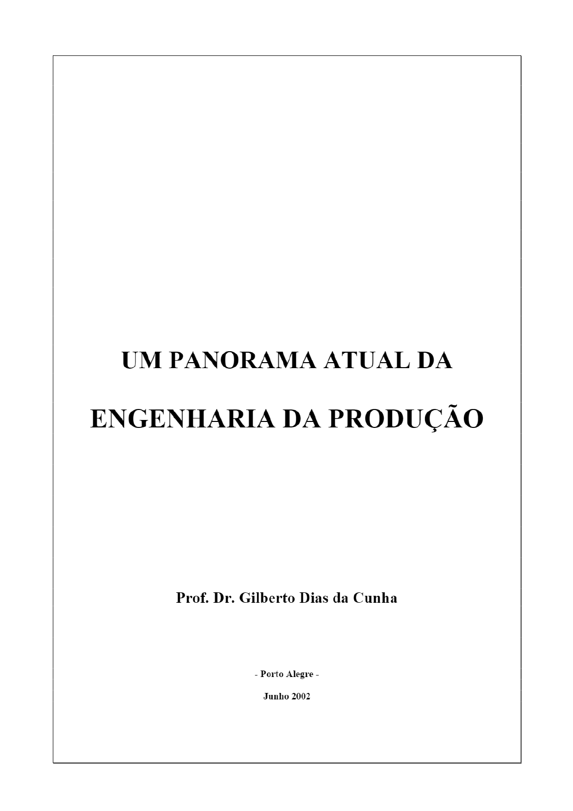 <p>UM PANORAMA ATUAL DA ENGENHARIA DA PRODUÇÃO Prof. Dr. Gilberto Dias da Cunha - Porto Alegre - Junho 2002</p><p>Posicionamento da Engenharia de Produção como área de conhecimento. Este documento foi elaborado de modo a esclarecer, de forma sucinta, na forma de tópicos de interesse específico, algumas questões básicas quanto às funções e ao modo de atuação da Engenharia de Produção (EP), bem como seu enquadramento como curso superior e como profissão, conforme a legislação vigente. primeiro tópico inserido neste documento resume as raízes históricas da área de EP, surgida no decorrer do Século XX como mais um ramo das Ciências da Engenharia, caracterizando seu posicionamento com relação aos ramos clássicos de Engenharia e com relação às Ciências da Administração de Empresas. segundo tópico apresenta as diretrizes curriculares conforme aprovadas no âmbito do Conselho Nacional de Educação (CNE) e também a proposta, anterior a essa aprovação, firmada pela Associação Brasileira de Engenharia de Produção (ABEPRO). Esta entidade congrega hoje praticamente todo o pessoal da área acadêmica ligado à EP, sendo, ainda, um referencial para os profissionais atuantes na área, mesmo fora desse meio. O terceiro tópico resume as formas de inserção da Engenharia de Produção nos cursos de nível superior, abordando o caso do ensino de graduação. quarto tópico apresenta as habilitações previstas pelo Sistema CONFEA-CREA para o engenheiro de produção, conjuntamente com uma análise da consultoria jurídica da ABEPRO. Um Panorama Atual da Engenharia da Produção Junho 2002 2 Prof. Dr. Gilberto Dias da Cunha</p><p>Tópico I: Raízes Históricas da Engenharia da Produção Um Panorama Atual da Engenharia da Produção - Junho 2002 3 Prof. Dr. Gilberto Dias da Cunha</p><p>Breve análise da evolução histórica da organização da empresa industrial. Desde os primórdios da Revolução Industrial, a organização da empresa industrial vem evoluindo na tentativa de obtenção de níveis cada vez maiores de produtividade. Com isso, foram criados técnicas e métodos para operacionalização dos sistemas de produção que foram progressivamente adicionando novos elementos ao foco das atenções no mundo industrial. Esta escalada iniciou-se com o foco no processo de fabricação, pois, num primeiro momento, a principal preocupação residia em serem descobertos meios de produzir os bens que, já então, faziam-se necessários. A partir do advento da mecanização de máquinas, as atenções passaram a também estarem centradas na otimização da organização de pela necessidade de rentabilização dos investimentos efetuados nesse tipo de equipamento. Neste momento, começaram a serem desenvolvidas abordagens relacionadas com a logística de produção, surgindo, então, o Taylorismo, que introduz as preocupações com a otimização do trabalho, e o Fordismo, que introduz a noção de arranjo de máquinas na forma de linha de produção, além da visualização do aproveitamento do mercado consumidor de escala. Este mercado passou, então, progressivamente, a demandar maior qualidade pelos produtos fabricados, o que determinou o surgimento das preocupações no domínio da qualidade, bem como o aperfeiçoamento dos produtos (sistemas técnicos) em termos do cumprimento da sua funcionalidade intrínseca. Essas preocupações vieram a tomar um grande impulso no pós-guerra, determinando a evolução dos meios produtivos de massa e a própria massificação da informação, que culmina com o processo de automatização das máquinas e equipamentos e com a informatização da sociedade. Neste novo cenário, acirra-se progressivamente a competição entre as empresas, determinando, inicialmente, a necessidade de um aumento da percepção das necessidades do cliente como elemento diferencial estratégico. Posteriormente, com o estabelecimento dos mercados interligados em nível global, surge, ainda, a necessidade da elaboração de novas estratégias de negócio (a substituir o simples aperfeiçoamento de produtos). A satisfação do nível de exigência desses novos mercados, porém, somente pode ser obtida com produtos isentos de defeitos de fabricação, caracterizando a world-class manufacturing. A figura 1 apresenta na forma de uma linha de tempo os principais eventos que estiveram na raiz das transformações aqui analisadas. De notar, ainda, que o ensino das Ciências da Engenharia tem vindo a acompanhar a demanda histórica pelos processos industriais. Até o advento da Revolução Industrial, a Engenharia subdividia-se, praticamente, em apenas dois ramos de "especialização": o militar e o civil. A evolução do conhecimento (e, conseqüentemente, do ensino) na área de Engenharia, suscitou a subdivisão noutros ramos, alguns ainda hoje utilizados (ex.: Mecânica, Elétrica, Minas), tendo esta atualização um caráter continuado (ex.: Mecatrônica, Telecomunicações, Alimentos, Produção). Um Panorama Atual da Engenharia da Produção Junho 2002 4 Prof. Dr. Gilberto Dias da Cunha</p><p>Revolução Industrial Informatização Mecanização World-Class Manufacturing II Guerra Mundial Taylorismo Automatização Fordismo Globalização T Processo de Fabricação Logística de Produção Mercado Qualidade Sistemas Técnicos Cliente Negócio Figura 1- - Foco das atenções no mundo industrial: linha de tempo.</p><p>o campo de atuação da Engenharia de Produção. A engenharia de produção desenvolveu-se, ao longo do século XX, em resposta às necessidades de desenvolvimento de métodos e técnicas de gestão dos meios produtivos demandada pela evolução tecnológica e mercadológica caracterizada acima. Enquanto que os ramos tradicionais da Engenharia, cronologicamente seus precedentes, evoluíram na linha do desenvolvimento da concepção, fabricação e manutenção de sistemas técnicos, a Engenharia de Produção veio a concentrar-se no desenv