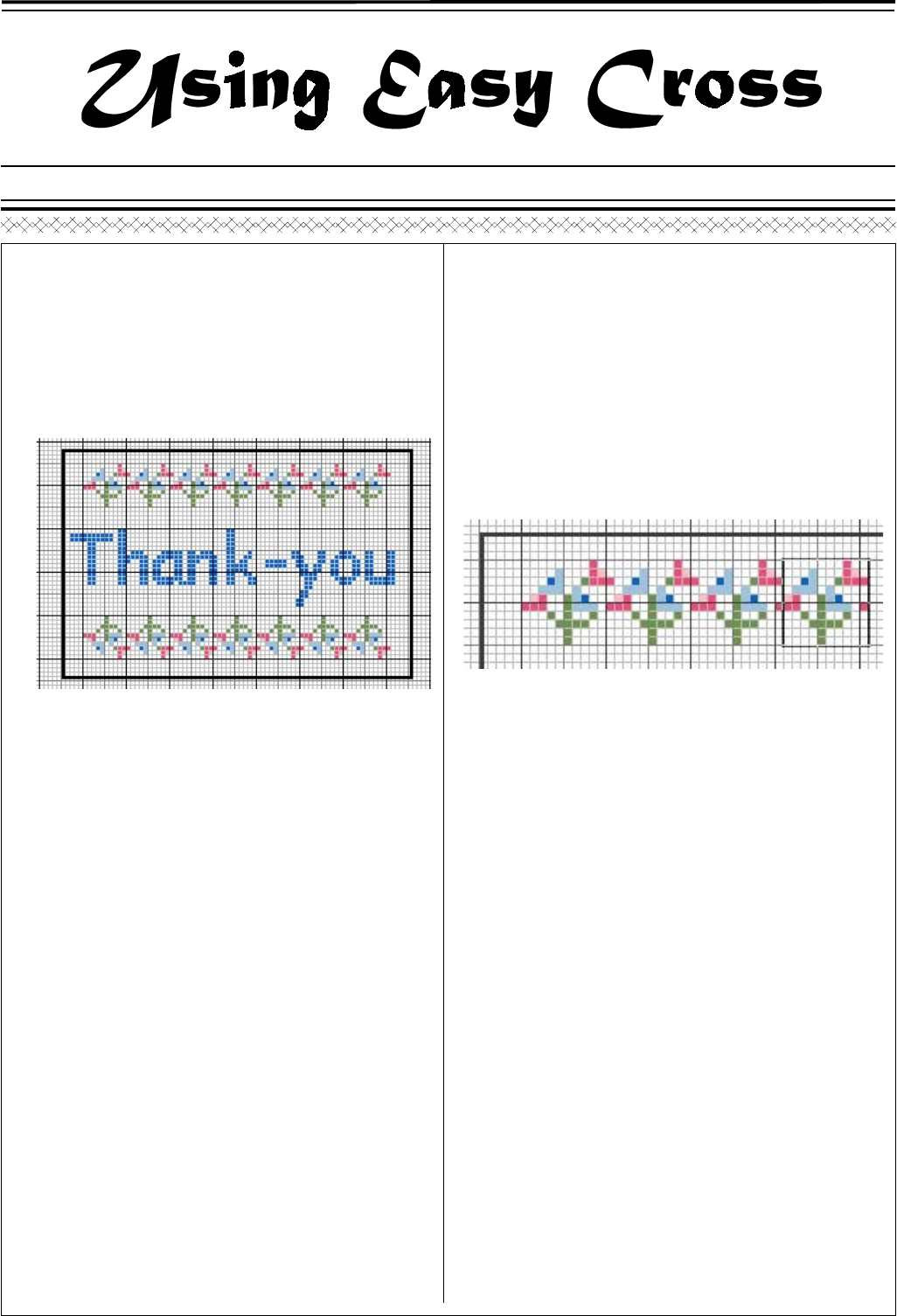 <p>1</p><p>Ideas for using the program</p><p>7. Use the colours to design a small motif that is suitable</p><p>for repetition. Locate your motif in the top left corner of</p><p>the design area. Use the mouse to click on the required</p><p>stitch type from the stitch toolbar. If you make a mistake</p><p>or change your mind, click the right mouse button above</p><p>the stitch you want to remove and it will disappear.</p><p>8. Next click on the Edit menu and then Copy. A cross hair</p><p>will appear beneath the cursor, use this to define the</p><p>rectangular area to be copied. Make the box fit exactly</p><p>round the area then click the mouse. A box will then</p><p>appear beneath your cursor. Place the cursor at the</p><p>required position and click the mouse button. Repeat</p><p>this as often as required then click the right mouse</p><p>button to end the option.</p><p>9. Now Copy the whole row of motifs in the same way but</p><p>when your box is ready to be placed press J on the</p><p>keyboard. This will reflect the whole area horizontally.</p><p>Place the box in a central position at the bottom of the</p><p>design area.</p><p>10. Now select the Text menu then True Type Text. The</p><p>Draw Text dialog will appear in which you should type</p><p>the words “Thank You”, click the mouse on centre justify</p><p>and on straight. Click on Select Font then click on the</p><p>fonts in the list to preview them. Use the arrows to move</p><p>up and down the list. Using a point size of 12 a standard</p><p>size font (e.g. Comic Sans Serif) will fit into the design</p><p>but if you select a bold or an embellished font you may</p><p>need to reduce the point size.</p><p>11. A rectangular box will appear on your design. Decide</p><p>which colour you would like your text and select it on the</p><p>palette, then place the box centrally on the design and</p><p>click the mouse. If your box is too large for the design</p><p>area click the right mouse button to end the option and</p><p>start again.</p><p>12. Finally check the design, you may wish to use the Move</p><p>option in the Edit menu to adjust the position of the</p><p>borders to balance with the text.</p><p>13. When you are satisfied with the result select Save in the</p><p>File menu. You will need to type a file name into the</p><p>dialog then click on Save. Your file will be saved in the</p><p>EasyC directory with the Extension .WXS.</p><p>Remember that each option is explained fully in the manual</p><p>so have it to hand when you begin to experiment with the</p><p>program. The quick reference page lists the hot keys which</p><p>can save you lots of time. Happy Designing!</p><p>Getting Started</p><p>You have purchased an Easy Cross program, installed it,</p><p>skimmed through a bit of the manual and you are now</p><p>ready to attempt your first design. But where do you</p><p>begin? To familiarise you with some of the basic options</p><p>follow the step-by-step instructions below to design a</p><p>simple thank-you card. Always use the left mouse button</p><p>unless otherwise stated.</p><p>1. In the File menu click on New, then Cross Stitch</p><p>Design. A dialog box will appear.</p><p>2. Click on Use Template and then on the arrow next to</p><p>Category. A list of template categories will appear.</p><p>Click on the word Card and you will see a list of</p><p>possible dimensions for your card. Find 6” x 8”</p><p>Horizontal Oblong on the list and click on the</p><p>selection.</p><p>3. You will now see a grid with a black oblong drawn to</p><p>represent the aperture of the card on screen. Click the</p><p>Zoom button and a cross-hair will appear beneath the</p><p>cursor arrow. Place this above the top left-hand corner</p><p>of the black oblong and holding the mouse button</p><p>down drag the cursor to the bottom right corner then</p><p>release the button. The card aperture is now enlarged</p><p>to fill the screen and the grid is a more comfortable</p><p>size to work with.</p><p>4. The default palette may contain a large number of</p><p>colours which you may want to reduce. To alter the</p><p>palette which will be used in the design click on</p><p>Palette then on New. A warning is given, click on Yes</p><p>to continue and the thread chart will appear.</p><p>5. The first thread chart is DMC. Drag the bar below the</p><p>palette to see the whole range of colours. Click on the</p><p>arrows by the chart name to view other available</p><p>charts and click on the chart name to bring it to the</p><p>foreground.</p><p>6. To select colours from a palette either click on each</p><p>colour on the screen and it will be highlighted, or type</p><p>in the chart number with a comma between each</p><p>number. Choose five colours then click on OK.</p><p>2</p><p>Converting Photographs Des</p><p>Have you ever seen a trade advertisement to convert a</p><p>photograph of your house/pet/grandchild into a cross</p><p>stitch chart and wondered if you could achieve a</p><p>professional result yourself. As the owner of Easy Cross,</p><p>Easy Cross de luxe or Easy Cross Enterprise you have</p><p>the software requirements to make your attempt, with</p><p>some extra features to considerably speed up the</p><p>process.</p><p>First Select your Source material: This should be the</p><p>clearest picture of your chosen subject that you can find.</p><p>Photographs can vary enormously in quality and it is</p><p>important to bear in mind that the quality of your</p><p>conversion will depend upon the quality of the original.</p><p>However, if your snapshots aren’t perfect (and who’s are!)</p><p>don’t despair the Adjust Image dialog contains features to</p><p>help reduce glare effects and correct images that are too</p><p>dark or too bright.</p><p>How to get your Photograph into Easy Cross: The</p><p>image can be directly scanned into the program using the</p><p>Acquire option in the Convert menu. If you haven’t got a</p><p>scanner attached to your computer, then previously saved</p