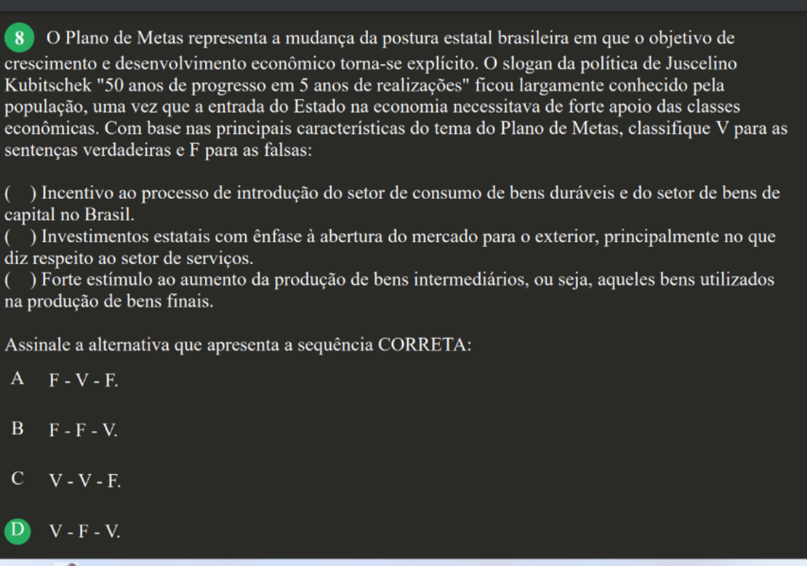 <p>8 O Plano de Metas representa a mudança da postura estatal brasileira em que o objetivo de crescimento e desenvolvimento econômico torna-se explícito. O slogan da política de Juscelino Kubitschek "50 anos de progresso em 5 anos de realizações" ficou largamente conhecido pela população, uma vez que a entrada do Estado na economia necessitava de forte apoio das classes econômicas. Com base nas principais características do tema do Plano de Metas, classifique V para as sentenças verdadeiras e F para as falsas: ( ) Incentivo ao processo de introdução do setor de consumo de bens duráveis e do setor de bens de capital no Brasil. ( ) Investimentos estatais com ênfase à abertura do mercado para o exterior, principalmente no que diz respeito ao setor de serviços. ( ) Forte estímulo ao aumento da produção de bens intermediários, ou seja, aqueles bens utilizados na produção de bens finais. Assinale a alternativa que apresenta a sequência CORRETA: A F - V - F. B C D V F V.</p>