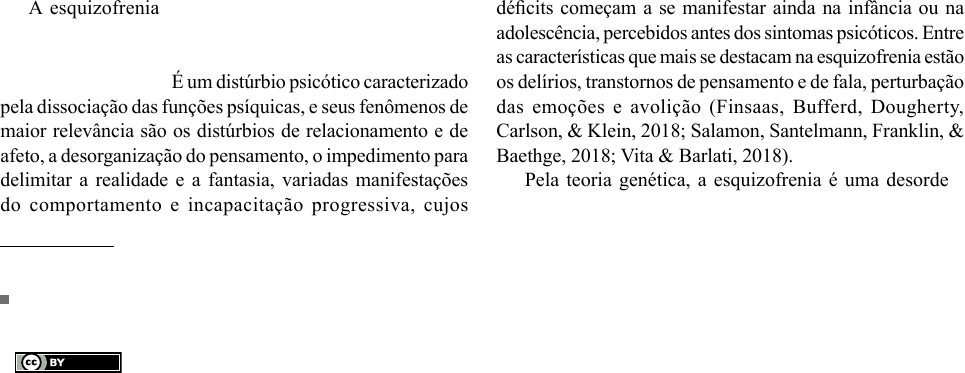 <p>1</p><p>DOI: https://dx.doi.org/10.1590/0102.3772e3521Psicologia: Teoria e Pesquisa</p><p>2019, v.35, e35</p><p>* Apoio: CNPq</p><p>** E-mail: vmmf@unb.br</p><p>Submetido: 06/09/2016; Revisado: 25/10/2016; Aceito: 04/04/2017.</p><p>21</p><p>CiênCias do Comportamento</p><p>A utilização do Método de Rorschach no diagnóstico diferencial</p><p>da Esquizofrenia e Transtorno Dissociativo de Identidade*</p><p>Marcello de Abreu Faria1, Euthymia Brandão de Almeida Prado2, Wânia Cristina de Souza1,</p><p>Vaneila Ferreira Martins3, & Vania Moraes Ferreira1,**</p><p>1 Universidade de Brasília, Brasília, DF, Brasil</p><p>2 Universidade Federal de São Paulo (UNIFESP), São Paulo, SP, Brasil</p><p>3 Universidade Federal de Goiás, Goiânia, GO, Brasil</p><p>RESUMO – o objetivo deste artigo foi investigar a prevalência do Transtorno Dissociativo de Identidade (TDI) em dez</p><p>pacientes diagnosticados com esquizofrenia com característica paranóide, com base no Método de Rorschach. Foram</p><p>registrados indicadores ou sintomas psicológicos que caracterizaram o diagnóstico diferencial desses pacientes, analisadas</p><p>diferenças clínicas específicas e verificado o enquadramento dos dados obtidos, com a aplicação da Técnica de Rorschach.</p><p>Para fins de diagnóstico diferencial, observou-se que dois pacientes apresentaram sintomas diferenciais aos da esquizofrenia,</p><p>sendo que um deles apresentou sintomas dissociativos, não sendo confirmada a prevalência do TDI entre os esquizofrênicos.</p><p>No caso da esquizofrenia e do TDI, devido às características similares que apresentam, avaliações multidisciplinares são</p><p>indicadas para se fazer o diagnóstico diferencial entre eles.</p><p>PALAVRAS-CHAVE: esquizofrenia, transtorno dissociativo de identidade, trauma, rorschach</p><p>Using the Rorschach Method in The Differential Diagnosis</p><p>of Schizophrenia and Dissociative Identity Disorder</p><p>ABSTRACT – The aim of this article was to investigate the prevalence of the Dissociative Identity Disorder (DID) in</p><p>ten patients diagnosed with schizophrenia with paranoid characteristic, based on the Rorschach approach. Psychological</p><p>symptoms that characterize the differential diagnosis of these patients were registered, specific clinical differences</p><p>were analyzed and the framework of the data obtained with the application of the Rorschach approach. For purposes of</p><p>differential diagnosis, it was observed that two patients had differential symptoms to schizophrenia, one of which showed</p><p>dissociative symptoms, not confirmed the prevalence of DID among schizophrenics. In the case of schizophrenia and DID</p><p>due to exhibit similar characteristics, multidisciplinary evaluations are set to make a differential diagnosis between them.</p><p>KEYWORDS: schizophrenia, dissociative identity disorder, trauma, rorschach</p><p>A esquizofrenia é uma síndrome prevalente entre as</p><p>desordens mentais, com status de transtorno psiquiátrico</p><p>desafiador e muito grave (Asher, Fekadu, & Hanlon, 2018;</p><p>Vita & Barlati, 2018). É um distúrbio psicótico caracterizado</p><p>pela dissociação das funções psíquicas, e seus fenômenos de</p><p>maior relevância são os distúrbios de relacionamento e de</p><p>afeto, a desorganização do pensamento, o impedimento para</p><p>delimitar a realidade e a fantasia, variadas manifestações</p><p>do comportamento e incapacitação progressiva, cujos</p><p>déficits começam a se manifestar ainda na infância ou na</p><p>adolescência, percebidos antes dos sintomas psicóticos. Entre</p><p>as características que mais se destacam na esquizofrenia estão</p><p>os delírios, transtornos de pensamento e de fala, perturbação</p><p>das emoções e avolição (Finsaas, Bufferd, Dougherty,</p><p>Carlson, & Klein, 2018; Salamon, Santelmann, Franklin, &</p><p>Baethge, 2018; Vita & Barlati, 2018).</p><p>Pela teoria genética, a esquizofrenia é uma desordem</p><p>hereditária. Entre os sintomas somáticos, sobressaem-se</p><p>https://creativecommons.org/licenses/by/4.0/deed.en</p><p>ospinelli</p><p>Realce</p><p>ospinelli</p><p>Realce</p><p>2 Psic.: Teor. e Pesq., Brasília, 2019, v. 35, e3521</p><p>MA Faria, EBA Prado, WC Souza, VF Martins, VM Ferreira</p><p>os déficits sensoriais adquiridos ao longo da vida, que</p><p>geralmente resultam em percepções distorcidas e geram</p><p>vácuos sensoriais. Pela 5ª edição do Manual Diagnóstico</p><p>Estatístico de Transtornos Mentais (DSM-V; American</p><p>Psychiatric Association [APA], 2014), o espectro da</p><p>esquizofrenia inclui transtornos psicóticos e transtorno da</p><p>personalidade esquizotípica (Cordeiro, Silva, & Vallada,</p><p>2012; Howes, McCutcheon, Owen, & Murray, 2016;</p><p>Kendler, 2016; Ma, Gu, Huo, Li, & Luo, 2018).</p><p>O Transtorno Dissociativo de Identidade (TDI),</p><p>popularmente chamado de “personalidade múltipla”,</p><p>envolve a percepção, um dos elementos essenciais de sua</p><p>análise para indicar a possibilidade do controle racional do</p><p>indivíduo sobre os afetos e as emoções. É caracterizado</p><p>por perspectivas discrepantes de seus subsistemas, como</p><p>partes dissociadas da identidade, personalidades alternativas</p><p>ou estados alterados de consciência, tendo barreiras</p><p>psicobiológicas limitantes. Cada personalidade pode ser</p><p>vivenciada como se tivesse uma história pessoal distinta e</p><p>própria, autoimagem e identidade própria, inclusive nomes</p><p>diferentes; cada uma determina comportamentos, atitudes</p><p>e sentimentos diferentes (Ribáry, Lajtai, Demetrovics, &</p><p>Maraz, 2017; Schimmenti, 2017).</p><p>Como há um fracasso psíquico na integração de</p><p>aspectos da identidade, da memória e da consciência,</p><p>quando o indivíduo expressa uma personalidade, há</p><p>amnésia em relação à outra. Entre os sinais e sintomas, há:</p><p>histórico familiar de transtorn