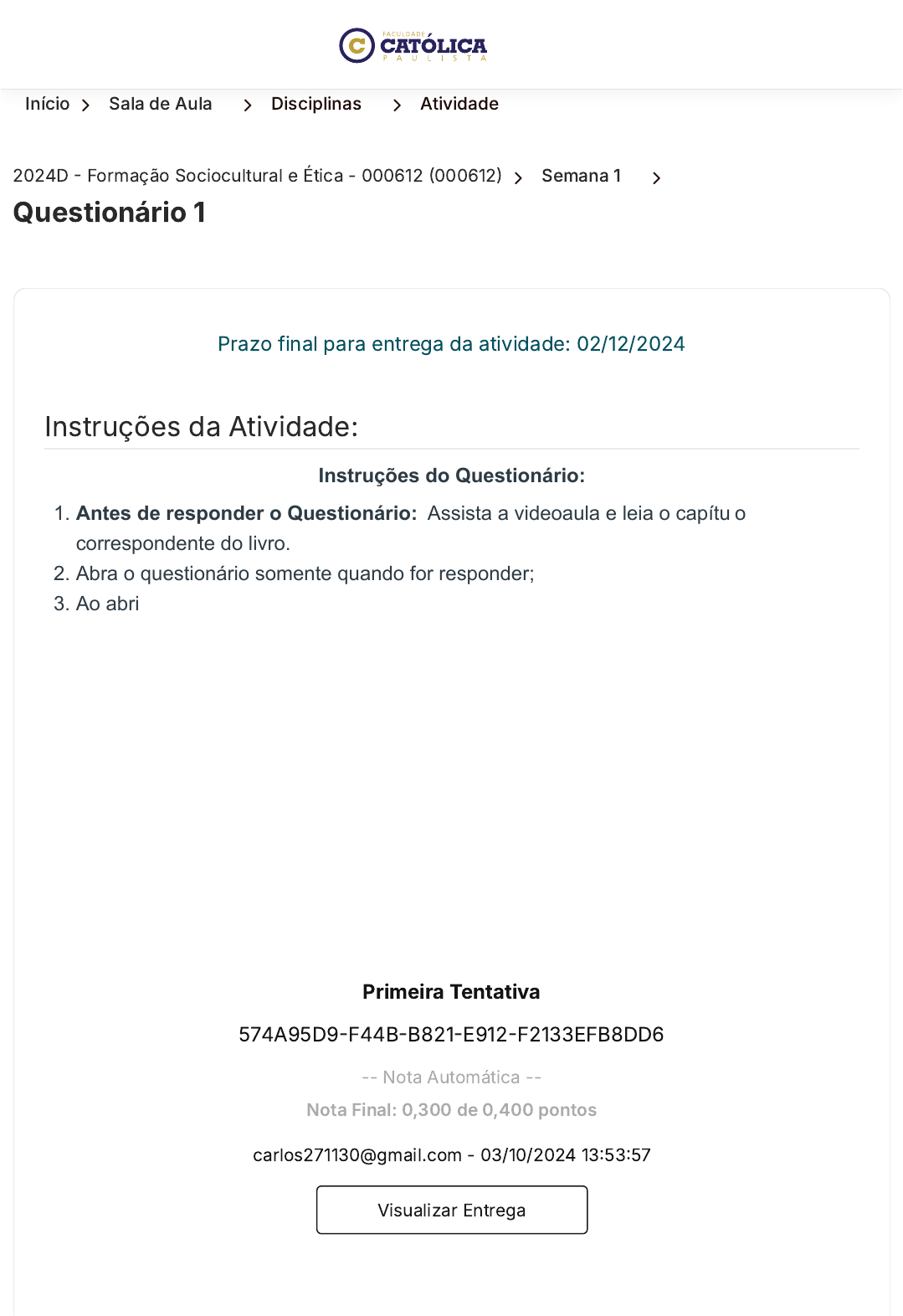 <p>Início 〉 Sala de Aula 〉 Disciplinas 〉 Atividade</p><p>2024D � Formação Sociocultural e Ética - 000612 �000612� 〉 Semana 1 〉</p><p>Questionário 1</p><p>Instruções da Atividade:</p><p>Prazo final para entrega da atividade: 02/12/2024</p><p>Instruções do Questionário:</p><p>1. Antes de responder o Questionário: Assista a videoaula e leia o capítulo</p><p>correspondente do livro.</p><p>2. Abra o questionário somente quando for responder;</p><p>3. Ao abrir o questionário você terá 4 questões para responder;</p><p>4. Leia com calma todas as questões e entenda o que pede a questão: se pede a</p><p>incorreta, a correta e qual o tema da questão;</p><p>5. Lembre-se de Clicar no botão "Enviar";</p><p>6. Você tem duas tentativas para fazer o teste, a segunda tentativa é opcional;</p><p>7. Lembre-se que as respostas mudam de lugar em cada tentativa;</p><p>8. As respostas corretas só aparecem após o envio da segunda tentativa;</p><p>9. O sistema considera a maior nota entre as duas tentativas;</p><p>10. Lembre-se que na segunda tentativa zera TODAS as questões, inclusive as que você</p><p>acertou na primeira tentativa.</p><p>Bons estudos!</p><p>Primeira Tentativa</p><p>574A95D9�F44B�B821�E912�F2133EFB8DD6</p><p>-- Nota Automática --</p><p>Nota Final: 0,300 de 0,400 pontos</p><p>carlos271130@gmail.com - 03/10/2024 13�53�57</p><p>Visualizar Entrega</p><p>03/10/2024, 13:59 AVA - Faculdade Católica Paulista</p><p>https://ava.uca.edu.br/aluno/sala-de-aula/disciplina/modulo/atividade/187939 1/8</p><p>https://ava.uca.edu.br/aluno/sala-de-aula/disciplina/modulo/atividade/187939</p><p>https://ava.uca.edu.br/aluno/sala-de-aula/disciplina/modulo/atividade/187939</p><p>https://ava.uca.edu.br/aluno/sala-de-aula/disciplina</p><p>https://ava.uca.edu.br/aluno/sala-de-aula/disciplina/modulo/atividade/:id/:nome</p><p>javascript:void(0);</p><p>Segunda Tentativa</p><p>71E5AAA4�9F0F�10DD�0B96�F3B48CF809BC</p><p>-- Nota Automática --</p><p>Nota Final: 0,400 de 0,400 pontos</p><p>carlos271130@gmail.com - 03/10/2024 13�59�07</p><p>Visualizar Entrega</p><p>Perguntas</p><p> Pergunta 1.</p><p> Pergunta 2.</p><p> Pergunta 3.</p><p> Pergunta 4.</p><p>pontos: 0,100Pergunta 1.</p><p>A discussão sobre os conceitos de sociedade e cultura e suas relações foi abordada com o</p><p>intuito de apresentar a conformação da perspectiva do termo “sociocultural”. Nesse</p><p>sentido, no que se refere à cultura, foi adotada a Antropologia como campo do</p><p>conhecimento por meio do qual sua definição foi tratada.</p><p>Acerca dessa temática, analise as afirmações a seguir e assinale a alternativa correta:</p><p>Múltipla Escolha:</p><p>A��</p><p>Por ser relacionado a um povo, uma cultura remete exclusivamente ao que lhe é</p><p>intrínseco.</p><p>B��</p><p>03/10/2024, 13:59 AVA - Faculdade Católica Paulista</p><p>https://ava.uca.edu.br/aluno/sala-de-aula/disciplina/modulo/atividade/187939 2/8</p><p>javascript:void(0);</p><p>A cultura brasileira varia conforme aspectos geográficos e perfis de indivíduos e grupos</p><p>sociais.</p><p>C��</p><p>O debate antropológico sobre cultura determina padrões de manifestações entre os</p><p>povos.</p><p>D��</p><p>A cultura de uma sociedade é perene ao longo do tempo, ou seja, mantém-se estática.</p><p>E��</p><p>Os estudos sobre cultura dizem respeito especificamente às práticas artísticas de um</p><p>povo.</p><p>pontos: 0,100Pergunta 2.</p><p>Moral e ética são dois termos que, não raras vezes, são tratados como sinônimos pela</p><p>população em geral, bem como são recorrentes, por exemplo, em discursos políticos e em</p><p>campanhas eleitorais, como remetendo a preceitos adequados para a vida em sociedade.</p><p>Contudo, é preciso considerar que se trata de conceitos diferentes.</p><p>Acerca do conceito de moral, analise as afirmações a seguir e assinale a alternativa correta:</p><p>Múltipla Escolha:</p><p>A��</p><p>Avaliação</p><p>Nota Avaliada:</p><p>Observação:</p><p>0,100 de 0,100</p><p>03/10/2024, 13:59 AVA - Faculdade Católica Paulista</p><p>https://ava.uca.edu.br/aluno/sala-de-aula/disciplina/modulo/atividade/187939 3/8</p><p>javascript:void(0);</p><p>As normas morais existem em decorrência da ética e, nesse sentido, são iguais para</p><p>qualquer sociedade independentemente da época.</p><p>B��</p><p>Ainda que decorra de normas legais e regras, a moral se efetiva conforme a percepção</p><p>dos indivíduos ou coletividade sobre ela.</p><p>C��</p><p>A moral existe independentemente das relações sociais ou da estrutura de sociedades,</p><p>pois remete ao indivíduo em si.</p><p>D��</p><p>A moral diz respeito às regras impostas, baseadas em determinações legais, que</p><p>desconsideram costumes do cotidiano.</p><p>E��</p><p>A efetivação da moral ocorre pela existência de leis, de modo que basta o respeito para</p><p>sua legitimação em uma sociedade.</p><p>pontos: 0,100Pergunta 3.</p><p>A conformação do pensamento sociológico iniciou-se com Auguste Comte, precursor da</p><p>preocupação com a análise do homem em sociedade e suas relações, naquilo que ficou</p><p>conhecido como Física Social. Em seus escritos, o autor descreveu um conjunto de reflexões</p><p>sobre a vida em coletividade, dentre os quais está a perspectiva de estágios de</p><p>desenvolvimento humano.</p><p>Avaliação</p><p>Nota Avaliada:</p><p>Observação:</p><p>0,100 de 0,100</p><p>03/10/2024, 13:59 AVA - Faculdade Católica Paulista</p><p>https://ava.uca.edu.br/aluno/sala-de-aula/disciplina/modulo/atividade/187939 4/8</p><p>javascript:void(0);</p><p>Acerca desses estágios, analise as afirmações a seguir e assinale a alternativa correta:</p><p>Múltipla Escolha:</p><p>A��</p><p>O estágio de abstração se caracterizava pela ausência de preocupação com a</p><p>comprovação de fenômenos sociais.</p><p>B��</p><p>Os estágios de desenvolvime