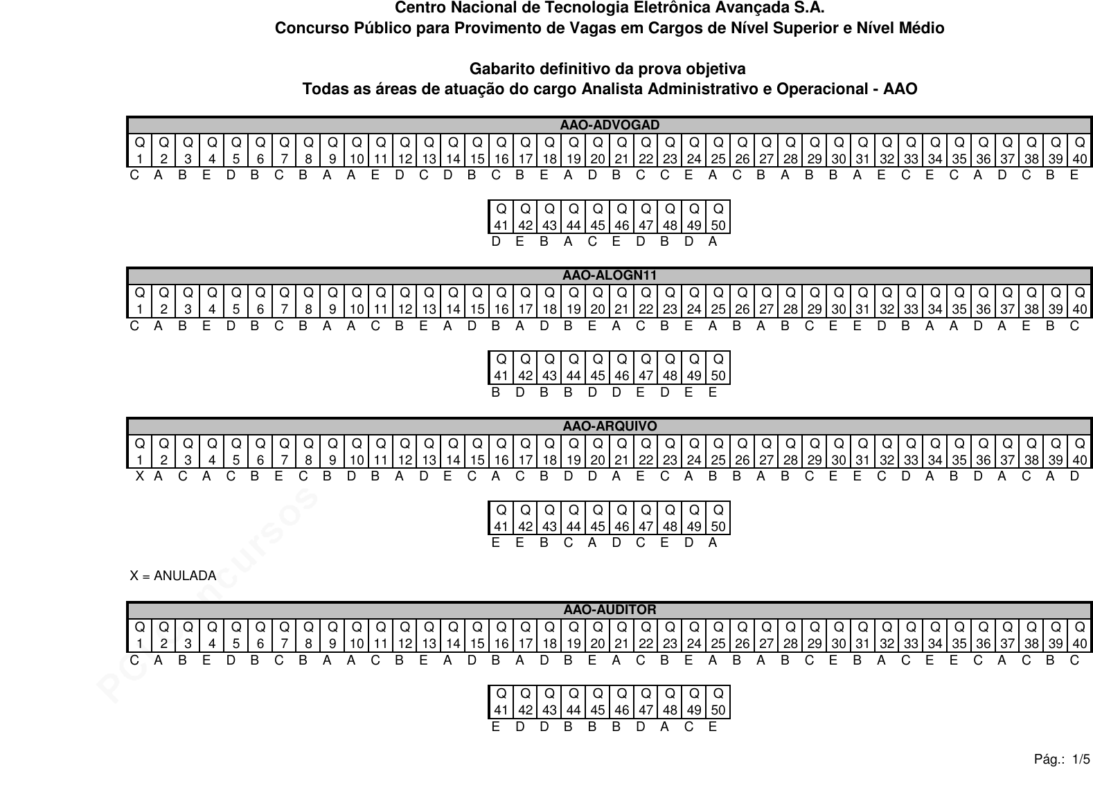 <p>pcimarkpci MjgwNDowMTRjOjAwYTE6ODdkNjoyNTQ1OmY2MmU6MTRmYTo0MDE4:VGh1LCAwMyBPY3QgMjAyNCAxNDoxNjoyOCAtMDMwMA==</p><p>www.pciconcursos.com.br</p><p>Q</p><p>1</p><p>Q</p><p>2</p><p>Q</p><p>3</p><p>Q</p><p>4</p><p>Q</p><p>5</p><p>Q</p><p>6</p><p>Q</p><p>7</p><p>Q</p><p>8</p><p>Q</p><p>9</p><p>Q</p><p>10</p><p>Q</p><p>11</p><p>Q</p><p>12</p><p>Q</p><p>13</p><p>Q</p><p>14</p><p>Q</p><p>15</p><p>Q</p><p>16</p><p>Q</p><p>17</p><p>Q</p><p>18</p><p>Q</p><p>19</p><p>Q</p><p>20</p><p>Q</p><p>21</p><p>Q</p><p>22</p><p>Q</p><p>23</p><p>Q</p><p>24</p><p>Q</p><p>25</p><p>Q</p><p>26</p><p>Q</p><p>27</p><p>Q</p><p>28</p><p>Q</p><p>29</p><p>Q</p><p>30</p><p>Q</p><p>31</p><p>Q</p><p>32</p><p>Q</p><p>33</p><p>Q</p><p>34</p><p>Q</p><p>35</p><p>Q</p><p>36</p><p>Q</p><p>37</p><p>Q</p><p>38</p><p>Q</p><p>39</p><p>Q</p><p>40</p><p>C A B E D B C B A A E D C D B C B E A D B C C E A C B A B B A E C E C A D C B E</p><p>Q</p><p>41</p><p>Q</p><p>42</p><p>Q</p><p>43</p><p>Q</p><p>44</p><p>Q</p><p>45</p><p>Q</p><p>46</p><p>Q</p><p>47</p><p>Q</p><p>48</p><p>Q</p><p>49</p><p>Q</p><p>50</p><p>D E B A C E D B D A</p><p>Q</p><p>1</p><p>Q</p><p>2</p><p>Q</p><p>3</p><p>Q</p><p>4</p><p>Q</p><p>5</p><p>Q</p><p>6</p><p>Q</p><p>7</p><p>Q</p><p>8</p><p>Q</p><p>9</p><p>Q</p><p>10</p><p>Q</p><p>11</p><p>Q</p><p>12</p><p>Q</p><p>13</p><p>Q</p><p>14</p><p>Q</p><p>15</p><p>Q</p><p>16</p><p>Q</p><p>17</p><p>Q</p><p>18</p><p>Q</p><p>19</p><p>Q</p><p>20</p><p>Q</p><p>21</p><p>Q</p><p>22</p><p>Q</p><p>23</p><p>Q</p><p>24</p><p>Q</p><p>25</p><p>Q</p><p>26</p><p>Q</p><p>27</p><p>Q</p><p>28</p><p>Q</p><p>29</p><p>Q</p><p>30</p><p>Q</p><p>31</p><p>Q</p><p>32</p><p>Q</p><p>33</p><p>Q</p><p>34</p><p>Q</p><p>35</p><p>Q</p><p>36</p><p>Q</p><p>37</p><p>Q</p><p>38</p><p>Q</p><p>39</p><p>Q</p><p>40</p><p>C A B E D B C B A A C B E A D B A D B E A C B E A B A B C E E D B A A D A E B C</p><p>Q</p><p>41</p><p>Q</p><p>42</p><p>Q</p><p>43</p><p>Q</p><p>44</p><p>Q</p><p>45</p><p>Q</p><p>46</p><p>Q</p><p>47</p><p>Q</p><p>48</p><p>Q</p><p>49</p><p>Q</p><p>50</p><p>B D B B D D E D E E</p><p>Q</p><p>1</p><p>Q</p><p>2</p><p>Q</p><p>3</p><p>Q</p><p>4</p><p>Q</p><p>5</p><p>Q</p><p>6</p><p>Q</p><p>7</p><p>Q</p><p>8</p><p>Q</p><p>9</p><p>Q</p><p>10</p><p>Q</p><p>11</p><p>Q</p><p>12</p><p>Q</p><p>13</p><p>Q</p><p>14</p><p>Q</p><p>15</p><p>Q</p><p>16</p><p>Q</p><p>17</p><p>Q</p><p>18</p><p>Q</p><p>19</p><p>Q</p><p>20</p><p>Q</p><p>21</p><p>Q</p><p>22</p><p>Q</p><p>23</p><p>Q</p><p>24</p><p>Q</p><p>25</p><p>Q</p><p>26</p><p>Q</p><p>27</p><p>Q</p><p>28</p><p>Q</p><p>29</p><p>Q</p><p>30</p><p>Q</p><p>31</p><p>Q</p><p>32</p><p>Q</p><p>33</p><p>Q</p><p>34</p><p>Q</p><p>35</p><p>Q</p><p>36</p><p>Q</p><p>37</p><p>Q</p><p>38</p><p>Q</p><p>39</p><p>Q</p><p>40</p><p>X A C A C B E C B D B A D E C A C B D D A E C A B B A B C E E C D A B D A C A D</p><p>Q</p><p>41</p><p>Q</p><p>42</p><p>Q</p><p>43</p><p>Q</p><p>44</p><p>Q</p><p>45</p><p>Q</p><p>46</p><p>Q</p><p>47</p><p>Q</p><p>48</p><p>Q</p><p>49</p><p>Q</p><p>50</p><p>E E B C A D C E D A</p><p>X = ANULADA</p><p>Q</p><p>1</p><p>Q</p><p>2</p><p>Q</p><p>3</p><p>Q</p><p>4</p><p>Q</p><p>5</p><p>Q</p><p>6</p><p>Q</p><p>7</p><p>Q</p><p>8</p><p>Q</p><p>9</p><p>Q</p><p>10</p><p>Q</p><p>11</p><p>Q</p><p>12</p><p>Q</p><p>13</p><p>Q</p><p>14</p><p>Q</p><p>15</p><p>Q</p><p>16</p><p>Q</p><p>17</p><p>Q</p><p>18</p><p>Q</p><p>19</p><p>Q</p><p>20</p><p>Q</p><p>21</p><p>Q</p><p>22</p><p>Q</p><p>23</p><p>Q</p><p>24</p><p>Q</p><p>25</p><p>Q</p><p>26</p><p>Q</p><p>27</p><p>Q</p><p>28</p><p>Q</p><p>29</p><p>Q</p><p>30</p><p>Q</p><p>31</p><p>Q</p><p>32</p><p>Q</p><p>33</p><p>Q</p><p>34</p><p>Q</p><p>35</p><p>Q</p><p>36</p><p>Q</p><p>37</p><p>Q</p><p>38</p><p>Q</p><p>39</p><p>Q</p><p>40</p><p>C A B E D B C B A A C B E A D B A D B E A C B E A B A B C E B A C E E C A C B C</p><p>Q</p><p>41</p><p>Q</p><p>42</p><p>Q</p><p>43</p><p>Q</p><p>44</p><p>Q</p><p>45</p><p>Q</p><p>46</p><p>Q</p><p>47</p><p>Q</p><p>48</p><p>Q</p><p>49</p><p>Q</p><p>50</p><p>E D D B B B D A C E</p><p>AAO-AUDITOR</p><p>Todas as áreas de atuação do cargo Analista Administrativo e Operacional - AAO</p><p>AAO-ADVOGAD</p><p>AAO-ALOGN11</p><p>AAO-ARQUIVO</p><p>Centro Nacional de Tecnologia Eletrônica Avançada S.A.</p><p>Concurso Público para Provimento de Vagas em Cargos de Nível Superior e Nível Médio</p><p>Gabarito definitivo da prova objetiva</p><p>Pág.: 1/5</p><p>pcimarkpci MjgwNDowMTRjOjAwYTE6ODdkNjoyNTQ1OmY2MmU6MTRmYTo0MDE4:VGh1LCAwMyBPY3QgMjAyNCAxNDoxNjoyOCAtMDMwMA==</p><p>www.pciconcursos.com.br</p><p>Todas as áreas de atuação do cargo Analista Administrativo e Operacional - AAO</p><p>Centro Nacional de Tecnologia Eletrônica Avançada S.A.</p><p>Concurso Público para Provimento de Vagas em Cargos de Nível Superior e Nível Médio</p><p>Gabarito definitivo da prova objetiva</p><p>Q</p><p>1</p><p>Q</p><p>2</p><p>Q</p><p>3</p><p>Q</p><p>4</p><p>Q</p><p>5</p><p>Q</p><p>6</p><p>Q</p><p>7</p><p>Q</p><p>8</p><p>Q</p><p>9</p><p>Q</p><p>10</p><p>Q</p><p>11</p><p>Q</p><p>12</p><p>Q</p><p>13</p><p>Q</p><p>14</p><p>Q</p><p>15</p><p>Q</p><p>16</p><p>Q</p><p>17</p><p>Q</p><p>18</p><p>Q</p><p>19</p><p>Q</p><p>20</p><p>Q</p><p>21</p><p>Q</p><p>22</p><p>Q</p><p>23</p><p>Q</p><p>24</p><p>Q</p><p>25</p><p>Q</p><p>26</p><p>Q</p><p>27</p><p>Q</p><p>28</p><p>Q</p><p>29</p><p>Q</p><p>30</p><p>Q</p><p>31</p><p>Q</p><p>32</p><p>Q</p><p>33</p><p>Q</p><p>34</p><p>Q</p><p>35</p><p>Q</p><p>36</p><p>Q</p><p>37</p><p>Q</p><p>38</p><p>Q</p><p>39</p><p>Q</p><p>40</p><p>X A C A C B E C B D B A D E C A C B D D A E C A B B A B C E A D C B C D E A A D</p><p>Q</p><p>41</p><p>Q</p><p>42</p><p>Q</p><p>43</p><p>Q</p><p>44</p><p>Q</p><p>45</p><p>Q</p><p>46</p><p>Q</p><p>47</p><p>Q</p><p>48</p><p>Q</p><p>49</p><p>Q</p><p>50</p><p>C B D A D C D A B E</p><p>X = ANULADA</p><p>Q</p><p>1</p><p>Q</p><p>2</p><p>Q</p><p>3</p><p>Q</p><p>4</p><p>Q</p><p>5</p><p>Q</p><p>6</p><p>Q</p><p>7</p><p>Q</p><p>8</p><p>Q</p><p>9</p><p>Q</p><p>10</p><p>Q</p><p>11</p><p>Q</p><p>12</p><p>Q</p><p>13</p><p>Q</p><p>14</p><p>Q</p><p>15
