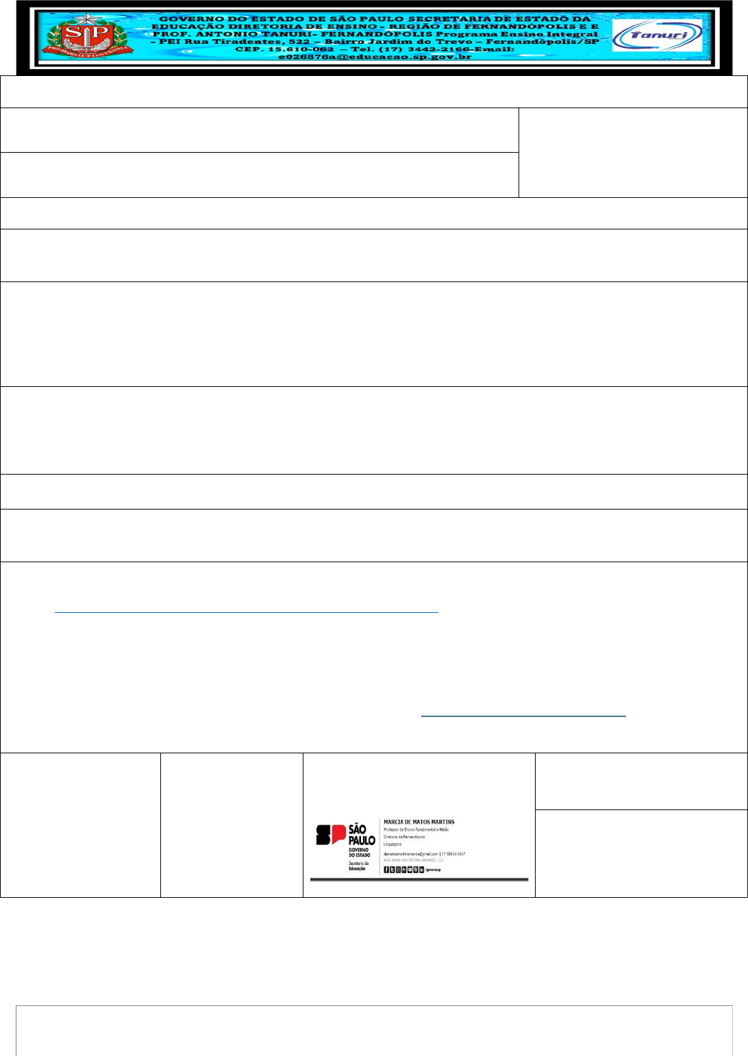 <p>PLANO DE AULA</p><p>1. PROFESSOR: Marcia de Matos Martins</p><p>3. ANO/SÉRIE/TURMA: 6ºA</p><p>2. COMPONENTE CURRICULAR: Língua Portuguesa</p><p>4. OBJETOS DO CONHECIMENTO: Leitura; oralidade; produção de texto.</p><p>5. OBJETIVOS: Relacionar o gênero textual peça teatral a outra forma de manifestação artístico-literária; inferir os efeitos de sentido produzidos a partir de diferentes recursos linguístico-discursivos presentes nas peças teatrais; realizar a redação da Plataforma Sala do Futuro; leitura na Plataforma Leia -SP.</p><p>6. COMPETÊNCIAS E HABILIDADES: Habilidade: (EF06LP12) Utilizar, ao produzir textos em diferentes gêneros, recursos de coesão referencial (nomes e pronomes), recursos semânticos de sinonímia, antonímia e homonímia e mecanismos de representação de diferentes vozes (discurso direto e indireto); (EF06LP12) Utilizar ao produzir textos, em diferentes gêneros, recursos de coesão referencial (nomes e pronomes), recursos semânticos de sinonímia, antonímia e homonímia e mecanismos de representação de diferentes vozes (discurso direto e indireto).</p><p>7. DESENVOLVIMENTO E ESTRATÉGIAS: Levantamento de conhecimentos prévios; slides do CMSP; leitura e análise de texto; leitura compartilhada; pesquisa relacionada ao gênero; discussão/resolução de problemas; vídeos complementares; resolução de exercícios; produção escrita na Sala do Futuro; interação nas atividades; participação nas atividades colaborativas; socialização das atividades; leitura na plataforma Leia-SP.</p><p>8. RECURSOS: Materiais de papelaria e recursos audiovisuais.</p><p>9. AVALIAÇÃO E RECUPERAÇÃO: A avaliação acontecerá de forma contínua, iniciada nas perguntas orais diagnósticas no início das aulas; participação ativa durante as aulas; respostas pertinentes às questões propostas; participação e resolução de exercícios e problemas sugeridos; avaliação das produções escritas.</p><p>10. REFERÊNCIAS:</p><p>CMSP. Repositório. (Material Digital). Secretaria da Educação do Estado de São Paulo – SEE Disponível em: . Acesso em 30/09/2024.</p><p>SEE/SP. Secretaria da Educação do Estado de São Paulo. Currículo em Ação. Caderno do professor. Linguagens. (Língua Portuguesa). Ensino Fundamental Anos Finais. 6° ano. 2° Semestre. vol. 1. São Paulo: IMESP, 2024.</p><p>SECRETARIA ESCOLAR DIGITAL. Disponível em: . Acesso em 30/09/2024.</p><p>11. Nº DE AULAS PREVISTAS: 12</p><p>12. PERÍODO DE REALIZACAO: 07/10 a 18/10</p><p>13. ASSINATURA</p><p>DO PROFESSOR:</p><p>14. VALIDADO EM:</p><p>1.</p><p>2.</p><p>3.</p><p>15. ASSISNATURA CGPAC:</p><p>image1.jpeg</p><p>image2.png</p><p>image3.png</p>
