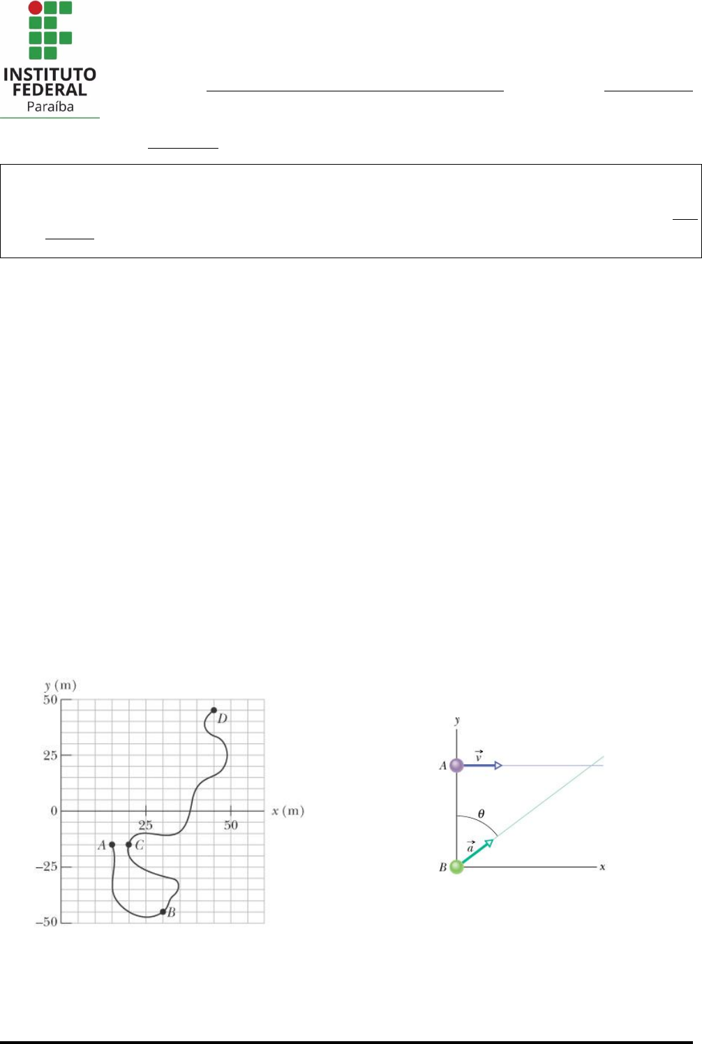 <p>INSTITUTO FEDERAL DE EDUCAÇÃO, CIÊNCIA E TECNOLOGIA DA</p><p>PARAÍBA – Campus João Pessoa</p><p>Disciplina: F́ısica Geral I (Engenharias)</p><p>Prof.: Carlos Alberto / Dhiego Veloso / Ivaldy Barreto</p><p>Aluno(a): Matŕıcula:</p><p>Lista 02: Movimento em Duas e Três Dimensões</p><p>Os problemas elencados abaixo foram retirados do seguinte livro:</p><p>• Halliday, D.; Resnick, R.; Walker, J.; Fundamentos de F́ısica, volume 1: Mecânica. 10a</p><p>Edição. Rio de Janeiro: LTC, 2016.</p><p>Problema 1. Um avião voa 483 km para leste,</p><p>da cidade A para a cidade B, em 45,0 min, e</p><p>depois 966 km para o sul, da cidade B para a</p><p>cidade C, em 1,50 h. Determine, para a viagem</p><p>inteira, (a) o módulo e (b) a direção do deslo-</p><p>camento do avião, (c) o módulo e (d) a direção</p><p>da velocidade média e (e) a velocidade escalar</p><p>média.</p><p>Problema 2. A figura abaixo mostra os movi-</p><p>mentos de um esquilo em um terreno plano, do</p><p>ponto A (no instante t = 0) para os pontos B</p><p>(em t = 5,00 min), C (em t = 10,0 min) e, fi-</p><p>nalmente, D (em t = 15,0 min). Considere as</p><p>velocidades médias do esquilo do ponto A para</p><p>cada um dos outros três pontos. Entre essas ve-</p><p>locidades médias determine (a) o módulo e (b)</p><p>o ângulo da que possui o menor módulo e (c)</p><p>o módulo e (d) o ângulo da que possui o maior</p><p>módulo.</p><p>Problema 3. A velocidade de uma part́ıcula</p><p>que se move no plano xy é dada por ~v = (6, 0t−</p><p>4, 0t2)̂i+ 8, 00ĵ, com ~v em metros por segundo e</p><p>t(> 0) em segundos. (a) Qual é a aceleração no</p><p>instante t = 3,0 s? (b) Em que instante (se isso</p><p>é posśıvel) a aceleração é nula? (c) Em que ins-</p><p>tante (se isso é posśıvel) a velocidade é nula? (d)</p><p>Em que instante (se isso é posśıvel) a velocidade</p><p>escalar da part́ıcula é igual a 10 m/s?</p><p>Problema 4. Um vento moderado acelera</p><p>um seixo sobre um plano horizontal xy com</p><p>uma aceleração constante ~a = (5, 00 m/s2)̂i +</p><p>(7, 00 m/s2)ĵ. No instante t = 0, a velocidade</p><p>é (4, 00 m/s)̂i. Quais são (a) o módulo e (b) o</p><p>ângulo da velocidade do seixo após ter se deslo-</p><p>cado 12,0 m paralelamente ao eixo x?</p><p>Problema 5. Na figura abaixo, a part́ıcula A se</p><p>move ao longo da reta y = 30 m com uma veloci-</p><p>dade constante ~v de módulo 3,0 m/s, paralela ao</p><p>eixo x. No instante em que a part́ıcula A passa</p><p>pelo eixo y, a part́ıcula B deixa a origem com</p><p>velocidade inicial zero e aceleração constante ~a</p><p>de módulo 0,40 m/s2. Para que valor do ângulo</p><p>θ entre ~a e o semieixo y positivo acontece uma</p><p>colisão?</p><p>Problema 6. Na figura abaixo, uma pedra é</p><p>lançada para o alto de um rochedo de altura h</p><p>com uma velocidade inicial de 42,0 m/s e um</p><p>ângulo θ0 = 60,0◦ com a horizontal. A pedra cai</p><p>em um ponto A, 5,50 s após o lançamento. De-</p><p>termine (a) a altura h do rochedo, (b) a veloci-</p><p>dade da pedra imediatamente antes do impacto</p><p>Profo Carlos Alberto 1 http://www.fisicacomcarlos.blogspot.com</p><p>http://www.fisicacomcarlos.blogspot.com</p><p>em A e (c) a altura máxima H alcançada acima</p><p>do solo.</p><p>Problema 7. Um avião está mergulhando com</p><p>um ângulo θ = 30,0◦ abaixo da horizontal, a</p><p>uma velocidade de 290,0 km/h, quando o piloto</p><p>libera um chamariz (figura abaixo). A distância</p><p>horizontal entre o ponto de lançamento e o ponto</p><p>no qual o chamariz se choca com o solo é d = 700</p><p>m. (a) Quanto tempo o chamariz passou no ar?</p><p>(b) De que altura foi lançado?</p><p>Problema 8. Você lança uma bola em direção</p><p>a uma parede com uma velocidade de 25,0 m/s</p><p>e um ângulo θ0 = 40,0◦ acima da horizontal (fi-</p><p>gura abaixo). A parede está a uma distância</p><p>d = 22,0 m do ponto de lançamento da bola. (a)</p><p>A que distância acima do ponto de lançamento</p><p>a bola atinge a parede? Quais são as componen-</p><p>tes (b) horizontal e (c) vertical da velocidade da</p><p>bola ao atingir a parede? (d) Ao atingir a pa-</p><p>rede, a bola já passou pelo ponto mais alto da</p><p>trajetória?</p><p>Problema 9. Uma bola de golfe recebe uma ta-</p><p>cada no solo. A velocidade da bola em função</p><p>do tempo é mostrada na figura abaixo, em que</p><p>t = 0 é o instante em que a bola foi golpeada.</p><p>(a) Que distância horizontal a bola de golfe per-</p><p>corre antes de tocar novamente o solo? (b) Qual</p><p>é a altura máxima atingida pela bola?</p><p>Problema 10. Uma bola é lançada do solo em</p><p>direção a uma parede que está a uma distância</p><p>x (Fig.(a)). A Fig.(b) mostra a componente vy</p><p>da velocidade da bola no instante em que ela al-</p><p>cança a parede em função da distância x. Qual</p><p>é o ângulo do lançamento?</p><p>Problema 11. Duas rodovias se cruzam, como</p><p>mostra a figura abaixo. No instante indicado,</p><p>um carro de poĺıcia P está a uma distância</p><p>dP = 800 m do cruzamento, movendo-se a uma</p><p>velocidade escalar vP = 80 km/h. O motorista</p><p>M está a uma distância dM = 600 m do cru-</p><p>zamento, movendo-se a uma velocidade escalar</p><p>vM = 60 km/h. (a) Qual é a velocidade do mo-</p><p>torista em relação ao carro da poĺıcia na notação</p><p>dos vetores unitários? (b) No instante mostrado</p><p>na figura, qual é o ângulo entre a velocidade</p><p>calculada no item (a) e a reta que liga os dois</p><p>carros? (c) Se os carros mantêm a velocidade,</p><p>as respostas dos itens (a) e (b) mudam quando</p><p>os carros se aproximam da interseção?</p><p>Profo Carlos Alberto 2 http://www.fisicacomcarlos.blogspot.com</p><p>http://www.fisicacomcarlos.blogspot.com</p>