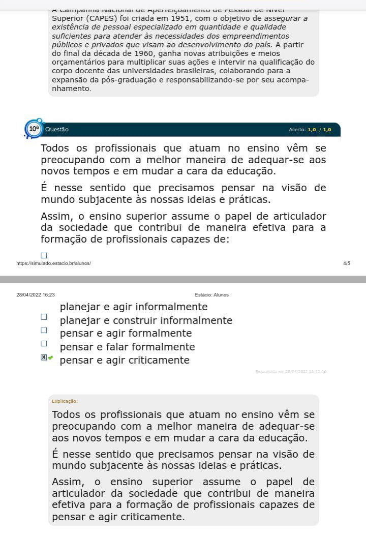 <p>M National ressual Superior (CAPES) foi criada em 1951, com objetivo de a existência de pessoal especializado em quantidade e qualidade suficientes para atender às necessidades dos públicos e privados que visam ao desenvolvimento do país. A partir do final da década de 1960, ganha novas atribuições e meios orçamentários para multiplicar suas ações e intervir na qualificação do corpo docente das universidades brasileiras, colaborando para a expansão da pós-graduação e responsabilizando-se por seu acompa- nhamento. Questão Acerto: 1,0 / 1,0 Todos os profissionais que atuam no ensino vêm se preocupando com a melhor maneira de adequar-se aos novos tempos e em mudar a cara da educação. É nesse sentido que precisamos pensar na visão de mundo subjacente às nossas ideias e práticas. Assim, o ensino superior assume o papel de articulador da sociedade que contribui de maneira efetiva para a formação de profissionais capazes de: 4/5 28/04/2022 16:23 Estácio: Alunos planejar e agir informalmente planejar e construir informalmente pensar e agir formalmente pensar e falar formalmente pensar e agir criticamente em 10 Explicação: Todos os profissionais que atuam no ensino vêm se preocupando com a melhor maneira de adequar-se aos novos tempos e em mudar a cara da educação. É nesse sentido que precisamos pensar na visão de mundo subjacente às nossas ideias e práticas. Assim, o ensino superior assume o papel de articulador da sociedade que contribui de maneira efetiva para a formação de profissionais capazes de pensar e agir criticamente.</p><p>Prezado (a) Aluno(a), Você fará agora seu TESTE DE CONHECIMENTO! Lembre-se que este é opcional, mas não valerá ponto para sua mesmo será composto de questões de múltipla escolha. Após responde cada questão, você terá acesso ao gabarito comentado e/ou à explicação da mesma. para se familiarizar com este modelo de questões que será usado na sua AV e Saiba mais 1. As grandes áreas que completam a Metodologia são: Metodologia Aplicada e Antropologia Epistemologia e Metodologia Aplicada Antropologia e Epistemologia Metodologia Teórica e Metodologia Aplicada Antropologia e Metodologia Explicação: A Metodologia emprega a Epistemologia na sua fundamentação estabelecendo procedimentos de validação do conhecimento, enquanto a Metodologia Aplicada estabelece procedimentos de ordem técnica que são empregados em cada área do Saiba mais 2. A da disciplina Metodologia marque a alternativa INCORRETA Considera que Método da em sua forma geral, pode ser considerado A Metodologia teve sua origem nas diferentes formas de pensar sobre mundo e a existência do homem apresentadas por renomados, como Refere-se ao estudo das características dos métodos empregados nas diferentes Assegura a existência de etapas comuns a todos esses Assegura a existência de etapas comuns a todos 05 métodos empregados nas diferentes Em virtude de 05 procedimentos metodológicos de uma área da para outra, diferenciados por seus diferentes objetos de estudo, toma-se a adoção da de que Método da em sua forma geral, pode ser considerado Gabarito Gabarito Gabarito 1/4 24/02/2021 Estácio: Alunos Comentado Comentado Comentado Saiba mais 3. Sabemos que busca respostas acerca da realidade refletida pelo indivíduo que especula sobre ela, ajuda o homem a entender sua realidade, a questioná-la e a questionar-se também. a buscar respostas para o que deseja conhecer melhor. Exemplo: o estudo sobre a origem do ser. Quem é o ser? que é felicidade? que é ética?</p><p>Questão Acerto: 1,0 / 1,0 No exemplo: Perelman e Olbrechts-Tyteca (2000, p. 59) afirmam que: "A argumentação é uma ação que tende sempre a modificar um estado de coisas preexistente.", identificamos, Citação indireta longa com dois autores e sistema de chamada autor-data Citação indireta e sistema de chamada numérica Citação direta breve com dois autores e sistema de chamada autor-data Citação direta breve com dois autores e sistema de chamada numérica Citação direta longa com dois autores e sistema de chamada autor-data Respondido em 21/09/2021 11:27:29 Explicação: Citação de dois autores Citam-se obrigatoriamente ambos, interligados pela conjunção "e". Embora o método Kaiser seja pouco conhecido e utilizado, ele foi discutido há, aproximadamente, 25 anos e DREYFEIS, 1972). 3/5 28/09/2021 22:12 Estácio: Alunos Gabarito Gabarito Gabarito Comentado Comentado Comentado Questão Acerto: 1,0 / 1,0 As referências em meios eletrônicos seguem o modelo de referências bibliográficas, acrescentando-se informações relativas à descrição física do meio ou suporte. Para as obras consultadas online são essenciais as informações sobre o endereço eletrônico, apresentado entre os sinais , precedido da expressão: Brackets em Acesso em Referências em Disponível em Endereço eletrônico Respondido</p><p>Questão Acerto: Quando estudamos a Metodologia aplicada à pesquisa nos damos conta de quanto se faz necessário aprimorarmos esses nossos estudos, como base para uma melhor elaboração de textos Logo, assinale dentre as alternativas a seguir, aquela que melhor demonstra qual é o propósito de um texto científico? organizar os estudos sobre determinada ótica em relação aos conhecimentos específicos estabelecidos pelo pesquisador. comunicar os resultados e as ideias a que se chegou, após uma determinada coleta e análise dos seus referidos responder as indagações de todos os pesquisadores em relação a determinada situação-problema com base na controlar as diversas variáveis demonstradas dentro das pesquisas realizadas pela análise estatistica dos referidos estabelecer quais os critérios deverão ser usados para a análise dos referidos dados de uma pesquisa Gabarito Gabarito Gabarito Comentado Comentado Comentado Questão Acerto: Com relação às normas da ABNT para elaboração de referências tratando de diferentes meios de publicaçã