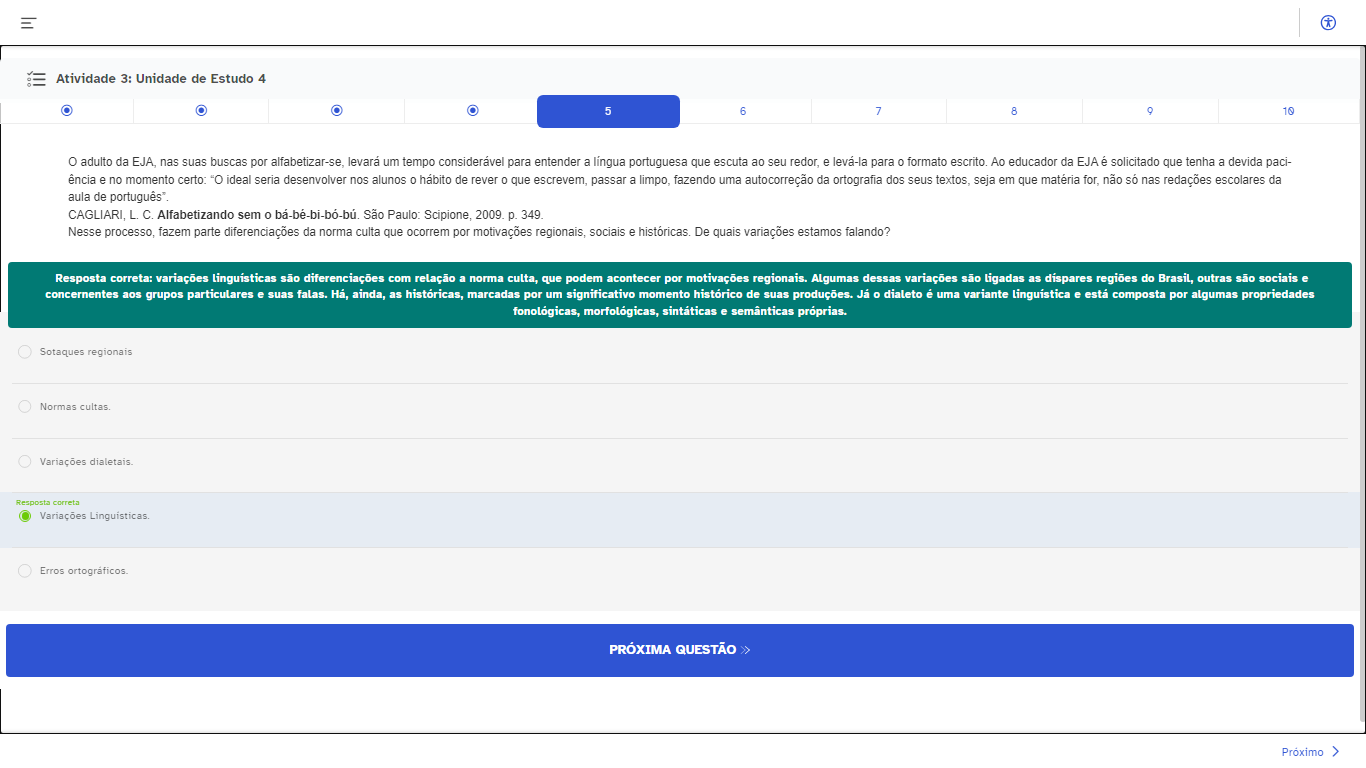 <p>* Atividade 3: Unidade de Estudo 4 5 6 7 8 Q 10 adulto da nas suas buscas por levará um tempo considerável para entender a portuguesa que escuta ao seu e levá-la para 0 formato Ao educador da EJA é solicitado que tenha a devida paci- ência e no momento certo: "O ideal seria desenvolver nos alunos 0 hábito de rever 0 que passar a fazendo uma autocorreção da ortografia dos seus textos, seja em que não nas redações escolares da aula de CAGLIARI, L.C. Alfabetizando sem São Paulo: Scipione, 2009. p. Nesse processo, fazem parte diferenciações da norma culta que ocorrem por motivações regionais, sociais e De quais variações estamos falando? Resposta correta: variações são diferenciações com relação a norma culta, que podem acontecer por motivações regionais. Algumas dessas variações são ligadas as dispares regiões do Brasil, outras são sociais concernentes aos grupos particulares e suas falas. ainda, as históricas, marcadas por um significativo momento histórico de suas produções. Já dialeto é uma variante e está composta por algumas propriedades fonológicas, morfológicas, sintáticas e semânticas próprias. Sotaques regionais Normas Variações Resposta correta Variações Erros PRÓXIMA QUESTÃO ></p>
