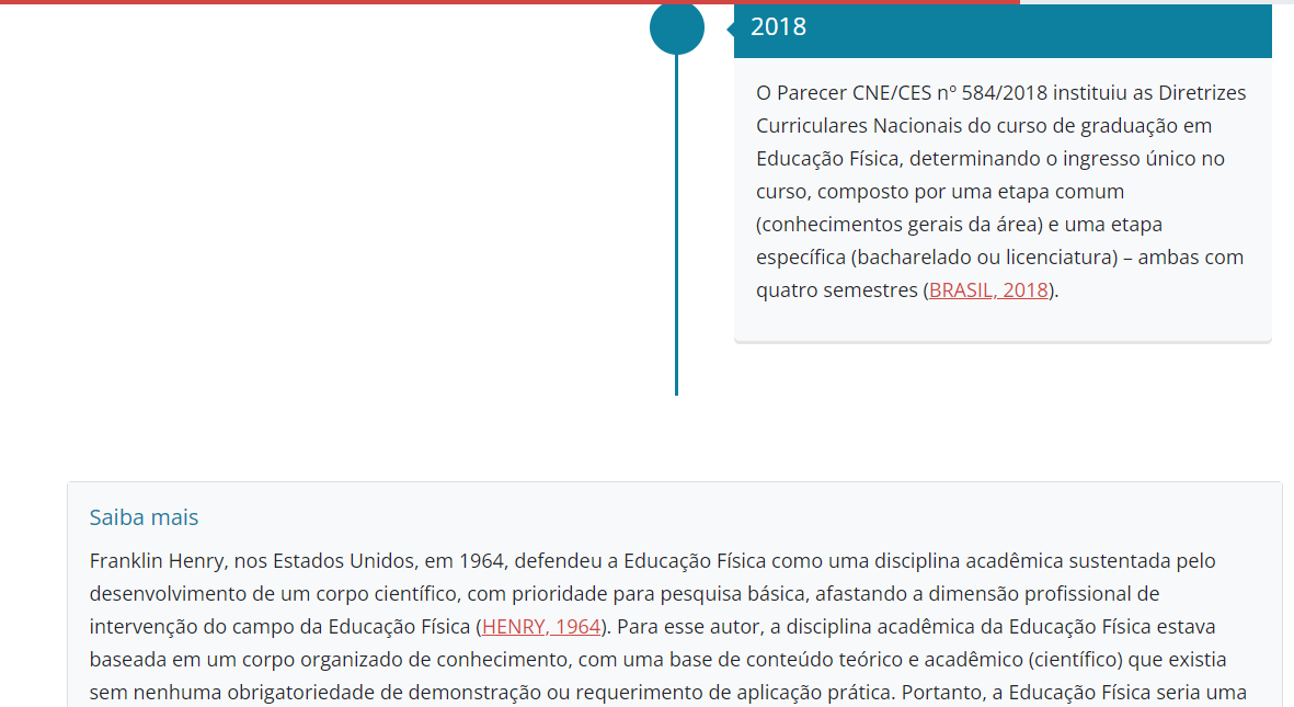 <p>2018 o Parecer CNE/CES 584/2018 instituiu as Diretrizes Curriculares Nacionais do curso de graduação em Educação Física, determinando o ingresso único no curso, composto por uma etapa comum (conhecimentos gerais da área) e uma etapa específica (bacharelado ou licenciatura) - ambas com quatro semestres (BRASIL, 2018). Estados Unidos, em 1964, defendeu a Educação Física como uma disciplina acadêmica sustentada pelo e um corpo científico, com prioridade para pesquisa básica, afastando a dimensão profissional de npo da Educação Física (HENRY, 1964). Para esse autor, a disciplina acadêmica da Educação Física estava rpo organizado de conhecimento, com uma base de conteúdo teórico e acadêmico (científico) que existia gatoriedade de demonstração ou requerimento de aplicação prática. Portanto, a Educação Física seria uma</p>