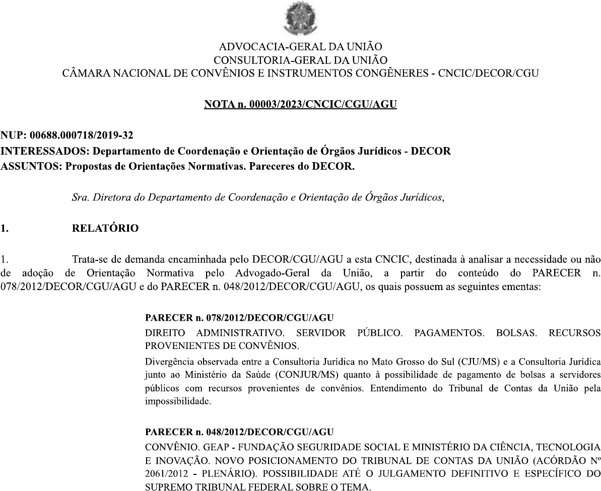 <p>ADVOCACIA-GERAL DA CONSULTORIA-GERAL DA CÂMARA NACIONAL DE CONVÊNIOS E INSTRUMENTOS CONGÊNERES CNCIC/DECOR/CGU NOTA n. 00003/2023/CNCIC/CGU/AGU NUP: 00688.000718/2019-32 INTERESSADOS: Departamento de Coordenação e Orientação de Órgãos Jurídicos DECOR ASSUNTOS: Propostas de Orientações Normativas. Pareceres do DECOR. Sra. Diretora do Departamento de Coordenação e Orientação de Órgãos Jurídicos, 1. RELATÓRIO 1. Trata-se de demanda encaminhada pelo DECOR/CGU/AGU a esta CNCIC, destinada à analisar a necessidade ou não de adoção de Orientação Normativa pelo Advogado-Geral da União, a partir do conteúdo do PARECER n. e do PARECER n. 048/2012/DECOR/CGU/AGU, os quais possuem as seguintes ementas: PARECER n. 078/2012/DECOR/CGU/AGU DIREITO SERVIDOR PÚBLICO. PAGAMENTOS. BOLSAS. RECURSOS PROVENIENTES DE CONVÊNIOS. Divergência observada entre a Consultoria Jurídica no Mato Grosso do Sul (CJU/MS) e a Consultoria Jurídica junto ao Ministério da Saúde (CONJUR/MS) quanto à possibilidade de pagamento de bolsas a servidores públicos com recursos provenientes de convênios. Entendimento do Tribunal de Contas da União pela impossibilidade. PARECER n. 048/2012/DECOR/CGU/AGU CONVÊNIO. GEAP - FUNDAÇÃO SEGURIDADE SOCIAL E MINISTÉRIO DA CIÊNCIA, TECNOLOGIA E NOVO POSICIONAMENTO DO TRIBUNAL DE CONTAS DA UNIÃO (ACÓRDÃO 2061/2012 - PLENÁRIO). POSSIBILIDADE ATÉ JULGAMENTO DEFINITIVO E ESPECÍFICO DO SUPREMO TRIBUNAL FEDERAL SOBRE TEMA.</p><p>Com fundamento, sobretudo, no art. 230 da Lei 8.112/90, com as alterações introduzidas pela Lei 11.302/2006, e no Acórdão 2061/2012 Plenário do Tribunal de Contas da União, considera-se viável, em tese e até o julgamento definitivo pelo Supremo Tribunal Federal dos Mandados de Segurança 25.855, 25.919, 25.922, 25.934, 25.928, 25.901, 25.891, 25.866 e 25.942, a celebração de novo convênio entre a GEAP Fundação de Seguridade Social e o Ministério da Ciência, Tecnologia e Inovação com o objetivo de oferecer aos servidores daquela Pasta e também a seus dependentes o plano de saúde GEAPReferência, mantido por aquela fundação. 2. ANÁLISE 2. Em relação ao PARECER n. 078/2012/DECOR/CGU/AGU a Portaria n° 424, de 30 de dezembro de 2016, que regula os instrumentos de repasse celebrados pelos órgãos e entidades da Administração Pública Federal com órgãos ou entidades públicas ou entidades privadas sem fins lucrativos para a execução de programas, projetos e atividades de interesse recíproco, que envolvam a transferência de recursos financeiros oriundos do Orçamento Fiscal e da Seguridade Social da União." dispôs expressamente no art. 38 o seguinte: Art. 38. instrumento deverá ser executado em estrita observância às cláusulas avençadas e às normas pertinentes, inclusive esta Portaria, sendo vedado: (...) II pagar, a qualquer título, servidor ou empregado público, integrante de quadro de pessoal do órgão ou entidade pública da Administração direta ou indireta, salvo nas hipóteses previstas em leis federais específicas e na Lei de Diretrizes Orçamentárias; (grifou-se) 3. No que se refere ao PARECER n. é imperioso mencionar que se tratava de caso concreto bastante específico e judicializado, no qual considerou-se viável, em tese e até o julgamento definitivo pelo Supremo Tribunal Federal a celebração de novo convênio entre a GEAP Fundação de Seguridade Social e o Ministério da Ciência, Tecnologia e Inovação com o objetivo de oferecer aos servidores daquela Pasta e também a seus dependentes o plano de saúde GEAPReferência, mantido por aquela fundação. 4. Desse modo, não faz sentido elaborar orientação normativa sobre um convênio específico e sem relevantes repercussões. 3. CONCLUSÃO 5. Ante o exposto, não se vislumbra a necessidade ou pertinência de elaborar proposição de Orientação Normativa da Advocacia-Geral da União a respeito dos temas em comento, os quais, conforme demonstrado, estão respectivamente bem sedimentados nas regulamentações infralegais e são relativos ao específico convênio entre a GEAP e o Ministério da Ciência, Tecnologia e Inovação.</p><p>À consideração dos membros da CNCIC. Brasília, 27 de abril de 2023. JOÃO PAULO CHAIM DA SILVA Relator Advogado da União Membro da Câmara Nacional de Convênios e Instrumentos Congêneres - CNCIC ADELAINE FEIJÓ MACEDO Advogada da União Membro da Câmara Nacional de Convênios e Instrumentos Congêneres - CNCIC ANGÉLICA MOREIRA DRESCH DA SILVEIRA Advogada da União Membro da Câmara Nacional de Convênios e Instrumentos Congêneres - CNCIC CARLOS FREIRE LONGATO Advogado da União Membro da Câmara Nacional de Convênios e Instrumentos Congêneres - CNCIC GUSTAVO ALMEIDA DIAS Advogado da União Coordenador da Câmara Nacional de Convênios e Instrumentos Congêneres - CNCIC JORGE CESAR SILVEIRA BALDASSARE GONÇALVES Advogado da União Membro da Câmara Nacional de Convênios e Instrumentos Congêneres - CNCIC MARCUS MONTEIRO AUGUSTO Advogado da União Membro da Câmara Nacional de Convênios e Instrumentos Congêneres - CNCIC</p><p>MICHELLE MARRY MARQUES DA SILVA Advogada da União Membro da Câmara Nacional de Convênios e Instrumentos Congêneres - CNCIC PABLO FRANCESCO RODRIGUES DA SILVA Procurador Federal Membro da Câmara Nacional de Convênios e Instrumentos Congêneres - CNCIC SEBASTIÃO GILBERTO MOTA TAVARES Procurador da Fazenda Nacional Membro da Câmara Nacional de Convênios e Instrumentos Congêneres - CNCIC Atenção, a consulta ao processo eletrônico está disponível em mediante o fornecimento do Número Único de Protocolo (NUP) 00688000718201932 e da chave de acesso 5a73e0fd Documento assinado eletronicamente por SEBASTIAO GILBERTO MOTA TAVARES, de acordo com os normativos legais aplicáveis. A conferência da autenticidade do documento está disponível com o código 1156116034 no endereço eletrônico http://sapiens.agu.gov.br. Informações adicionais: Signatário