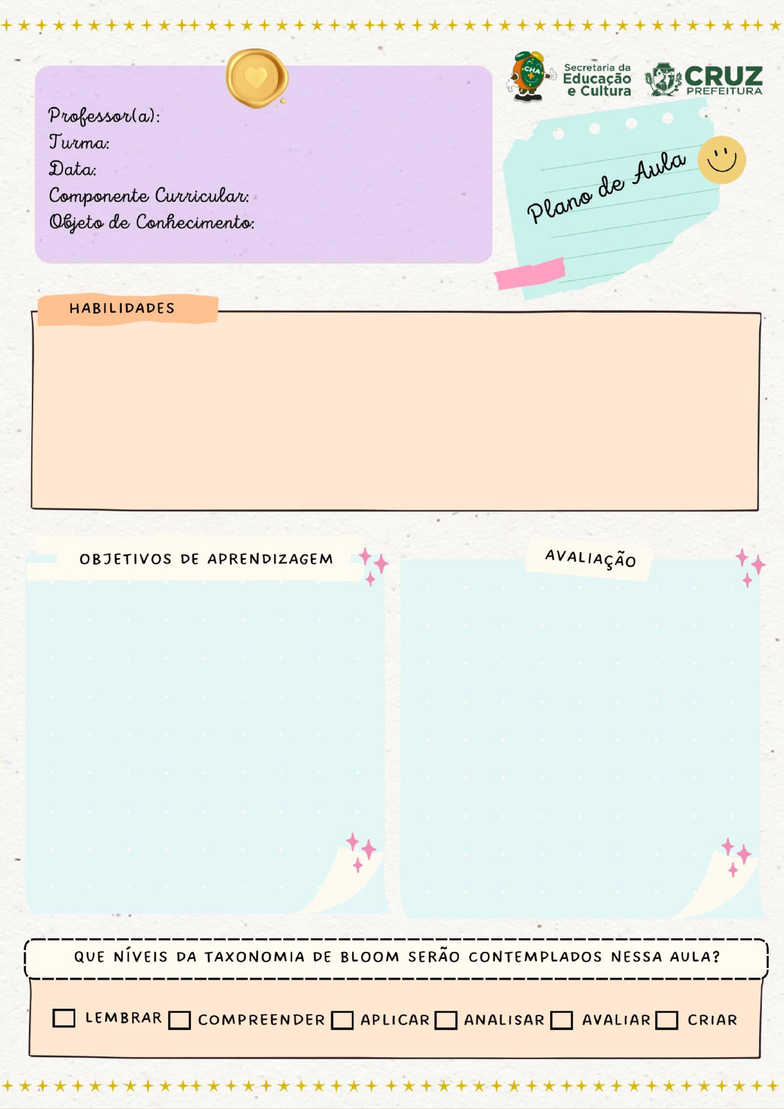 <p>Keilla Sousa</p><p>(EF15LP03) (EF12LP19) (EF01LP13)</p><p>Localizar informações no texto;</p><p>Ler frases;</p><p>Identificar a sílaba inicial e final;</p><p>Identificar rimas;</p><p>Identificar a quantidade de sílabas.</p><p>x</p><p>Chamar os alunos individualmente</p><p>para realizar a correção, realizando</p><p>intervenções quando necessário.</p><p>1º ano</p><p>27/04/2023</p><p>Língua Portuguesa</p><p>Revisão “Avaliação</p><p>diagnóstica”</p><p>x x x x</p><p>[Capture a atenção do leitor com uma ótima citação do documento ou use este espaço para enfatizar um</p><p>ponto-chave. Para colocar essa caixa de texto em qualquer lugar na página, basta arrastá-la.]</p><p>Acolhida: com boas vindas e músicas;</p><p>Atividades permanentes: Exposição da agenda, chamada, calendário e ajudante do dia;</p><p>Retomada do estudo de casa;</p><p>Momento literário: Projeto “Papo de leitor”</p><p>Momento da consciência fonológica</p><p>Gancho: organizar as crianças em fila para a realização da avaliação diagnóstica</p><p>Tempo de leitura e oralidade: entregar a avaliação e pedir que os alunos realizem com</p><p>atenção prestando atenção nos comandos da professora.</p><p>Encaminhar o estudo de casa: atividade xerocada</p>