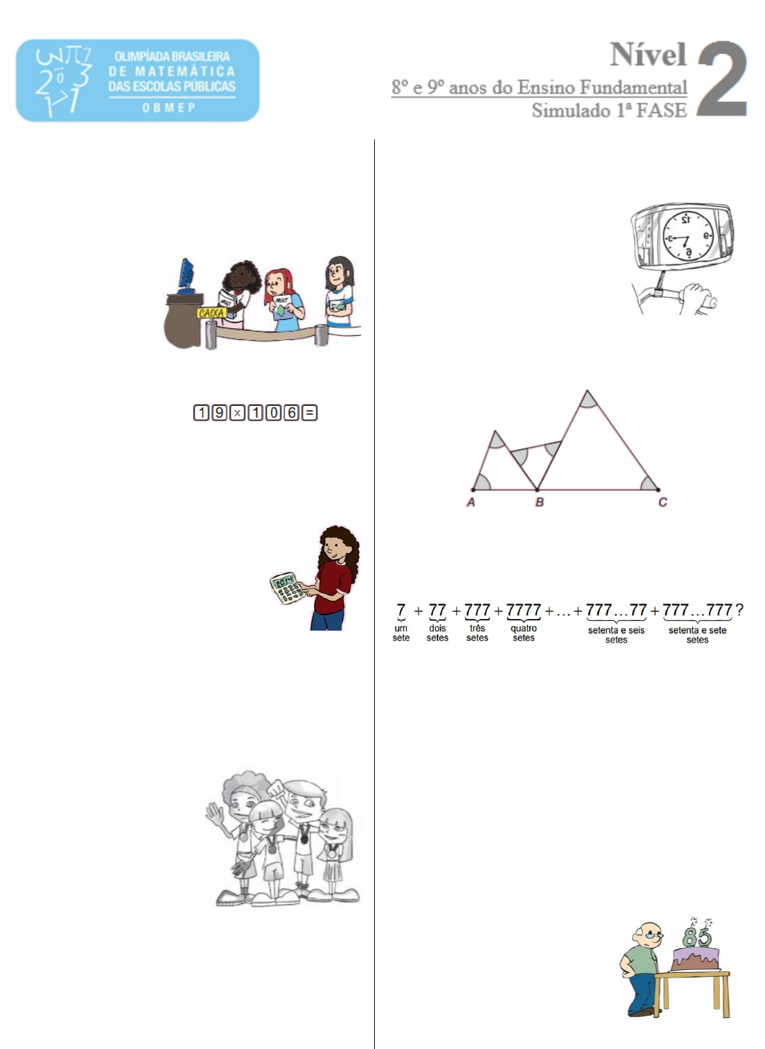<p>1</p><p>1. As colegas de sala Ana, Alice e Aurora foram comprar</p><p>seus livros de Matemática. Alice percebeu que havia</p><p>esquecido sua carteira. Ana e Aurora pagaram pelos três</p><p>livros; Ana contribuiu com 𝑅$43,00 e Aurora com</p><p>𝑅$68,00. Quanto Alice deve pagar para Ana e para Aurora,</p><p>respectivamente?</p><p>A) 𝑅$18,50 e 𝑅$18,50</p><p>B) 𝑅$0,00 e 𝑅$37,00</p><p>C) 𝑅$25,00 e 𝑅$37,00</p><p>D) 𝑅$12,00 e 𝑅$25,00</p><p>E) 𝑅$6,00 e 𝑅$31,00</p><p>2. Ana Maria apertou as teclas de sua</p><p>calculadora e o resultado 2014 apareceu no visor. Em</p><p>seguida, ela limpou o visor e fez aparecer novamente 2014</p><p>com uma multiplicação de dois números naturais, mas,</p><p>desta vez, apertando seis teclas em vez de sete. Nesta</p><p>segunda multiplicação, qual foi o maior algarismo cuja</p><p>tecla ela apertou?</p><p>A) 5</p><p>B) 6</p><p>C) 7</p><p>D) 8</p><p>E) 9</p><p>3. A escola de Paraqui organizou uma Olimpíada de</p><p>Matemática para seus 250 alunos e premiou com</p><p>medalhas os 8% que obtiveram as notas mais altas.</p><p>Quantas medalhas foram distribuídas?</p><p>A) 8</p><p>B) 11</p><p>C) 14</p><p>D) 17</p><p>E) 20</p><p>4. Benjamim passava pela praça de Quixajuba, quando viu</p><p>o relógio da praça pelo espelho da bicicleta, como na</p><p>figura. Que horas o relógio estava marcando?</p><p>A) 5h 15min</p><p>B) 5h 45min</p><p>C) 6h 15min</p><p>D) 6h 45min</p><p>E) 7h 45min</p><p>5. Na figura, os pontos 𝐴, 𝐵 e 𝐶 estão alinhados. Qual é a</p><p>soma dos ângulos marcados em cinza?</p><p>A) 120∘</p><p>B) 180∘</p><p>C) 270∘</p><p>D) 360∘</p><p>E) 540∘</p><p>6. Qual é o algarismo das dezenas da soma</p><p>A) 5</p><p>B) 6</p><p>C) 7</p><p>D) 8</p><p>E) 9</p><p>7. Vovô Eduardo comemorou todos os seus aniversários a</p><p>partir dos 40 anos colocando, no bolo, velinhas em forma</p><p>de algarismos de 0 a 9 para indicar sua idade. Primeiro ele</p><p>comprou as velinhas de números 0 e 4. Ele sempre guardou</p><p>as velinhas para usar nos próximos aniversários,</p><p>comprando uma nova somente quando não era possível</p><p>indicar sua idade com as guardadas. Hoje vovô Eduardo</p><p>tem 85 anos. Quantas velinhas ele comprou até hoje?</p><p>A) 10</p><p>B) 11</p><p>C) 13</p><p>D) 14</p><p>E) 16</p><p>2</p><p>8. João fez uma viagem de ida e volta entre Pirajuba e</p><p>Quixajuba em seu carro, que pode rodar com álcool e com</p><p>gasolina. Na ida, apenas com álcool no tanque, seu carro</p><p>fez 12 km por litro e na volta, apenas com gasolina no</p><p>tanque, fez 15 km por litro. No total, João gastou 18 litros</p><p>de combustível nessa viagem. Qual é a distância entre</p><p>Pirajuba e Quixajuba?</p><p>A) 60 km</p><p>B) 96 km</p><p>C) 120 km</p><p>D) 150 km</p><p>E) 180 km</p><p>9. Dois quadrados de papel se sobrepõem como na figura.</p><p>A região não sobreposta do quadrado menor corresponde</p><p>a 52% de sua área e a região não sobreposta do quadrado</p><p>maior corresponde a 73% de sua área. Qual é a razão entre</p><p>o lado do quadrado menor e o lado do quadrado maior?</p><p>A)</p><p>3</p><p>4</p><p>B)</p><p>5</p><p>8</p><p>C)</p><p>2</p><p>3</p><p>D)</p><p>4</p><p>7</p><p>E)</p><p>4</p><p>5</p><p>10. Renata montou uma sequência de triângulos com</p><p>palitos de fósforo, seguindo o padrão indicado na figura.</p><p>Um desses triângulos foi construído com 135 palitos de</p><p>fósforo. Quantos palitos formam o lado desse triângulo?</p><p>A) 6</p><p>B) 7</p><p>C) 8</p><p>D) 9</p><p>E) 10</p><p>11. O polígono 𝐴𝐵𝐶𝐷𝐸𝐹 é um hexágono regular. Os</p><p>pontos 𝑀 e 𝑁 são pontos médios dos lados 𝐴𝐹 e 𝐵𝐶,</p><p>respectivamente. O hexágono 𝐴𝐵𝑁𝐺𝐻𝑀 é simétrico em</p><p>relação à reta que passa por 𝑀 e 𝑁. Qual é a razão entre as</p><p>áreas dos hexágonos 𝐴𝐵𝑁𝐺𝐻𝑀 e 𝐴𝐵𝐶𝐷𝐸𝐹?</p><p>A)</p><p>3</p><p>10</p><p>B)</p><p>4</p><p>11</p><p>C)</p><p>3</p><p>7</p><p>D)</p><p>7</p><p>15</p><p>E)</p><p>5</p><p>12</p><p>12. Tia Geralda sabe que um de seus sobrinhos Ana, Bruno,</p><p>Cecília, Daniela ou Eduardo comeu todos os biscoitos. Ela</p><p>também sabe que o culpado sempre mente e que os</p><p>inocentes sempre dizem a verdade.</p><p>• Bruno diz: “O culpado é Eduardo ou Daniela.”</p><p>• Eduardo diz: “O culpado é uma menina.”</p><p>• Por fim, Daniela diz: “Se Bruno é culpado então</p><p>Cecília é inocente.”</p><p>Quem comeu os biscoitos?</p><p>A) Ana</p><p>B) Bruno</p><p>C) Cecília</p><p>D) Daniela</p><p>E) Eduardo</p><p>13. A estrada que passa pelas cidades de Quixajuba e</p><p>Paraqui tem 350 quilômetros. No quilômetro 70 dessa</p><p>estrada há uma placa indicando Quixajuba a 92 km. No</p><p>quilômetro 290 há uma placa indicando Paraqui a 87 km.</p><p>Qual é a distância entre Quixajuba e Paraqui?</p><p>A) 5 km</p><p>B) 41 km</p><p>C) 128 km</p><p>D) 179 km</p><p>E) 215 km</p><p>3</p><p>14. No triângulo 𝐴𝐵𝐶 temos 𝐴𝐵 = 𝐴𝐶 e os cinco</p><p>segmentos marcados têm todos a mesma medida. Qual é</p><p>a medida do ângulo 𝐵�̂�𝐶?</p><p>A) 10∘</p><p>B) 15∘</p><p>C) 20∘</p><p>D) 25∘</p><p>E) 30∘</p><p>15. Fazendo oito cortes em um cubo, perto de seus</p><p>vértices, obtemos um sólido com 14 faces, que numeramos</p><p>de 1 a 14. Na figura observamos esse sólido sob dois</p><p>pontos de vista diferentes. Qual é o número da face oposta</p><p>à face de número 13?</p><p>A) 5</p><p>B) 6</p><p>C) 7</p><p>D) 11</p><p>E) 12</p><p>16. Mariana escreveu as decomposições em fatores</p><p>primos dos números naturais de 2 a 100:</p><p>2, 3, 2 × 2 , 5, 2 × 3 , . . . , 3 × 3 × 11 , 2 × 2 × 5 × 5.</p><p>Quantas vezes ela escreveu o algarismo 2?</p><p>A) 99</p><p>B) 104</p><p>C) 152</p><p>D) 188</p><p>E) 191</p><p>17. Um cubo de madeira foi pintado de vermelho e depois</p><p>cortado em 𝑛3 cubinhos iguais, 𝑛 > 2 . Alguns d