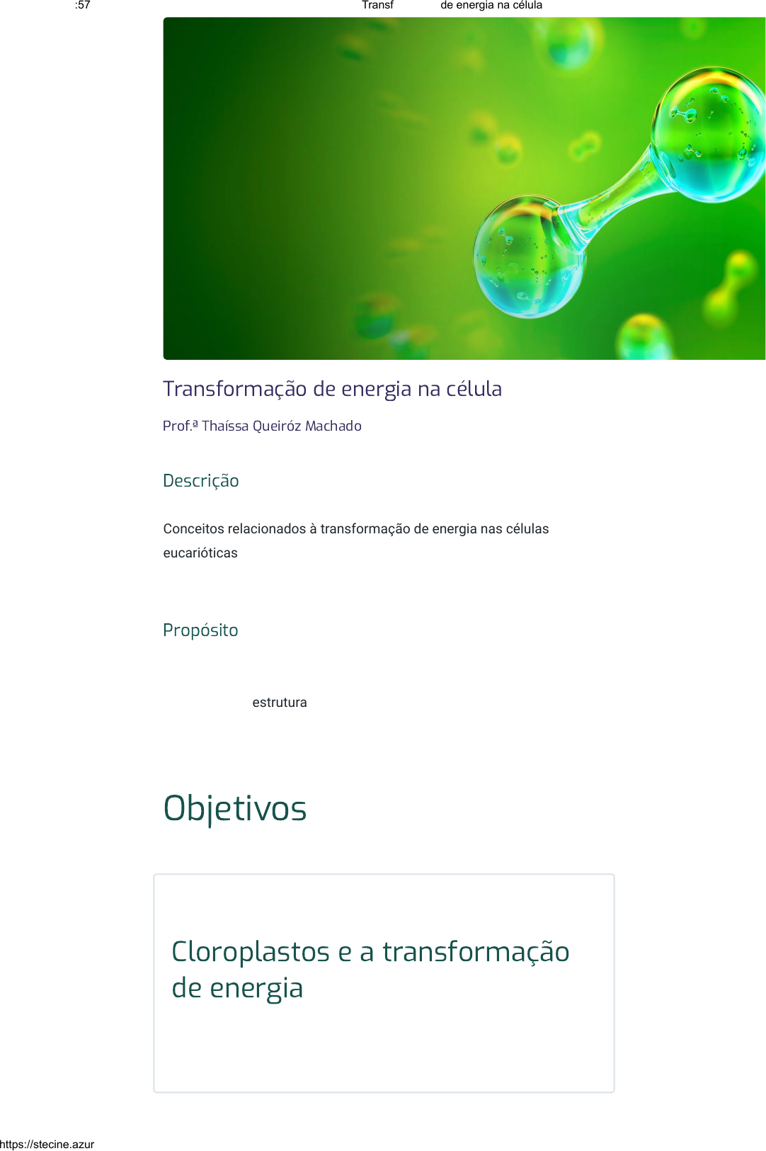 <p>Transformação de energia na célula</p><p>Prof.ª Thaíssa Queiróz Machado</p><p>Descrição</p><p>Conceitos relacionados à transformação de energia nas células</p><p>eucarióticas e entendimento das características e funções de organelas</p><p>atuantes no processo de obtenção de energia.</p><p>Propósito</p><p>Compreender de que forma as células obtêm energia e como as</p><p>organelas são estruturadas e funcionam é essencial para o estudo da</p><p>biologia celular, que é a base das ciências da vida.</p><p>Objetivos</p><p>Módulo 1</p><p>Cloroplastos e a transformação</p><p>de energia</p><p>Identificar as características e as funções dos cloroplastos.</p><p>03/06/2024, 18:57 Transformação de energia na célula</p><p>https://stecine.azureedge.net/repositorio/00212sa/03024/index.html?brand=estacio# 1/55</p><p>Módulo 2</p><p>Mitocôndrias e a transformação</p><p>de energia</p><p>Descrever as características e as funções das mitocôndrias.</p><p>Módulo 3</p><p>Peroxissomos e o metabolismo</p><p>celular</p><p>Reconhecer o papel dos peroxissomos no metabolismo celular.</p><p>Introdução</p><p>As células são a unidade básica de todos os organismos. Para</p><p>que a célula sobreviva e realize suas atividades, é necessário que</p><p>alguns processos sejam executados, entre eles a obtenção e a</p><p>transformação de energia. Uma célula sem energia é uma célula</p><p>morta.</p><p>Existem diferentes formas de obter e transformar energia, a</p><p>depender do tipo celular. As células vegetais (das plantas e algas,</p><p>por exemplo) obtêm energia pelo processo da fotossíntese. Só</p><p>realizam fotossíntese as células que possuem uma organela</p><p>chamada cloroplasto. O cloroplasto apresenta uma estrutura</p><p>especializada que transforma energia luminosa (do sol) em</p><p>energia química para a célula.</p><p>Já as células animais também possuem seu mecanismo de</p><p>transformação de energia, mas não por meio de fotossíntese. A</p><p></p><p>03/06/2024, 18:57 Transformação de energia na célula</p><p>https://stecine.azureedge.net/repositorio/00212sa/03024/index.html?brand=estacio# 2/55</p><p>mitocôndria é a organela capaz de realizar vários processos vitais</p><p>para as células. No que diz respeito à energia, as mitocôndrias</p><p>realizam a respiração celular, um mecanismo com várias etapas</p><p>que apresenta uma sequência de eventos impressionantes e</p><p>coordenados.</p><p>Neste conteúdo, vamos conhecer as características dos</p><p>cloroplastos e mitocôndrias, responsáveis pela obtenção e</p><p>transformação de energia na célula, e entender como tais</p><p>processos são executados. Além disso, conheceremos outra</p><p>organela que participa do metabolismo celular, o peroxissomo e</p><p>suas funções.</p><p>1 - Cloroplastos e a transformação de energia</p><p>Ao �nal deste módulo, você será capaz de identi�car as</p><p>características e as funções dos cloroplastos.</p><p>Os cloroplastos</p><p>Para que as células se mantenham vivas, elas precisam constantemente</p><p>de ATP (adenosina trifosfato), que é responsável pelo fornecimento de</p><p>energia. Grande quantidade de energia é produzida por dois tipos de</p><p>organelas: as mitocôndrias, presentes em quase todas as células</p><p>03/06/2024, 18:57 Transformação de energia na célula</p><p>https://stecine.azureedge.net/repositorio/00212sa/03024/index.html?brand=estacio# 3/55</p><p>animais e vegetais, e os cloroplastos, encontrados somente em células</p><p>vegetais, das plantas e algas.</p><p>Organelas</p><p>São estruturas localizadas no citoplasma celular e que desempenham</p><p>funções importantes para garantir o funcionamento adequado da célula.</p><p>Representação em 3D do cloroplasto.</p><p>Os cloroplastos estão localizados principalmente nas células das folhas</p><p>de plantas. São um tipo de plastídio ou plasto, que possuem DNA</p><p>próprio e têm capacidade de autoduplicação. As células vegetais</p><p>apresentam características marcantes que as distinguem das células</p><p>animais: a presença de vacúolos, parede celular e cloroplasto.</p><p>O cloroplasto possui pigmento verde em abundância, que é a clorofila -</p><p>responsável pela cor verde das plantas e algas verdes e está</p><p>diretamente relacionada com o processo de fotossíntese, no qual a</p><p>energia solar é aproveitada para produzir ATP.</p><p>Além da clorofila, os cloroplastos também apresentam pigmentos</p><p>amarelos e laranjas, os carotenoides, mas estes são comumente</p><p>mascarados nas folhas pela coloração verde predominante da clorofila.</p><p>A ultraestrutura dos cloroplastos é considerada complexa. Apresenta</p><p>geralmente um formato de disco e possui duas membranas de</p><p>revestimento e um espaço intermembranar entre elas. Dentro dos</p><p>cloroplastos há um fluido chamado estroma, onde estão dispersos</p><p>vários componentes, como DNA e ribossomos. Além de abrigar</p><p>estruturas, o estroma executa diferentes vias metabólicas</p><p>indispensáveis para a célula.</p><p>03/06/2024, 18:57 Transformação de energia na célula</p><p>https://stecine.azureedge.net/repositorio/00212sa/03024/index.html?brand=estacio# 4/55</p><p>Ultraestrutura do cloroplasto.</p><p>Mergulhado no estroma, encontram-se os tilacoides, que são um</p><p>sistema de membranas que formam estruturas similares a sacos</p><p>achatados. Na membrana do tilacoide, estão as clorofilas, os</p><p>carotenoides e os complexos proteicos que atuam na cadeia</p><p>transportadora de elétrons para produção de ATP. O interior dos</p><p>tilacoides é chamado de lúmen do tilacoide. Os tilacoides se organizam</p><p>no interior do cloroplasto formando colunas semelhantes a pilhas de</p><p>moedas, chamadas de grânulo ou granum.</p><p>As membranas que compõem os cloroplastos são: membrana externa,</p><p>membrana interna e membranas dos tilacoides. Essas membran