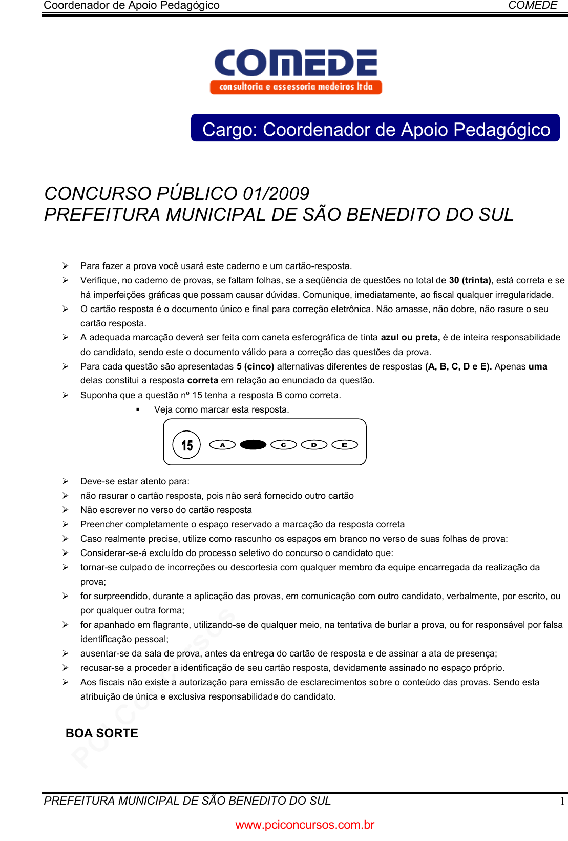 <p>pcimarkpci MjgwNDowMTRkOmJlODg6OGIxYzpjMDM2OjYyNTQ6ZmJkMzozMTJk:VGh1LCAwMyBPY3QgMjAyNCAxODoyNjo0NCAtMDMwMA==</p><p>www.pciconcursos.com.br</p><p>Coordenador de Apoio Pedagógico COMEDE</p><p>PREFEITURA MUNICIPAL DE SÃO BENEDITO DO SUL 1</p><p>Cargo: Coordenador de Apoio Pedagógico</p><p>CONCURSO PÚBLICO 01/2009</p><p>PREFEITURA MUNICIPAL DE SÃO BENEDITO DO SUL</p><p>Instruções</p><p> Para fazer a prova você usará este caderno e um cartão-resposta.</p><p> Verifique, no caderno de provas, se faltam folhas, se a seqüência de questões no total de 30 (trinta), está correta e se</p><p>há imperfeições gráficas que possam causar dúvidas. Comunique, imediatamente, ao fiscal qualquer irregularidade.</p><p> O cartão resposta é o documento único e final para correção eletrônica. Não amasse, não dobre, não rasure o seu</p><p>cartão resposta.</p><p> A adequada marcação deverá ser feita com caneta esferográfica de tinta azul ou preta, é de inteira responsabilidade</p><p>do candidato, sendo este o documento válido para a correção das questões da prova.</p><p> Para cada questão são apresentadas 5 (cinco) alternativas diferentes de respostas (A, B, C, D e E). Apenas uma</p><p>delas constitui a resposta correta em relação ao enunciado da questão.</p><p> Suponha que a questão nº 15 tenha a resposta B como correta.</p><p> Veja como marcar esta resposta.</p><p> Deve-se estar atento para:</p><p> não rasurar o cartão resposta, pois não será fornecido outro cartão</p><p> Não escrever no verso do cartão resposta</p><p> Preencher completamente o espaço reservado a marcação da resposta correta</p><p> Caso realmente precise, utilize como rascunho os espaços em branco no verso de suas folhas de prova:</p><p> Considerar-se-á excluído do processo seletivo do concurso o candidato que:</p><p> tornar-se culpado de incorreções ou descortesia com qualquer membro da equipe encarregada da realização da</p><p>prova;</p><p> for surpreendido, durante a aplicação das provas, em comunicação com outro candidato, verbalmente, por escrito, ou</p><p>por qualquer outra forma;</p><p> for apanhado em flagrante, utilizando-se de qualquer meio, na tentativa de burlar a prova, ou for responsável por falsa</p><p>identificação pessoal;</p><p> ausentar-se da sala de prova, antes da entrega do cartão de resposta e de assinar a ata de presença;</p><p> recusar-se a proceder a identificação de seu cartão resposta, devidamente assinado no espaço próprio.</p><p> Aos fiscais não existe a autorização para emissão de esclarecimentos sobre o conteúdo das provas. Sendo esta</p><p>atribuição de única e exclusiva responsabilidade do candidato.</p><p>BOA SORTE</p><p>www.pciconcursos.com.br</p><p>pcimarkpci MjgwNDowMTRkOmJlODg6OGIxYzpjMDM2OjYyNTQ6ZmJkMzozMTJk:VGh1LCAwMyBPY3QgMjAyNCAxODoyNjo0NCAtMDMwMA==</p><p>www.pciconcursos.com.br</p><p>Coordenador de Apoio Pedagógico COMEDE</p><p>PREFEITURA MUNICIPAL DE SÃO BENEDITO DO SUL 2</p><p>1. Há décadas discute-se em congressos, seminários, cursos e outros eventos semelhantes, qual a formação ideal ou</p><p>necessária do professor numa demonstração ostensiva de insatisfação generalizada com relação aos modelos</p><p>formativos vigentes. A respeito da formação para professores, marque a alternativa correta:</p><p>a) No entanto, dessa ampla e continuada discussão, têm emergido propostas que ultrapassem o nível de recomendações</p><p>abstratas sobre a necessidade de “sólida formação dos educadores”, da “integração de teoria e prática”, da</p><p>“interdisciplinaridade”.</p><p>b) Nessas discussões, quase sempre se parte de uma noção vaga e impressionista de “escola brasileira”, caminha-se</p><p>para a afirmação da necessidade de uma “política nacional de formação de professores” e, em seguida, desenha-se o</p><p>“perfil profissional” desses professores por meio de um arrolamento de competências cognitivas e docentes que</p><p>deveriam ser desenvolvidas pelos cursos formadores.</p><p>c) Embora esse traçado das discussões seja amplo, ele capta duas tendências sempre presentes no encaminhamento do</p><p>tema da formação de professores: o vezo centralizador das normas gerais e a fixação na figura individual do professor.</p><p>d) sugestões dessa natureza são capazes de entreter colóquios e debates, mas a sua utilidade vai além desses efeitos</p><p>retóricos.</p><p>e) No que diz respeito às propostas de formação docente, o estado de coisas está tão desarranjado que, quando se fala</p><p>em metodologias e estratégias de ensino, consegue discernir entre possíveis relações conceituais entre conhecimento,</p><p>ensino e valores e hipotéticas relações entre capacidade de aprender e supostas fases de desenvolvimento</p><p>psicológico.</p><p>2. A maciça expansão das matrículas no ensino fundamental desde há trinta anos, e no ensino médio mais</p><p>recentemente, inviabilizaram uma concepção da atividade de ensino fundada na relação professor-aluno, na qual a</p><p>imagem do “bom professor” era basicamente a daquele profissional que dominava um saber disciplinar que seria</p><p>transmitido a um discípulo. A respeito disto julgue os itens abaixo: (correta)</p><p>a) O êxito desse ensino dependia, pensava-se, em uma dicotomia, a de conhecimento disciplinar e a de preparo didático</p><p>do professor. No quadro dessa concepção, nasceram e permaneceram durante muitos anos os cursos de licenciatura</p><p>no ensino superior brasileiro e em outros países. No Brasil, a explosiva expansão do ensino de 1o grau, desde 1971,</p><p>exigiu também a expansão acelerada dos cursos de licenciatura que simplesmente disseminaram o modelo associado</p><p>a essa concepção.</p><p>b) Por razões que ainda estão suficientemente estudadas, essa pretendida qualidade foi interpretada como uma questão</p><p>a ser resolvida metodologicamente, por meio de procedimentos d