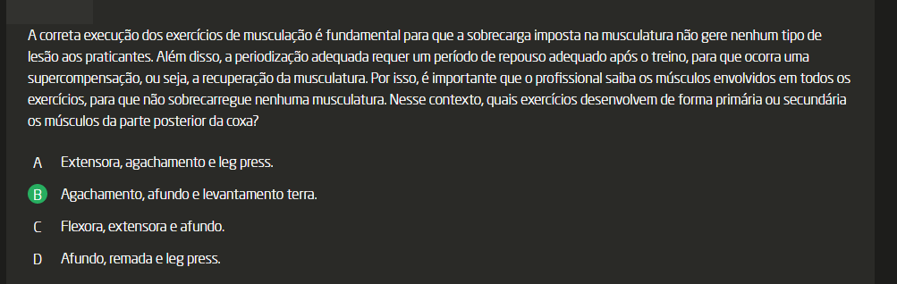 <p>A correta execução dos exercícios de musculação é fundamental para que a sobrecarga imposta na musculatura não gere nenhum tipo de lesão aos praticantes. Além disso, a periodização adequada requer um período de repouso adequado após treino, para que ocorra uma supercompensação, seja, a recuperação da musculatura. Por isso, é importante que profissional saiba os músculos envolvidos em todos os exercícios, para que não sobrecarregue nenhuma musculatura. Nesse contexto, quais exercícios desenvolvem de forma primária secundária os músculos da parte posterior da coxa? A Extensora, agachamento e leg press. B Agachamento, afundo e levantamento terra. Flexora extensora e afundo. D Afundo, remada e leg press.</p>