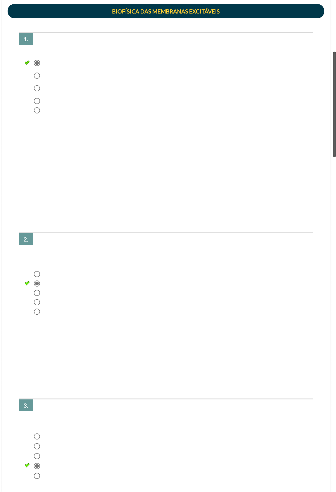 <p>Algumas drogas utilizadas no tratamento de alguns tipos de depressão agem impedindo a recaptação do</p><p>neurotransmissor serotonina no sistema nervoso central. Assinale a alternativa correta.</p><p>A plasticidade neuronal é a capacidade do sistema nervoso para reorganizar sua estrutura e função em resposta a</p><p>estímulos internos e externos. Após a lesão neural pode ocorrer a morte de neurônios que são substituídos e</p><p>ocorre alterações das sinapse. Quando essas lesões dani�cam as terminações axônicas pré-sináptica, que</p><p>necessitam de alterações, esse mecanismo recebe o nome de:</p><p>Quando, através de uma membrana celular (plasmalema), é realizado o transporte simultâneo de</p><p>duas diferentes substâncias em uma mesma direção, caracteriza-se esse tipo de proteína</p><p>carreadora, bem como o mecanismo de transporte ativo por ela possibilitado, como um:</p><p>BIOFÍSICA DAS MEMBRANAS EXCITÁVEIS</p><p>1.</p><p>Após sua liberação, o neurotransmissor provoca um potencial de ação na membrana pós-sináptica e é</p><p>recaptado pelo neurônio pré-sináptico.</p><p>Em uma sinapse, os neurotransmissores são liberados a partir de vesículas existentes nos dendritos.</p><p>Neurotransmissores são substâncias que agem no citoplasma do corpo celular dos neurônios, provocando o</p><p>surgimento de um impulso nervoso.</p><p>Somente as sinapses entre dois neurônios utilizam neurotransmissores como mediadores.</p><p>Neurotransmissores diferentes são capazes de provocar potenciais de ação de intensidades diferentes.</p><p>Data Resp.: 20/11/2023 11:42:46</p><p>Explicação:</p><p>Quando o neurotransmissor age em receptores excitatórios, ele provoca a abertura de canais de Na+ e</p><p>consequente aumento da permeabilidade desses íons na membrana pós-sináptica. A rápida entrada desse íon</p><p>no neurônio faz com que o potencial de membrana aumente de aproximadamente -65mV a -45mV. Chamamos</p><p>de potencial pós-sináptico excitatório (PPSE) o aumento que ocorreu, nesse caso, de +20mV. Para que o</p><p>neurônio pós-sináptico de�agre outro potencial de ação em seu corpo, uma despolarização que alcance esse</p><p>PPSE deve ocorrer (estímulo supralimiar). Geralmente, vários terminais pré-sinápticos são necessários para</p><p>alcançar tal valor. Já quando o neurotransmissor provoca a abertura de canais de Cl- na membrana pós-</p><p>sináptica, ele provoca inibição do neurônio, pois há um in�uxo de cargas negativas para dentro da célula.</p><p>2.</p><p>HIPEREFICÁCIA SINÁPTICA</p><p>HIPERSENSIBILIDADE POR DESNERVAÇÃO</p><p>DESMASCARAMENTO DE SINAPSES SILENCIOSAS</p><p>DEGENERAÇÃO SINÁPTICA</p><p>RECUPERAÇÃO DA EFICÁCIA SINÁPTICA</p><p>Data Resp.: 20/11/2023 11:40:39</p><p>Explicação:</p><p>Hipersensibilidade por desnervação ocorre quando terminações axônicas pré-sinápticas são destruídas,</p><p>desenvolvem-se novos sítios receptores na membrana pós-sináptica, em resposta ao transmissor liberado pelos</p><p>outros axônios próximos.</p><p>3.</p><p>Nenhuma das alternativas</p><p>Uniporte</p><p>Transporte</p><p>Simporte</p><p>Antiporte</p><p>Data Resp.: 20/11/2023 11:43:58</p>