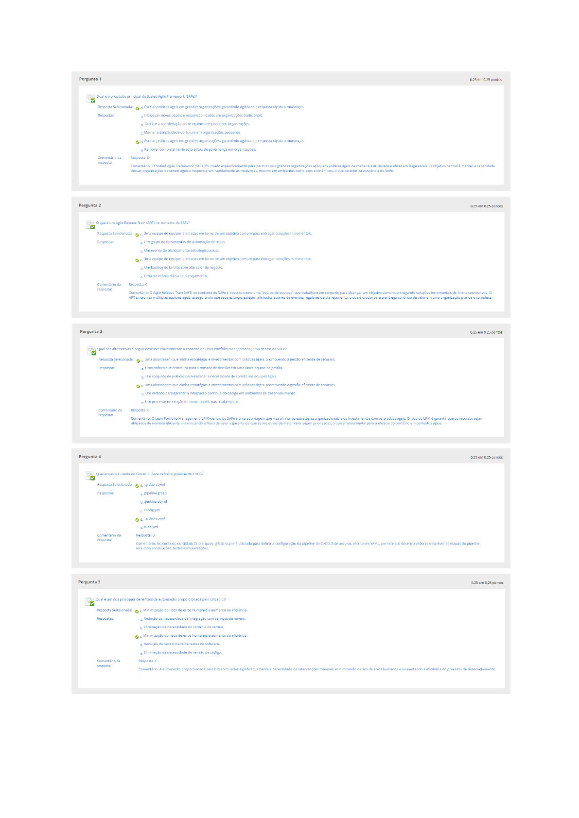 <p>Pergunta 1 em 0.25 pontos Qual propósito principal do Scaled Agile Framework (SAFe)? Resposta Selecionada: Escalar práticas ágeis em grandes garantindo agilidade resposta rápida mudanças. Respostas: Introduzir novos papéis e responsabilidades em organizações b. Facilitar a coordenação entre equipes em pequenas organizações. Manter simplicidade do Scrum em organizações pequenas. d. Escalar práticas ágeis em grandes garantindo agilidade resposta rápida mudanças. Remover completamente as de governança em organizações. Comentário da Resposta: D resposta: Comentário: Scaled Agile Framework (SAFe) foi criado especificamente para permitir que grandes organizações apliquem práticas ágeis de maneira estruturada eficaz em larga escala. objetivo central manter capacidade dessas organizações de serem ágeis responderem rapidamente às mesmo em ambientes complexos dinâmicos, que caracteriza essência do Pergunta 2 pontos que um Agile Release Train (ART) no contexto do SAFe? Resposta Selecionada: c. Uma equipe de equipes alinhadas em torno de um objetivo comum para entregar soluções Respostas: Um grupo de ferramentas de automação de testes. b. Um evento de planejamento estratégico anual. Uma equipe de equipes alinhadas em torno de um objetivo comum para entregar soluções d. Um backlog de tarefas com alto valor de negócio. e Uma cerimônia diária de planejamento. Comentário da Resposta: resposta: Comentário: Agile Release Train (ART) no contexto do SAFe descrito como uma "equipe de equipes" que trabalham em conjunto para alcançar um objetivo entregando soluções incrementais de forma coordenada. o ART sincroniza equipes assegurando que seus esforços estejam alinhados através de eventos regulares de que crucial para entrega continua de valor em uma organização grande complexa Pergunta 3 0,25 0,25 pontos Qual das alternativas seguir descreve corretamente conceito de Lean Portfolio Management (LPM) dentro do SAFe? Resposta Selecionada: Uma abordagem que alinha estratégias investimentos com práticas promovendo gestão eficiente de recursos. Respostas: a. Uma que centraliza toda tomada de decisão em uma unica equipe de gestão. Um conjunto de práticas para eliminar a necessidade de sprints nas equipes Uma abordagem que alinha estratégias investimentos com práticas promovendo gestão eficiente de recursos. d. Um método para garantir a integração continua do código em ambientes de desenvolvimento. e. Um processo de criação de novos papéis para cada equipe. Comentário da Resposta: C resposta: Comentário: o Lean Portfolio Management (LPM) dentro do é uma abordagem que visa alinhar as estratégias organizacionais e os investimentos com as práticas foco do LPM garantir que os recursos sejam utilizados de maneira maximizando fluxo de valor garantindo que as iniciativas de maior valor sejam que fundamental para do portfólio em contextos Pergunta 4 em 0,25 pontos Qual arquivo usado no GitLab C para definir pipeline de CI/CD? Resposta Selecionada: d. Respostas: a. pipeline.gitlab b. .jenkins-ci.yml config.yml .gitlab-ci.yml ci-cd.yml Comentário da D resposta: Comentário: No contexto do GitLab arquivo utilizado para definir configuração do pipeline de CI/CD. Este arquivo, escrito em permite aos desenvolvedores descrever as etapas do incluindo testes Pergunta 5 em 0.25 pontos Qual um dos principais da automação proporcionada pelo GitLab CI? Resposta Minimização do risco de erros humanos aumento da Respostas: Redução da necessidade de integração com serviços de b. Eliminação da necessidade de controle de versão. Minimização do risco de erros humanos aumento da eficiência. d. Redução da necessidade de testes de software. Eliminação da necessidade de revisão de código. Comentário da C resposta: Comentário: A automação proporcionada pelo GitLab CI reduz significativamente necessidade de intervenções minimizando risco de erros humanos aumentando eficiência do processo de desenvolvimento</p><p>Pergunta 6 0.25 em 0.25 pontos que caracteriza prática de DevOps no contexto do desenvolvimento ágil? Resposta Selecionada: Integração automação entre desenvolvimento operações. Respostas: a Separação entre as equipes de desenvolvimento e operações. b. Entrega de software sem testes Foco exclusivo na entrega de funcionalidades sem se preocupar com a infraestrutura. d. Integração e automação continuas entre desenvolvimento e operações. e Eliminação da equipe de operações dedicada. Comentário da Resposta D resposta: Comentário: A prática de DevOps é caracterizada pela integração continua entre desenvolvimento e combinada com automação dos que aumenta eficiência e qualidade do ciclo de Pergunta 7 0.25 em 0.25 pontos Qual é principal benefício de implementar a Inteligência Artificial (IA) na gestão de projetos ágeis? Resposta Selecionada: Aumento da precisão na previsão de prazos alocação de Respostas: Redução completa da necessidade de interação humana no processo de gestão. b. Substituição dos gestores humanos em todas as funções de decisão. Aumento da precisão na previsão de prazos alocação de recursos. d. Eliminação de todas as ineficiências do ciclo de vida do projeto. Execução automática de todas as tarefas administrativas sem supervisão. Comentário da resposta: Resposta: ao ser aplicada na gestão de projetos permite maior precisão na previsão de prazos e na alocação de recursos, otimizando andamento dos projetos. Pergunta 8 0.25 em 0.25 pontos Como analise prescritiva difere da analise preditiva na gestão de projetos? Resposta Selecionada: analise prescritiva fornece sugestões sobre que fazer em relação eventos previstos. Respostas: A analise prescritiva prevê futuros eventos com base em dados históricos. b prescritiva fornece sugestões sobre o que fazer em relação a eventos A análise preditiva recomenda ações específicas para alcançar os melhores resulta