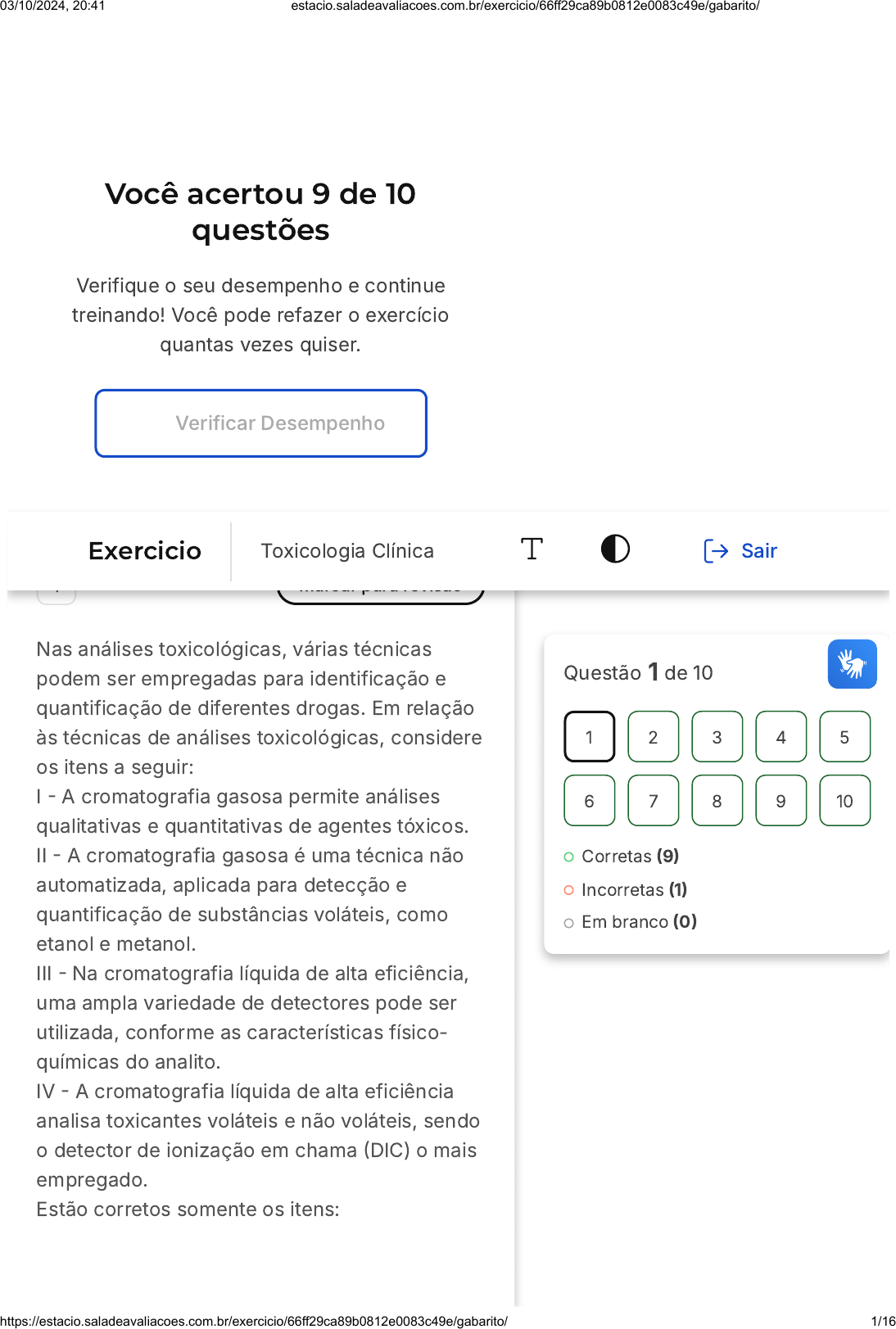<p>Você acertou 9 de 10</p><p>questões</p><p>Verifique o seu desempenho e continue</p><p>treinando! Você pode refazer o exercício</p><p>quantas vezes quiser.</p><p>Verificar Desempenho</p><p>1 Marcar para revisão</p><p>Nas análises toxicológicas, várias técnicas</p><p>podem ser empregadas para identificação e</p><p>quantificação de diferentes drogas. Em relação</p><p>às técnicas de análises toxicológicas, considere</p><p>os itens a seguir:</p><p>I � A cromatografia gasosa permite análises</p><p>qualitativas e quantitativas de agentes tóxicos.</p><p>II � A cromatografia gasosa é uma técnica não</p><p>automatizada, aplicada para detecção e</p><p>quantificação de substâncias voláteis, como</p><p>etanol e metanol.</p><p>III � Na cromatografia líquida de alta eficiência,</p><p>uma ampla variedade de detectores pode ser</p><p>utilizada, conforme as características físico-</p><p>químicas do analito.</p><p>IV � A cromatografia líquida de alta eficiência</p><p>analisa toxicantes voláteis e não voláteis, sendo</p><p>o detector de ionização em chama �DIC) o mais</p><p>empregado.</p><p>Estão corretos somente os itens:</p><p>Questão 1 de 10</p><p>Corretas �9�</p><p>Incorretas �1�</p><p>Em branco �0�</p><p>1 2 3 4 5</p><p>6 7 8 9 10</p><p>Exercicio Toxicologia Clínica Sair</p><p>03/10/2024, 20:41 estacio.saladeavaliacoes.com.br/exercicio/66ff29ca89b0812e0083c49e/gabarito/</p><p>https://estacio.saladeavaliacoes.com.br/exercicio/66ff29ca89b0812e0083c49e/gabarito/ 1/16</p><p>A</p><p>B</p><p>C</p><p>D</p><p>E</p><p>I e IV</p><p>II e IV</p><p>I e III</p><p>II e III</p><p>I e II</p><p>Resposta incorreta</p><p>Opa! A alternativa correta é a letra</p><p>C. Confira o gabarito comentado!</p><p>Gabarito Comentado</p><p>As técnicas de cromatografia líquida de</p><p>alta eficiência �CLAE) e cromatografia</p><p>gasosa �CG) são ambas utilizadas para</p><p>análises qualitativas e quantitativas de</p><p>agentes tóxicos, apresentando elevada</p><p>sensibilidade e seletividade. Além disso,</p><p>ambas são técnicas automatizadas e</p><p>permitem o uso de uma variedade de</p><p>detectores, dependendo das</p><p>características físico-químicas do analito.</p><p>No entanto, a CG é aplicada apenas para a</p><p>análise de substâncias voláteis e</p><p>termoestáveis. Por outro lado, a CLAE é</p><p>capaz de analisar compostos voláteis e</p><p>também não voláteis. Vale ressaltar que o</p><p>detector mais comumente utilizado para a</p><p>cromatografia líquida é o de ultravioleta</p><p>�UV�, e não o de ionização em chama</p><p>03/10/2024, 20:41 estacio.saladeavaliacoes.com.br/exercicio/66ff29ca89b0812e0083c49e/gabarito/</p><p>https://estacio.saladeavaliacoes.com.br/exercicio/66ff29ca89b0812e0083c49e/gabarito/ 2/16</p><p>A</p><p>B</p><p>C</p><p>D</p><p>E</p><p>�DIC�. Portanto, os itens I e III estão</p><p>corretos.</p><p>2 Marcar para revisão</p><p>A intoxicação pode ser dividida didaticamente</p><p>em quatro fases: exposição, toxicocinética,</p><p>toxicodinâmica e clínica. A toxicodinâmica</p><p>corresponde à fase de:</p><p>Contato do agente tóxico com o</p><p>indivíduo.</p><p>Biotransformação do toxicante.</p><p>Interação do xenobiótico com os sítios</p><p>de ação dos órgãos do indivíduo</p><p>exposto.</p><p>Absorção, distribuição,</p><p>biotransformação e excreção do</p><p>agente tóxico.</p><p>Aparecimento de sinais clínicos e</p><p>sintomas.</p><p>Resposta correta</p><p>Parabéns, você selecionou a</p><p>alternativa correta. Confira o</p><p>gabarito comentado!</p><p>Gabarito Comentado</p><p>03/10/2024, 20:41 estacio.saladeavaliacoes.com.br/exercicio/66ff29ca89b0812e0083c49e/gabarito/</p><p>https://estacio.saladeavaliacoes.com.br/exercicio/66ff29ca89b0812e0083c49e/gabarito/ 3/16</p><p>A</p><p>B</p><p>C</p><p>A fase toxicodinâmica é uma etapa crucial</p><p>no processo de intoxicação. Ela envolve a</p><p>interação do xenobiótico, ou seja, a</p><p>substância estranha ao organismo, com os</p><p>sítios de ação dos órgãos do indivíduo</p><p>exposto. Nesse estágio, o agente tóxico</p><p>pode interagir com receptores, formar</p><p>complexos com biomoléculas, interferir nas</p><p>funções das membranas e na energética</p><p>celular. É importante ressaltar que essa</p><p>etapa da intoxicação é distinta e não deve</p><p>ser confundida com as demais fases da</p><p>intoxicação, que são a exposição, a</p><p>toxicocinética e a clínica.</p><p>3 Marcar para revisão</p><p>Em relação às matrizes biológicas utilizadas em</p><p>análises toxicológicas de urgência, assinale a</p><p>alternativa correta.</p><p>A escolha da matriz e o momento da</p><p>coleta não interferem diretamente no</p><p>diagnóstico do paciente intoxicado.</p><p>As matrizes biológicas mais</p><p>empregadas nas análises</p><p>toxicológicas são cabelo, urina e</p><p>conteúdo estomacal.</p><p>A coleta de sangue reflete a exposição</p><p>aguda, assim como o conteúdo</p><p>estomacal e o cabelo.</p><p>03/10/2024, 20:41 estacio.saladeavaliacoes.com.br/exercicio/66ff29ca89b0812e0083c49e/gabarito/</p><p>https://estacio.saladeavaliacoes.com.br/exercicio/66ff29ca89b0812e0083c49e/gabarito/ 4/16</p><p>D</p><p>E</p><p>A urina é o fluido biológico mais</p><p>utilizado para testes de triagem, em</p><p>que se empregam a cromatografia</p><p>gasosa e a cromatografia líquida de</p><p>alta eficiência.</p><p>A saliva é uma matriz não</p><p>convencional, de coleta não invasiva e</p><p>que apresenta boa correlação entre a</p><p>concentração do toxicante e os sinais</p><p>clínicos observados no paciente.</p><p>Resposta correta</p><p>Parabéns, você selecionou a</p><p>alternativa correta. Confira o</p><p>gabarito comentado!</p><p>Gabarito Comentado</p><p>A alternativa correta é a letra E. A saliva é</p><p>uma matriz biológica não convencional que</p><p>tem sido empregada recentemente em</p><p>testes rápi