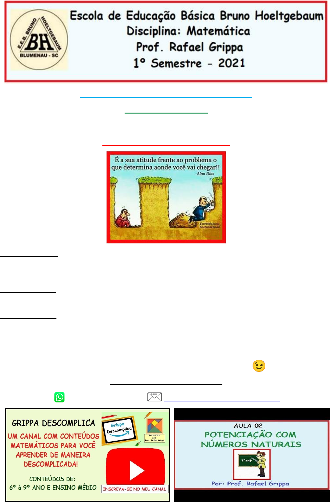 <p>CRONOGRAMA DA QUINZENA</p><p>29/03 À 09/04</p><p>CARGA HORÁRIA: 8 AULAS DE 45 MINUTOS (TOTAL: 6 HORAS)</p><p>Turmas: 6º Ano 01, 02 e 03</p><p>1º MOMENTO: Reflita sobre a mensagem acima. Não desista, lute, confie, acredite,</p><p>persista, determine-se, pois essas são as atitudes que podem fazer diferença em qualquer</p><p>área da sua vida. Pense nisso! Desejo a você uma excelente aula. Abraços e saúde!!!</p><p>2º MOMENTO: Faça a correção das atividades da semana anterior sobre Potenciação – Aula</p><p>01 no caderno. Todas as respostas estão na cor vermelha na página logo abaixo.</p><p>3º MOMENTO: Você deve copiar no seu caderno todo o conteúdo sobre Potenciação – Aula</p><p>02. A resolução explicativa desse conteúdo está disponível no vídeo do meu canal no Youtube</p><p>cujo link se encontra abaixo. É só clicar, visualizar e caso você tenha dúvidas procure assistir</p><p>a vídeoaula mais de uma vez, isso pode lhe ajudar. Qualquer coisa pode entrar em contato</p><p>comigo através do Google Classroom ou Whatsapp . Depois, realize todas as atividades no</p><p>caderno e caso você queira imprimir para colar também pode fazê-lo.</p><p>CONTATO DO PROFESSOR:</p><p>(47) 99695-7841 matematica.grippa@gmail.com</p><p>mailto:matematica.grippa@gmail.com</p><p>https://www.youtube.com/embed/lExNpW_AxyU?feature=oembed</p><p>CORREÇÃO DAS ATIVIDADES SOBRE POTENCIAÇÃO – AULA 01</p><p>1) Transforme as seguintes potenciações em multiplicações:</p><p>a) 13 = 1.1.1</p><p>b) 32 = 3.3</p><p>c) 44 = 4.4.4.4</p><p>d) 01 = 0</p><p>e) 57 = 5.5.5.5.5.5.5</p><p>f) 26 = 2.2.2.2.2.2</p><p>g) 65 = 6.6.6.6.6</p><p>h) 89 = 8.8.8.8.8.8.8.8.8</p><p>i) 93 = 9.9.9</p><p>j) 122 = 12.12</p><p>k) 213 = 21.21.21</p><p>l) 181 = 18</p><p>m) 237 = 23.23.23.23.23.23.23</p><p>n) 299 = 29.29.29.29.29.29.29.29.29</p><p>o) 424 = 42.42.42.42</p><p>p) 3310 = 33.33.33.33.33.33.33.33.33.33</p><p>q) 518 = 51.51.51.51.51.51.51.51</p><p>r) 672 = 67.67</p><p>s) 7311 = 73.73.73.73.73.73.73.73.73.73.73</p><p>t) 1011 = 101</p><p>u) 996 = 99.99.99.99.99.99</p><p>v) 1212 = 121.121</p><p>w) 1243 = 124.124.124</p><p>x) 1562 = 156.156</p><p>y) b4 = b.b.b.b</p><p>z) 2025 = 202.202.202.202.202</p><p>aa) 2788 = 278.278.278.278.278.278.278.278</p><p>bb) Δ5 = Δ. Δ. Δ. Δ. Δ</p><p>cc) 10232 = 1023.1023</p><p>dd) 12343 = 1234.1234.1234</p><p>__________________________________________________________________</p><p>2) Transforme as multiplicações em potências:</p><p>a) 2x2 = 22</p><p>b) 3x3x3 = 33</p><p>c) 1x1x1x1x1x1x1x1x1x1x1x1x1x1x1x1 = 116</p><p>d) 4x4x4x4 = 44</p><p>e) 0x0x0x0x0x0x0x0 = 08</p><p>f) 5x5x5x5x5x5x5 = 57</p><p>g) 11x11x11x11 = 114</p><p>h) 5x5x5x5x5x5 = 56</p><p>i) 8x8x8x8x8x8x8 = 87</p><p>j) 12x12x12x12x12x12 = 126</p><p>k) 7x7x7x7x7x7x7x7x7x7x7x7x7x7x7x7x7x7x7x7x7x7x7x7x7x7 = 726</p><p>l) 9x9x9x9x9x9x9x9x9x9 = 910</p><p>m) 9x9x9x9x9x9x9x9x9x9x9x9x9x9x9x9 = 916</p><p>n) 13x13x13x13x13x13x13 = 137</p><p>o) 8x8x8x8x8x8x8x8x8x8x8x8x8x8x8x8x8 = 817</p><p>p) 10 = 101</p><p>q) 15x15x15x15x15x15x15x15x15= 159</p><p>r) 21x21x21x21x21 = 215</p><p>s) 24x24x24x24x24x24x24 = 247</p><p>t) 5x5x5x5x5x5x5x5x5x5x5x5x5x5x5x5x5x5x5x5x5x5x5x5x5x5x5x5 = 528</p><p>u) 3x3x3x3x3x3x3x3x3x3x3x3x3 = 313</p><p>v) 36x36x36x36x36x36x36x36x36x36x36x36 = 3612</p><p>w) kxkxkxkxkxkxkxkxkxkxkxkxkxkxkxkxk= k17</p><p>x) 42x42 = 422</p><p>y) 56x56x56x56x56 = 565</p><p>z) 77x77x77x77x77x77x77 = 777</p><p>aa) 84x84x84x84x84x84 = 846</p><p>bb) x x x x x x x x x x x x x x x x = ☺17</p><p>cc) 891x891x891x891x891 = 8915</p><p>dd) 987x987x987x987x987x987x987x987x987 = 9879</p><p>3) Quais das multiplicações seguintes não é possível representar na forma de potenciação?</p><p>Apresente uma explicação:</p><p>a) 9x9x9 = 9³ b) 48 = 481 c) 7x6x4 = Não é possível d) 9x8x9x8 = 9² x 8²</p><p>4) Identificar base, expoente, potência e escrever a leitura das potências:</p><p>a) 72 = Base = 7, Expoente = 2, Leitura: Sete elevado a segunda potência.</p><p>b) 43 = Base = 4, Expoente = 3, Leitura: Quatro elevado a terceira potência.</p><p>c) 64 = Base = 6, Expoente = 4, Leitura: Seis elevado a quarta potência.</p><p>d) 25 = Base = 2, Expoente = 5, Leitura: Dois elevado a quinta potência.</p><p>e) 161 = Base = 16, Expoente = 1, Leitura: Dezesseis elevado a primeira potência.</p><p>f) 92 = Base = 9, Expoente = 2, Leitura: Nove elevado a segunda potência.</p><p>g) 210 = Base = 2, Expoente = 10, Leitura: Dois elevado a décima potência.</p><p>h) 112 = Base = 1, Expoente = 12, Leitura: Um elevado a décima segunda potência.</p><p>i) 121 = Base = 12, Expoente = 1, Leitura: Doze elevado a primeira potência.</p><p>j) 442 = Base = 44, Expoente = 2, Leitura: Quarenta e quatro elevado a segunda potência.</p><p>k) 123 = Base = 12, Expoente = 3, Leitura: Doze elevado a terceira potência.</p><p>l) 752 = Base = 75, Expoente = 2, Leitura: Setenta e cinco elevado a segunda potência.</p><p>m) 37 = Base = 3, Expoente = 7, Leitura: Três elevado a sétima potência.</p><p>n) 1002 = Base = 100, Expoente = 2, Leitura: Cem elevado a segunda potência.</p><p>o) 55 = Base = 5, Expoente = 5, Leitura: Cinco elevado a quinta potência.</p><p>5) Represente na forma de potenciação, identificando a base, o expoente e a potência:</p><p>a) Oito elevado à segunda potência:</p><p>8² = 8.8 = 64 Base = 8, Expoente = 2, Potência = 64</p><p>b) Dez elevado à terceira potência:</p><p>10³ = 10 . 10 . 10 = 1000 Base = 10, Expoente = 3, Potência = 1000</p><p>c) Dois elevado à oitava potência:</p><p>28 = 2.2.2.2.2.2.2.2 = 256 Base = 2, Expoente = 8, Potência = 256</p><p>d) Seis elevado à quarta potência:</p><p>64 = 6.6.6.6 = 1296 Base = 6, Expoente = 4, Potência = 1296</p><p>e) Quarenta e oito elevado à primeira potência:</p><p>481 = 48 Base = 48, Expoente = 1, Potência = 48</p><p>6) Numa multiplicação de fatores iguais temos 16x16, represente-a na forma de</p><p>potenciação e em seguida identifique sua base, seu expoente e sua potê