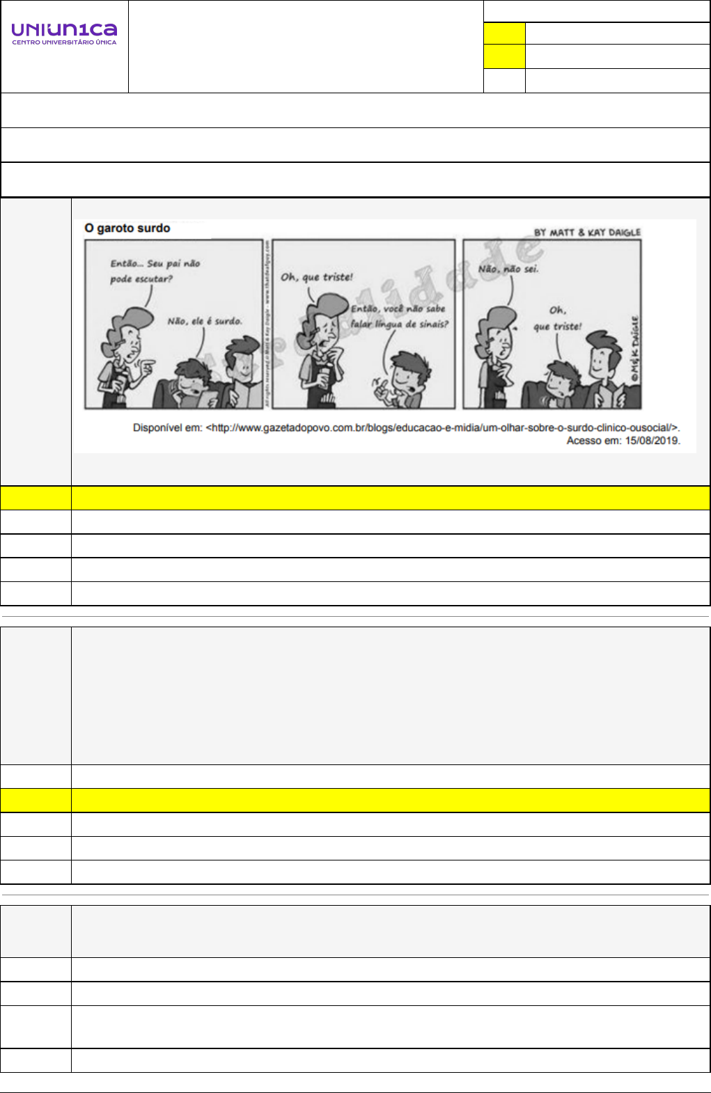 <p>Pincel Atômico - 03/10/2024 21:10:45 1/2</p><p>AMANDA TAHINARA</p><p>OLIVEIRA DE ARAUJO</p><p>Avaliação Online (SALA EAD) - Capitulos/Referencias 1,2,3</p><p>Atividade finalizada em 20/04/2024 13:51:24 (1820641 / 1)</p><p>LEGENDA</p><p>Resposta correta na questão</p><p># Resposta correta - Questão Anulada</p><p>X Resposta selecionada pelo Aluno</p><p>Disciplina:</p><p>LÍNGUA BRASILEIRA DE SINAIS - LIBRAS [198545] - Avaliação com 5 questões, com o peso total de 15,00 pontos [capítulos - 1,2,3]</p><p>Turma:</p><p>Graduação: Matemática - Grupo: DEZEMBRO-B/2020 - MAT [20639]</p><p>Aluno(a):</p><p>91188049 - AMANDA TAHINARA OLIVEIRA DE ARAUJO - Respondeu 5 questões corretas, obtendo um total de 15,00 pontos como nota</p><p>[362276_1492</p><p>52]</p><p>Questão</p><p>001</p><p>Observe a tirinha abaixo:</p><p>As opções que representam a surdez, opostas entre si e encontram-se na tirinha são:</p><p>X Deficiência como falta X minoria linguística.</p><p>Bimodalismo X oralismo.</p><p>Identidade ouvinte X identidade surda.</p><p>Oralização X bilinguismo.</p><p>Reabilitação X diferença cultural.</p><p>[362276_1492</p><p>59]</p><p>Questão</p><p>002</p><p>(Chapecó-SC, 2015 - Adaptada) Conforme a Lei n. 10.436, de 24 de abril de 2002, que</p><p>reconhece a Libras – Língua Brasileira de Sinais e outros recursos a ela associados, em</p><p>seu parágrafo único: “Entende-se como Língua Brasileira de Sinais – Libras, a forma de</p><p>comunicação e expressão, em que o sistema _______ de natureza _________, com</p><p>estrutura ________ própria, constituem um sistema linguístico de transmissão de</p><p>_______ e fatos, oriundos de comunidades de pessoas surdas do Brasil”. Complete as</p><p>lacunas, seguindo a ordem, com as palavras CORRETAS:</p><p>oral – gramatical – linguística - Libras</p><p>X linguístico - visual-motora - gramatical - ideias</p><p>visual-auditivo – gramatical - linguística – ideias</p><p>Libras – comunicação – ideias – ocorridos</p><p>línguas – brasileiras – sinais - Libras</p><p>[362276_1492</p><p>45]</p><p>Questão</p><p>003</p><p>Segundo Brito (1998), a Língua Brasileira de Sinais é</p><p>reconhecida como língua, mas inferior as línguas faladas.</p><p>não é reconhecida como língua sendo, portanto, uma linguagem.</p><p>não é reconhecida como língua devido aos seus aspectos fonológicos, morfológicos,</p><p>sintaxe, semântico, léxico e pragmático.</p><p>reconhecida como língua, mas não é oficial no Brasil.</p><p>Pincel Atômico - 03/10/2024 21:10:45 2/2</p><p>X</p><p>reconhecida como língua devido aos seus aspectos fonológicos, morfológicos, sintaxe,</p><p>semântico, léxico e pragmático.</p><p>[362277_1485</p><p>37]</p><p>Questão</p><p>004</p><p>No último século, predominou no campo da Educação de Surdos, uma ideologia em que</p><p>pesava uma visão clínica sobre o surdo e a surdez, sendo este tratado como deficiente.</p><p>Essa filosofia propunha aos surdos o aprendizado da língua oral, para que pudessem se</p><p>integrar entre o grupo linguisticamente majoritário. Esta ideologia dominante vem sendo</p><p>historicamente questionada, a partir de um novo olhar sobre a Surdez, que passa a ser</p><p>interpretada não mais como uma questão de deficiência, mas como uma questão</p><p>fundamentalmente epistemológica, que inscrevem esse debate num novo campo teórico</p><p>denominado Estudos Surdos em Educação. A este novo olhar sobre a Surdez, podemos</p><p>chamar de</p><p>X educação com bilinguismo.</p><p>conceito antropológico da surdez.</p><p>atendimento educacional especializado para surdos.</p><p>intervenção terapêutica.</p><p>concepção clínica da surdez.</p><p>[362278_1485</p><p>41]</p><p>Questão</p><p>005 Tendo como referência a charge, considere as alternativas que se comunicam com sua</p><p>proposição:</p><p>I – A charge mostra que o preconceito relacionado à língua de sinais ocorre porque a</p><p>maioria das pessoas acreditam que o surdo é mudo e em função disso tem um problema</p><p>de saúde e não uma identidade.</p><p>II – A charge mostra que quando se trata de LIBRAS, algumas pessoas não se</p><p>interessam porque desconhecem seu status de língua. Muitos pensam que as línguas</p><p>sinalizadas são meios para ajudar as pessoas surdas/mudas.</p><p>III – A charge mostra como, algumas pessoas, não possuem preconceito em relação às</p><p>pessoas surdas porque a acolhem na maioria das vezes sem distinção.</p><p>IV – A charge mostra como as pessoas conhecem LIBRAS e estão despreparadas para</p><p>usar seus sinais e por isso tem medo e vergonha de se aproximarem das pessoas</p><p>surdas. São verdadeiras as seguintes afirmações:</p><p>II, III.</p><p>IV, II.</p><p>X I , II.</p><p>II, IV.</p><p>III, I.</p>