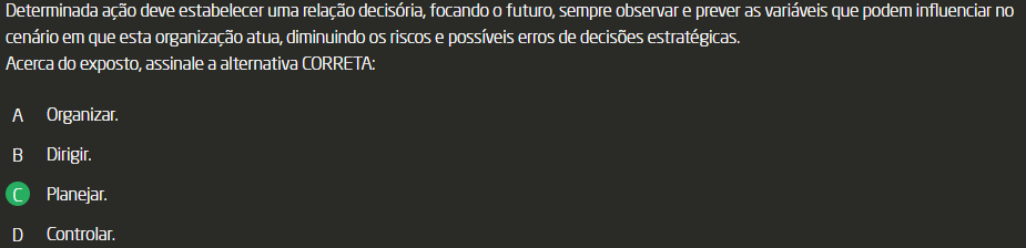 <p>Determinada ação deve estabelecer uma relação decisória, focando futuro, sempre observar e prever as variáveis que podem influenciar no cenário em que esta organização atua, diminuindo os riscos e possíveis erros de decisões estratégicas. Acerca do exposto, assinale a alternativa CORRETA: A Organizar. B Dirigir. Planejar. D Controlar.</p>