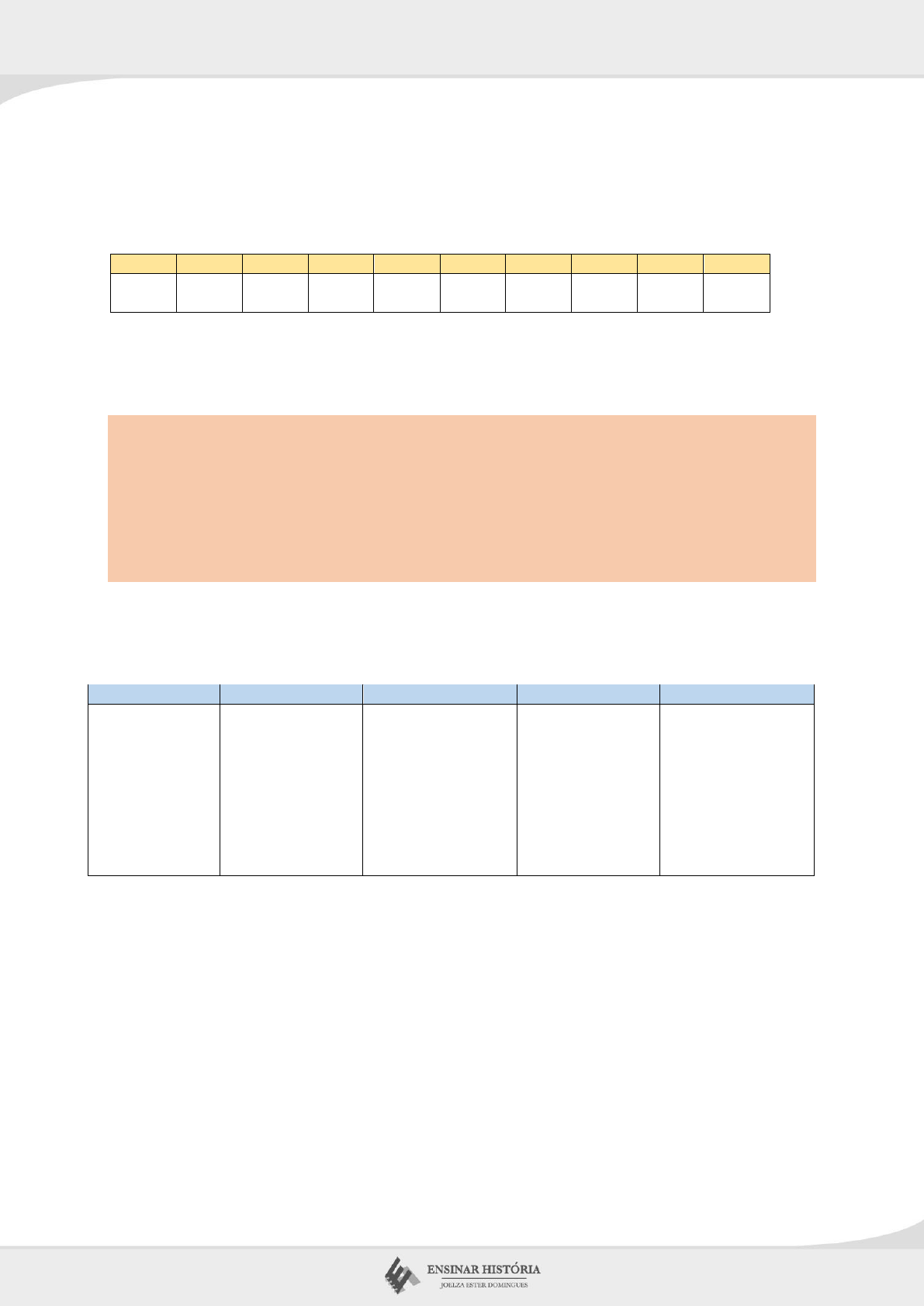 <p>NÚMEROS ROMANOS</p><p>NOME DO ALUNO __________________________________________________________________</p><p>ANO / TURMA _____________________________________________________________________________</p><p>1) A que números correspondem os algarismos romanos abaixo?</p><p>VIII IV XII XV XIV XI IX XIX XVI XXI</p><p>2) No texto abaixo, os séculos foram escritos de forma errada. Corrija as frases, colocando</p><p>os séculos em algarismos romanos. Use o espaço entre parêntesis para isso.</p><p>Quando o espanhol Cristóvão Colombo chegou à América, no século 15 ( ), encontrou populações</p><p>indígenas que habitavam as ilhas da América Central desde pelo menos o século 8 ( ).</p><p>O conquistador Fernão Cortez, no século 16 ( ), ao pisar no território do atual México, conheceu a</p><p>magnífica capital dos astecas fundada no século 14 ( ).</p><p>Já o conquistador Francisco Pizarro, ao chegar à América, no mesmo século de Cortez, tomou Cusco,</p><p>a capital inca fundada no atual Peru em meados do século 13 ( ).</p><p>3) Preencha a linha do tempo abaixo colocando em ordem cronológica os 6 fatos citados</p><p>no texto da questão 2.</p><p>VIII XIII XIV XV XVI</p><p>4) Citando os fatos marcados na linha de tempo acima (questão 3), faça o que se pede.</p><p>a) Escreva uma frase usando a palavra “anterior”.</p><p>--------------------------------------------------------------------------------------------------------------------------------------</p><p>b) Escreva uma frase usando a palavra “posterior”.</p><p>--------------------------------------------------------------------------------------------------------------------------------------</p><p>c) Escreva uma frase usando a palavra “contemporâneo(a)”.</p><p>--------------------------------------------------------------------------------------------------------------------------------------</p><p>NÚMEROS ROMANOS</p><p>5) Em que séculos ocorreram os fatos históricos abaixo?</p><p>2019 - Início da</p><p>pandemia de</p><p>Covid-19.</p><p>1498 - Vasco da</p><p>Gama atinge as</p><p>Índias.</p><p>1500 - Chegada de</p><p>Pedro Álvares</p><p>Cabral ao Brasil.</p><p>1694 - Destruição</p><p>do Quilombo de</p><p>Palmares.</p><p>30 a.C. - Morte de</p><p>Cleópatra, rainha</p><p>do Egito.</p><p>século:</p><p>século: século: século: século:</p><p>1889 - Proclamação</p><p>da República do</p><p>Brasil.</p><p>1088 - Primeira</p><p>universidade da</p><p>Europa.</p><p>2560 a.C. -</p><p>Pirâmide de</p><p>Queóps, no Egito.</p><p>622 - Início do</p><p>calendário</p><p>muçulmano.</p><p>79 d.C.- Destruição</p><p>de Pompeia pelo</p><p>Vesúvio.</p><p>século:</p><p>século: século: século: século:</p><p>6) Coloque os anos e séculos da questão anterior (5) em ordem cronológica, nos quadros</p><p>abaixo.</p><p>7) Coloque os fatos das questões anteriores (5 e 6) em seus respectivos períodos</p><p>históricos, preenchendo o friso cronológico abaixo.</p><p>IDADE ANTIGA IDADE MÉDIA IDADE MODERNA IDADE CONTEMPORÂNEA</p><p>▪</p><p>▪</p><p>▪</p><p>▪</p><p>▪</p><p>▪</p><p>▪</p><p>▪</p><p>▪</p><p>▪</p><p>AUTOAVALIAÇÃO (se necessário, use o espaço no verso para responder)</p><p>1) Qual foi a questão mais difícil de responder?</p><p>2) Qual foi a questão mais fácil?</p>