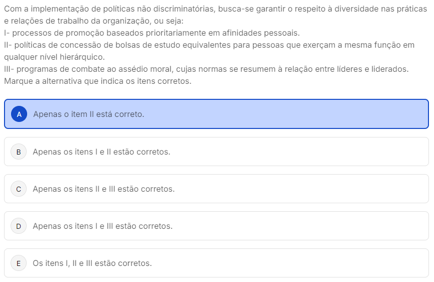 <p>Com a implementação de políticas não discriminatórias, busca-se garantir respeito à diversidade nas práticas e relações de trabalho da organização, ou seja: processos de promoção baseados prioritariamente em afinidades pessoais. II- políticas de concessão de bolsas de estudo equivalentes para pessoas que exerçam a mesma função em qualquer nível hierárquico. III- - programas de combate ao assédio moral, cujas normas se resumem à relação entre e liderados. Marque a alternativa que indica os itens corretos. A Apenas item está correto. B Apenas os itens I e II estão corretos. C Apenas os itens II e III estão corretos. D Apenas os itens I e III estão E Os itens I, II e III estão corretos.</p>