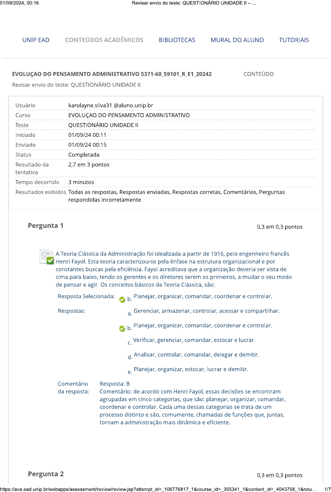 <p>01/09/2024, 00:16 Revisar envio do teste: QUESTIONÁRIO UNIDADE UNIP EAD CONTEÚDOS ACADÊMICOS BIBLIOTECAS MURAL DO ALUNO TUTORIAIS EVOLUÇAO DO PENSAMENTO ADMINISTRATIVO 5371-60_59101_R_E1_20242 CONTEÚDO Revisar envio do teste: QUESTIONÁRIO UNIDADE Usuário karolayne.silva31@aluno.unip.br Curso DO PENSAMENTO ADMINISTRATIVO Teste QUESTIONÁRIO UNIDADE Iniciado 01/09/24 00:11 Enviado 01/09/24 00:15 Status Completada Resultado da 2,7 em 3 pontos tentativa Tempo decorrido 3 minutos Resultados exibidos Todas as respostas, Respostas enviadas, Respostas corretas, Comentários, Perguntas respondidas incorretamente Pergunta 1 0,3 em 0,3 pontos A Teoria Clássica da Administração foi idealizada a partir de 1916, pelo engenheiro francês Henri Fayol. Esta teoria caracterizou-se pela ênfase na estrutura organizacional e por constantes buscas pela eficiência. Fayol acreditava que a organização deveria ser vista de cima para baixo, tendo os gerentes e os diretores serem os primeiros, a mudar o seu modo de pensar e agir. Os conceitos básicos da Teoria Clássica, são: Resposta Selecionada: b. Planejar, organizar, comandar, coordenar e controlar. Respostas: Gerenciar, armazenar, controlar, acessar e compartilhar. a. b. Planejar, organizar, comandar, coordenar e controlar. Verificar, gerenciar, comandar, estocar e lucrar. d. Analisar, controlar, comandar, delegar e demitir. Planejar, organizar, estocar, lucrar e demitir. e. Comentário Resposta: B da resposta: Comentário: de acordo com Henri Fayol, essas decisões se encontram agrupadas em cinco categorias, que são: planejar, organizar, comandar, coordenar e controlar. Cada uma dessas categorias se trata de um processo distinto e são, comumente, chamadas de funções que, juntas, tornam a administração mais dinâmica e eficiente. Pergunta 2 0,3 em 0,3 pontos</p><p>01/09/2024, 00:16 Revisar envio do teste: QUESTIONÁRIO UNIDADE A Teoria das Relações Humanas tem as suas origens nos Estados Unidos, como o resultado das experiências de Elton Mayo, denominadas de Experiências de Hawthorne. Originaram- se quando Mayo percebeu a necessidade de tornar a Administração mais humana e democrática, e quando as Ciências Humanas influenciaram as organizações. Sobre a Teoria das Relações Humanas analise as afirmações a seguir: I. Os estudos de Elton Mayo, criador desta teoria, mudou o foco do Homo economicus e o trabalhador passou a ser visto como Homo social. PORQUE II. A Teoria das Relações Humanas tenta mostrar que o homem não pode ser visto tão mecânico como nas Teorias Clássica e Científica. Sobre as afirmações anteriores é possível afirmar que: Resposta b. Selecionada: Ambas são verdadeiras e a afirmação é uma justificativa da I. Respostas: a. Ambas são verdadeiras, mas não estabelecem uma relação entre elas. b. Ambas são verdadeiras e a afirmação é uma justificativa da I. A afirmação é verdadeira e a é falsa. C. d. A afirmação é falsa e a é verdadeira. Ambas são falsas. e. Comentário Resposta: B da resposta: Comentário: enquanto a Administração Científica possuía a base de sua teoria, firmada no conceito de Homus economicus, para a Teoria das Relações Humanas a motivação econômica é secundária, para determinar a eficiência do trabalhador; ou seja, por essa última teoria as pessoas são motivadas pela necessidade de reconhecimento, de aprovação social e participação nas atividades. Assim, vigora, na teoria das Relações Humanas, o conceito de "homem social". Pergunta 3 0,3 em 0,3 pontos Uma agência de viagens passou por uma reestruturação em seu sistema de gestão e decidiu adotar um sistema agressivo de bonificação financeira para os colaboradores que atingissem a meta de vendas, pois o novo gestor acreditava que quanto mais fossem remunerados, mais se esforçariam para vender. Considerando esta visão do gestor, pode-se afirmar que ele adotou, na sua prática de gestão, qual modelo de Teoria da Administração? Resposta Selecionada: C. Científica. Respostas: a. Comportamentalista. 2/7</p><p>01/09/2024, 00:16 Revisar envio do teste: QUESTIONÁRIO UNIDADE b. Clássica. Científica. C. d. Toyotista. e. Relações Humanas. Comentário da Resposta: C resposta: Comentário: o enunciado diz que o gestor acreditava que, quanto mais fossem remunerados, mais se esforçariam para vender. Esta é uma prática da Teoria Científica, que segue o conceito do Homo economicus, ou seja, quanto mais bem remunerado for o trabalhador, mais motivado ele será. Pergunta 4 0,3 em 0,3 pontos A Administração Científica é um modelo de administração criado pelo americano Frederick Winslow Taylor, no fim do século XIX e no início do século XX, e que se baseia na aplicação do método científico na administração, com o intuito de garantir o melhor custo/benefício aos sistemas produtivos. Sobre a Administração Científica, analise as afirmações a seguir: I. A Teoria Científica, com ênfase nas estruturas, foi estruturada por Taylor; II. A empresa era vista como um sistema aberto, isto é, os indivíduos recebiam influências externas; III. Para Taylor, a eficiência do trabalho está ligada a se produzir o máximo com a maior economia possível de esforço. Sobre as afirmações anteriores são corretas: Resposta Selecionada: Apenas a III. C. Respostas: Apenas a I. a. b. Apenas a II. Apenas a III. C. d. Apenas a e a III. I, e III. Comentário da Resposta: C resposta: Comentário: I. Incorreta: a Teoria Científica, com ênfase nas tarefas, foi estruturada por Taylor; II. Incorreta: a empresa era vista como um sistema fechado, isto é, os indivíduos não recebiam influências externas; III. Correta: para Taylor, a eficiência do trabalho está ligada a se produzir o máximo com a maior economia possível de esforço. Pergunta 5 0,3 em 0,3 pontos 3/7</p><p>01/09/2024, 00:16 Revisar envio do teste: QUESTIONÁRIO UNIDADE Um dos assuntos mais discutidos na gestão empresarial é o salár