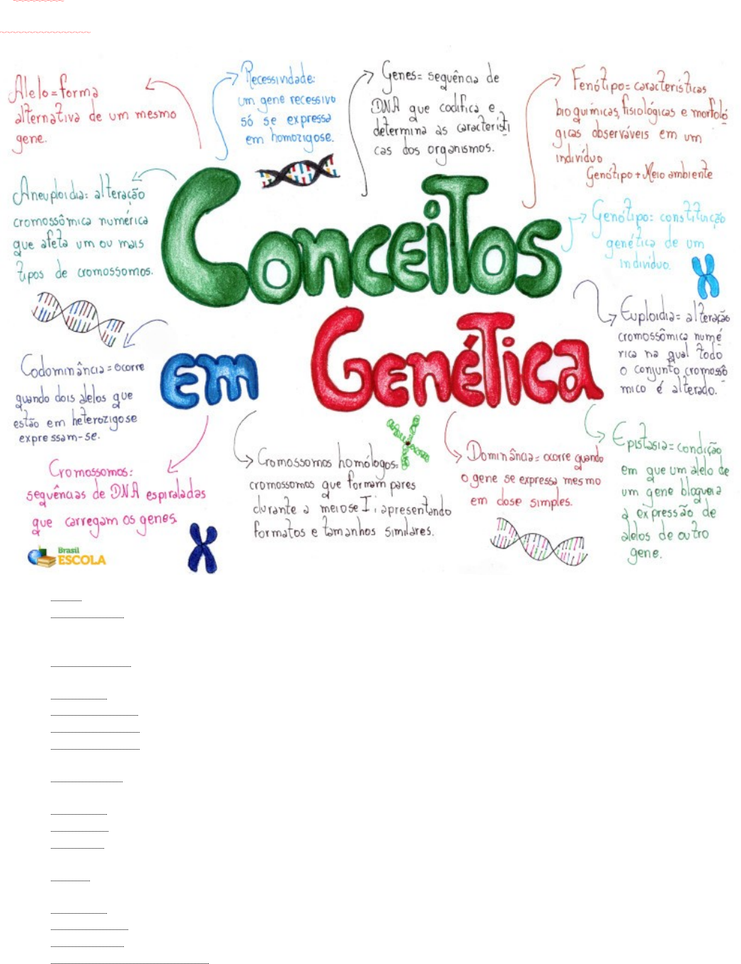 <p>Conceitos básicos em Genética</p><p>O entendimento de alguns conceitos básicos em Genética é fundamental para o estudo mais aprofundado dessa parte da Biologia que explica como os genes são transmitidos.</p><p>A Genética é uma parte da Biologia que estuda, principalmente, como ocorre a transmissão de características de um organismo aos seus descendentes. Sendo assim, podemos dizer, resumidamente, que ela é uma ciência que se volta para o estudo da hereditariedade, preocupando-se também com a análise dos genes.</p><p>·</p><p>· Alelo: Forma alternativa de um mesmo gene que ocupa o mesmo lócus em cromossomos homólogos.</p><p>· Aneuploidia: Alteração cromossômica numérica que afeta um ou mais tipos de cromossomos. O tipo mais comum de aneuploidia é a trissomia, em que há um cromossomo extra, ou seja, a pessoa apresenta 47 cromossomos, mas o padrão é 46.</p><p>· Autossômico: Dizemos que os cromossomos são autossômicos quando não são sexuais, ou seja, todos os cromossomos, exceto o X e o Y. No total, temos 22 pares de cromossomos autossômicos.</p><p>· Cariótipo: É a constituição cromossômica de um indivíduo.</p><p>· Codominância: Quando dois alelos que estão em heterozigose expressam-se.</p><p>· Cromossomos: sequências de DNA espiraladas que carregam os genes.</p><p>· Cromossomos homólogos: cromossomos que formam pares durante a meiose I, apresentando formato e tamanho similares e mesmo loci.</p><p>· Dominância: Um gene exerce dominância quando ele se expressa mesmo que em dose simples, ou seja, em heterozigose.</p><p>· Epistasia: Condição em que um alelo de um gene bloqueia a expressão dos alelos de outro gene.</p><p>· Euploidia: Alteração cromossômica numérica em que todo o conjunto cromossômico é alterado.</p><p>· Fenótipo: Características bioquímicas, fisiológicas e morfológicas observáveis em um indivíduo. O fenótipo é determinado pelo genótipo e pelo meio ambiente.</p><p>· Genes: Sequência de DNA que codifica e determina as características dos organismos. É a unidade fundamental da hereditariedade.</p><p>· Genótipo: Constituição genética de um organismo.</p><p>· Heterozigoto: Indivíduo que apresenta dois alelos diferentes em um mesmo lócus em cromossomos homólogos.</p><p>· Homozigoto: Indivíduo que apresenta o mesmo alelo em um mesmo lócus em cromossomos homólogos.</p><p>· Locus gênico (plural loci): Posição que um gene ocupa em um cromossomo.</p><p>· Recessividade: Um gene recessivo só se expressa em homozigose</p><p>image1.jpeg</p>