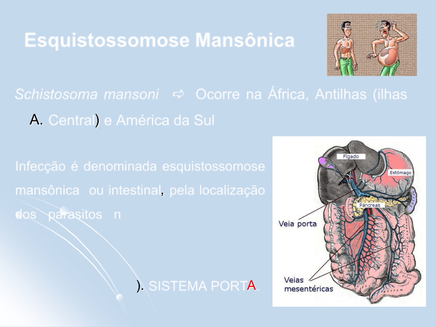 <p>Esquistossomose Mansônica</p><p>Schistosoma mansoni Ocorre na África, Antilhas (ilhas</p><p>A. Central) e América da Sul</p><p>Infecção é denominada esquistossomose</p><p>mansônica ou intestinal, pela localização</p><p>dos parasitos nas vênulas do plexo</p><p>hemorroidário superior e os ramos mais</p><p>finos das veias mesentéricas</p><p>(mesentérica inferior). SISTEMA PORTA.</p><p>- No Brasil, a doença é conhecida popularmente por xistossomose,</p><p>doença-dos-caramujos, moléstia de Pirajá da Silva (Bahia 1907-1908),</p><p>barriga d‘água. Manson - Sambon (Europa) Lutz (ciclo – Brasil)</p><p>- Gênero Biomphalaria (moluscos de água doce) - hospedeiros</p><p>intermediários do Schistosoma mansoni.</p><p>MORFOLOGIA – o estudo da morfologia deste parasita deve ser feito</p><p>observando suas fases evolutivas</p><p>Macho Mede 1 cm, cor esbranquiçada, corpo dividido em 2 porções</p><p>Fêmea Mede 1,5 cm, cor mais escura (sg semi digerido), corpo dividido em</p><p>2 porções anterior e corpo</p><p>Ovo Mede 150 X 60 μm, oval e apresenta lateralmente um espículo</p><p>voltado para trás. MADURO - miracídio</p><p>Miracídio Cilíndrico e ciliado</p><p>Esporocisto – tipo formado à partir da penetração miracídio no molusco</p><p>Cercária mede 500 μm, possuem 2 ventosas oral e ventral, corpo e</p><p>cauda bifurcada (vivem cerca de 8 a 12 horas ou um pouco mais)</p><p>Esquistossômulo Forma intermediária entre a cercária e forma adulta</p><p>ADULTOS</p><p>ventosas</p><p>Ovo</p><p>Miracídio (larva)</p><p>Cercária (larva)</p><p>TRANSMISSÃO</p><p>• Através da penetração ativa das cercárias na pele e</p><p>mucosas</p><p>Áreas mais atingidas pés e pernas</p><p>Locais de maior transmissão valas de irrigação,</p><p>açudes, pequenos córregos etc</p><p>CICLO BIOLÓGICO (heteroxênico)</p><p>HABITAT: vermes adultos vivem no sistema porta</p><p>vida média – 5 anos (pode ser maior)</p><p>Esporocistos → cercárias</p><p>Se os esquistossômulos</p><p>não forem destruídos na pele</p><p>ganham circulação - sistema</p><p>porta – vermes adultos</p><p>Miracídio → esporocisto</p><p>40-60 dias depois infecção - ovos</p><p>PATOGENIA</p><p>As alterações patológicas no hospedeiro definitivo são decorrentes:</p><p>• Ação mecânica resultante da migração dos parasitas pelos tecidos</p><p>• Reação do organismo ao parasita</p><p>• Secreção e excreção de substâncias antigênicas pelo parasita</p><p>FASE AGUDA</p><p>- Alterações cutâneas – local penetração cercária</p><p>- Alterações gerais – febre, linfadenopatia e urticária.</p><p>FASE CRÔNICA (dilatação veias, hipertensão portal e alterações</p><p>hemodinâmicas)</p><p>- Fibrose periportal – hipertensão sistema porta</p><p>- Ascite (acúmulo líquido – cav. abdominal) e</p><p>Hepatoesplenomegalia, Edema perif.</p><p>(alterações hemodinâmicas)</p><p>- Forma cadiopulmonar</p><p>- Formação granulomas em torno ovos parasita (como ovo vai outro lugar???)</p><p>Formação de granuloma, no fígado humano, em torno de ovo</p><p>de Schistosoma mansoni. Coloração: hematoxilina e eosina.</p><p>DIAGNÓSTICO DA ESQUISTOSSOMOSE MANSÔNICA</p><p>- Aspectos epidemiológicos – distribuição geográfica</p><p>- Clínico</p><p>- Laboratorial (parasitológico e não parasitológico)</p><p>• Parasitológico – pesquisa - encontro de ovos do parasita nas fezes ou</p><p>tecidos</p><p>Exame de fezes</p><p>Hoffman ou Lutz (sedimentação espontânea) e centrifugação</p><p>Kato-Katz (quantitativo - concentração por tamização)</p><p>Biópsia ou raspagem da mucosa retal</p><p>Kato-Katz</p><p>Hoffman</p><p>cerca 42 mg fezes 1/23 ou 1/24 de 1 grama</p><p>• Não parasitológicos</p><p>- Intradermo-reação (hipersensibilidade tipo I – Ag verme</p><p>adulto) – 15 a 20 minutos – pápula - Não tem sido utilizada</p><p>na prática</p><p>- Testes sorológicos – pesquisa Acs</p><p>Hemaglutinação indireta</p><p>IFI</p><p>ELISA (anticorpos ou antígenos)</p><p>- Moleculares: PCR – controle cura, pacientes com baixa</p><p>carga parasitária</p><p>(uso limitado)</p><p>FIM</p>