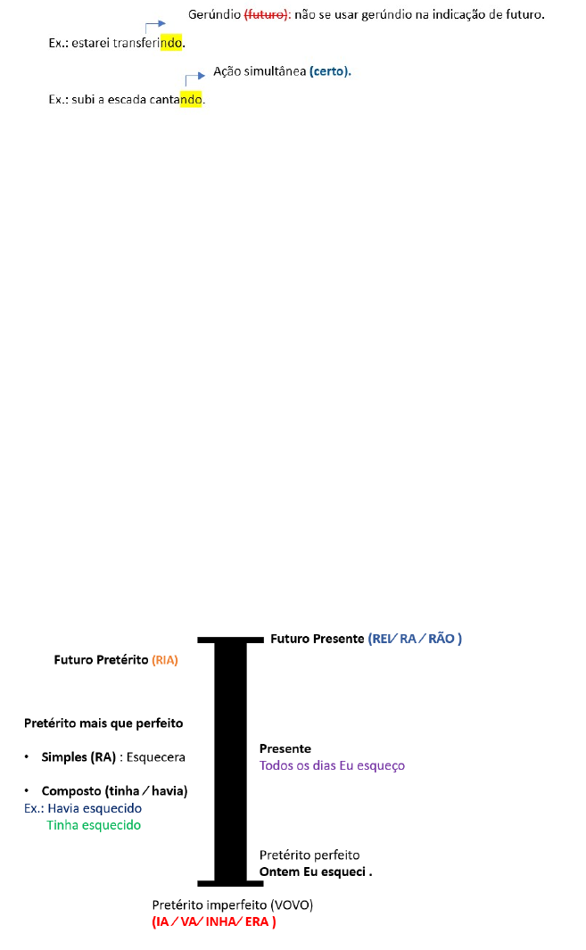 <p>Tempos e Modos Verbais</p><p>Verbo: ação, estado, desejo, fenômeno da natureza.</p><p>· Infinitivo: ar ∕er ∕ ir.</p><p>· Gerúndio: ndo.</p><p>· Particípio: ado ∕ ido.</p><p>· Simultaneidade tempo = Duas ações na frase que ocorrem ao mesmo tempo.</p><p>Ex.: Quando a TV anunciou o programa, ele se levantou. Causa ∕consequência.</p><p>Ex.: Feliz com a notícia, pulava, berrando. Ações simultânea.</p><p>Tempos verbais</p><p>· Presente</p><p>· Pretérito (Passado)</p><p>· Futuro</p><p>Modos Verbais</p><p>· Indicativo - exprime fatos, certezas. Exemplo: Discursa muito bem.</p><p>· Subjuntivo - exprime desejos, possibilidades, dúvidas, hipótese. Exemplo: Talvez discurse bem esta noite.</p><p>· Imperativo - exprime ordens, pedidos. Exemplo: Discurse como ele!</p><p>se eu pudesse (pretérito imperfeito do subjuntivo) , eu faria (futuro do pretérito)"</p><p>Haja: Presente do Subjuntivo, "A palavra “haja”, com H, é uma forma verbal do verbo “haver”,"</p><p>"uma conjugação no modo imperativo. É sinônimo da forma “exista”, podendo ser substituída por ela."</p><p>Barla321@</p><p>Apareça: Presente do Subjuntivo</p><p>No Brasil, a figura do promotor de justiça só surge em 1609, quando é regulamentado o Tribunal de Relação na Bahia.</p><p>No Brasil, a figura do promotor de justiça só surgiu em 1609, quando foi regulamentado o Tribunal de Relação na Bahia.</p><p>presente histórico = contar um fato no passado e trazer vivo nos dias atuais como se fosse presente.</p><p>image1.png</p><p>image2.png</p><p>image3.png</p><p>image4.png</p>