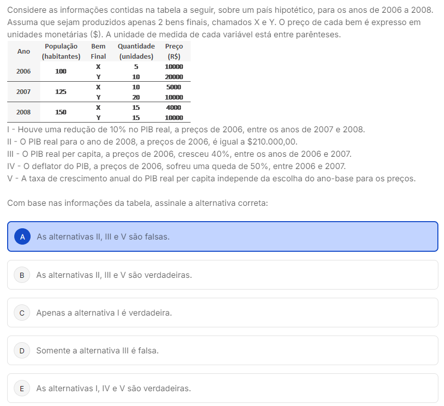 <p>Considere as informações contidas na tabela a seguir, sobre um país hipotético, para os anos de 2006 a 2008. Assuma que sejam produzidos apenas 2 bens finais, chamados X e preço de cada bem é expresso em unidades monetárias ($). A unidade de medida de cada variável está entre parênteses. População Bem Quantidade Preço Ano (habitantes) Final (unidades) (R$) 5 10000 2006 100 Y 10 20000 x 10 5000 2007 125 Y 20 10000 x 15 4000 2008 150 Y 15 10000 - Houve uma redução de 10% no PIB real, a preços de 2006, entre os anos de 2007 e 2008. - PIB real para ano de 2008, a preços de 2006, é igual a III - - PIB real per capita, a preços de 2006, cresceu entre os anos de 2006 e 2007. IV - - deflator do PIB, a preços de 2006, sofreu uma queda de entre 2006 e 2007. V - A taxa de crescimento anual do PIB real per independe da escolha do ano-base para os preços. Com base nas informações da tabela, assinale a alternativa correta: A As alternativas II, III e V são falsas. B As alternativas II, III e V são verdadeiras. C Apenas a alternativa é verdadeira. D Somente a alternativa III é falsa. E As alternativas I, IV e V são verdadeiras.</p>