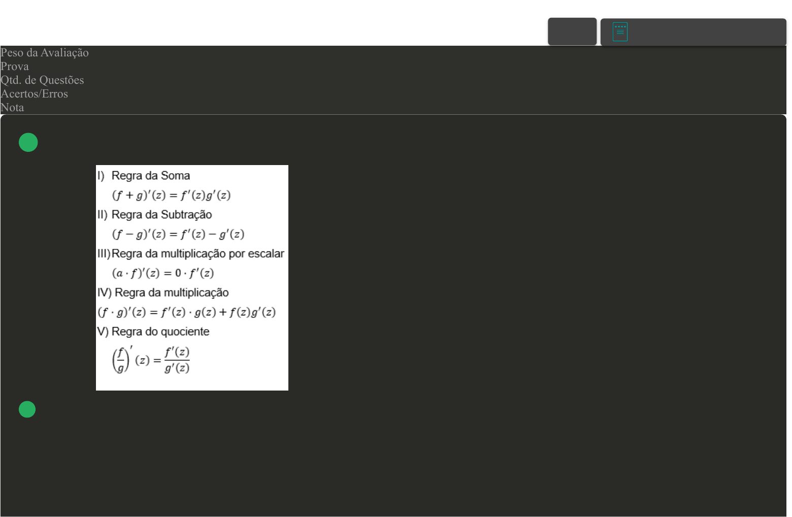 <p>Prova Impressa</p><p>GABARITO | Avaliação II - Individual (Cod.:992166)</p><p>Peso da Avaliação 2,00</p><p>Prova 86406906</p><p>Qtd. de Questões 10</p><p>Acertos/Erros 9/1</p><p>Nota 9,00</p><p>Considere um conjunto aberto dos números complexos, z um número complexo e f e g funções que são deriváveis em z. Quando realizamos</p><p>operações com essas funções, precisamos tomar alguns cuidados na hora de derivar. Analise as Regras de Derivação a seguir e determine se estão</p><p>corretas ou não.</p><p>A Apenas as regras da subtração e da multiplicação estão corretas.</p><p>B Apenas as regras da soma e da multiplicação por escalar estão corretas.</p><p>C Apenas as regras da multiplicação por escalar e do quociente estão corretas.</p><p>D Apenas as regras da soma e do quociente estão corretas.</p><p>VOLTAR</p><p>A+ Alterar modo de visualização</p><p>1</p><p>25/08/2024, 10:13 Avaliação II - Individual</p><p>about:blank 1/7</p><p>A regra de L'Hospital é uma regra utilizada para calcular de forma mais simples limites que são indeterminações do tipo 0 divido por 0 ou infinito</p><p>dividido por infinito; essa regra consiste em derivar o numerador e denominador de uma fração separadamente até que o limite seja possível de calcular.</p><p>Utilizando a Regra de L'Hospital, temos que</p><p>A Somente a opção III está correta.</p><p>B Somente a opção I está correta.</p><p>C Somente a opção IV está correta.</p><p>D Somente a opção II está correta.</p><p>Uma função é dita analítica se ela é derivável e para ser derivável a função precisa satisfazer as equações de Cauchy-Riemann. Considere uma</p><p>função f(z) = f(x, y) = u(x, y) + iv(x, y), sabendo que as equações de Cauchy-Riemann são</p><p>2</p><p>3</p><p>25/08/2024, 10:13 Avaliação II - Individual</p><p>about:blank 2/7</p><p>A É analítica, pois satisfaz as equações de Cauchy-Riemann.</p><p>B Não é analítica, pois não satisfaz apenas uma das equações de Cauchy-Riemann.</p><p>C Não é analítica, pois não satisfaz as equações de Cauchy-Riemann.</p><p>D É analítica, pois não satisfaz uma das equações de Cauchy-Riemann.</p><p>Considere uma função complexa f(z) = f(x, y) = u(x, y) + i v(x, y) com z a variável complexa dada por z = x + iy, u(x, y) a parte real da função f e</p><p>v(x, y) a parte imaginária de f. Sobre o exposto, classifique V para as sentenças verdadeiras e F para as falsas:</p><p>( ) A função f é derivável se existe as derivadas parciais de u e v e vale as equações de Cauchy-Riemann.</p><p>( ) Se f satisfazer as equações de Cauchy-Riemann, então f não é derivável.</p><p>( ) Se f e g são analíticas então nem a divisão nem a multiplicação de f por g é analítica.</p><p>( ) A função f é analítica no ponto z se ela é derivável em todos os pontos de alguma bola aberta centrada em z.</p><p>( ) A função f é dita inteira se seu domínio é todo o conjunto dos números complexos e f é derivável em todos do domínio.</p><p>Assinale a alternativa que apresenta a sequência CORRETA:</p><p>A V - V - F - V - F.</p><p>B F - V - V - F - F.</p><p>C V - F - F - V - V.</p><p>D F - F - V - F - V.</p><p>4</p><p>25/08/2024, 10:13 Avaliação II - Individual</p><p>about:blank 3/7</p><p>A integral de uma função complexa que está parametrizada segue as mesmas propriedades de integração de funções reais. O valor da integral</p><p>definida</p><p>A Somente a opção II está correta.</p><p>B Somente a opção I está correta.</p><p>C Somente a opção III está correta.</p><p>D Somente a opção IV está correta.</p><p>A derivada de uma função é utilizada em muitas aplicações e a definição de derivada só foi possível utilizando o conceito de limite. Analise as</p><p>expressões a seguir e determine qual delas representa a definição formal da derivada de primeira ordem de uma função complexa no ponto z:</p><p>5</p><p>Revisar Conteúdo do Livro</p><p>6</p><p>25/08/2024, 10:13 Avaliação II - Individual</p><p>about:blank 4/7</p><p>A Somente a opção II está correta.</p><p>B Somente a opção III está correta.</p><p>C Somente a opção IV está correta.</p><p>D Somente a opção I está correta.</p><p>A integral de uma função complexa que está parametrizada segue as mesmas propriedades de integração de funções reais. O valor da integral</p><p>definida</p><p>A</p><p>7</p><p>25/08/2024, 10:13 Avaliação II - Individual</p><p>about:blank 5/7</p><p>Somente a opção II está correta.</p><p>B Somente a opção I está correta.</p><p>C Somente a opção III está correta.</p><p>D Somente a opção IV está correta.</p><p>Usando as propriedades de funções harmônicas, podemos encontrar a parte imaginária de uma função analítica sabendo sua parte real. A parte</p><p>imaginária da função analítica que tem como parte real</p><p>A Somente a opção I está correta.</p><p>B Somente a opção II está correta.</p><p>C Somente a opção IV está correta.</p><p>D Somente a opção III está correta.</p><p>Um tanque está vazando água a uma taxa de R (t) galões por hora, em que t está em horas. Qual integral definida expressa a quantidade total de</p><p>água que vazou durante as primeiras duas horas?</p><p>A ∫02 R (t) dt</p><p>8</p><p>9</p><p>25/08/2024, 10:13 Avaliação II - Individual</p><p>about:blank 6/7</p><p>B ∫20R (t) dt</p><p>C ∫10 R (t) dt</p><p>D ∫01 R (t) dt</p><p>Usando as propriedades de funções harmônicas, podemos encontrar a parte imaginária de uma função analítica sabendo sua parte real. A parte</p><p>imaginária da função analítica que tem como parte real</p><p>A Somente a opção IV está correta.</p><p>B Somente a opção III está correta.</p><p>C Somente a opção I está correta.</p><p>D Somente a opção II está correta.</p><p>10</p><p>Imprimir</p><p>25/08/2024, 10:13 Avaliação II - Individual</p><p>about:blank 7/7</p>