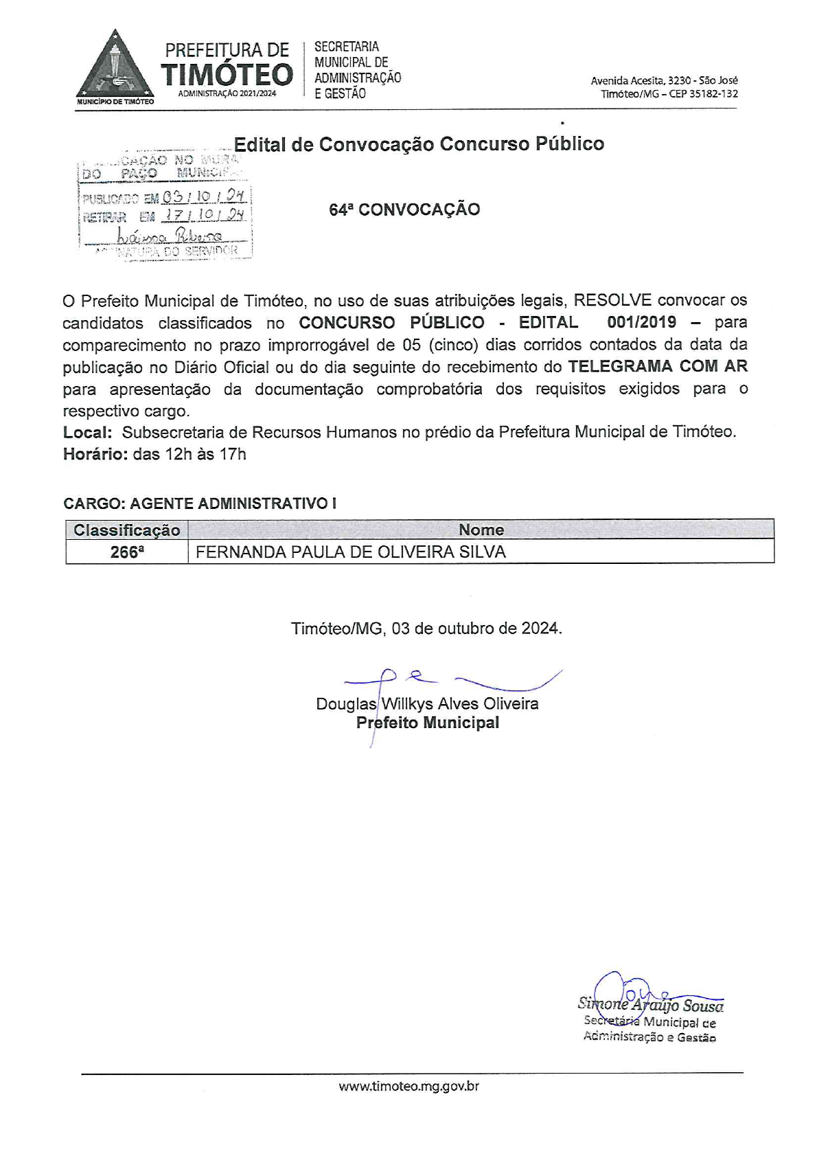 <p>PREFEITURA DE SECRETARIA TIMÓTEO MUNICIPAL DE ADMINISTRAÇÃO Avenida Acesita, 3230 São José ADMINISTRAÇÃO 2021/2024 E GESTÃO Timóteo/MG - CEP 35182-132 MUNICÍPIO DE TIMÓTEO Edital de Convocação Concurso Público CACAO NO MURA DO PACO PUBLICADO EM 03 / 10 / 24 EM 17 CONVOCAÇÃO SERVIDOR O Prefeito Municipal de Timóteo, no uso de suas atribuições legais, RESOLVE convocar os candidatos classificados no CONCURSO PÚBLICO - EDITAL 001/2019 - para comparecimento no prazo improrrogável de 05 (cinco) dias corridos contados da data da publicação no Diário Oficial ou do dia seguinte do recebimento do TELEGRAMA COM AR para apresentação da documentação comprobatória dos requisitos exigidos para o respectivo cargo. Local: Subsecretaria de Recursos Humanos no prédio da Prefeitura Municipal de Timóteo. Horário: das 12h às 17h CARGO: AGENTE ADMINISTRATIVO I Classificação Nome FERNANDA PAULA DE OLIVEIRA SILVA Timóteo/MG, 03 de outubro de 2024. Douglas/Willkys Alves Oliveira Prefeito Municipal Simone Araújo Sousa Secretária Municipal de Administração e Gestão www.timoteo.mg.gov.br</p>
