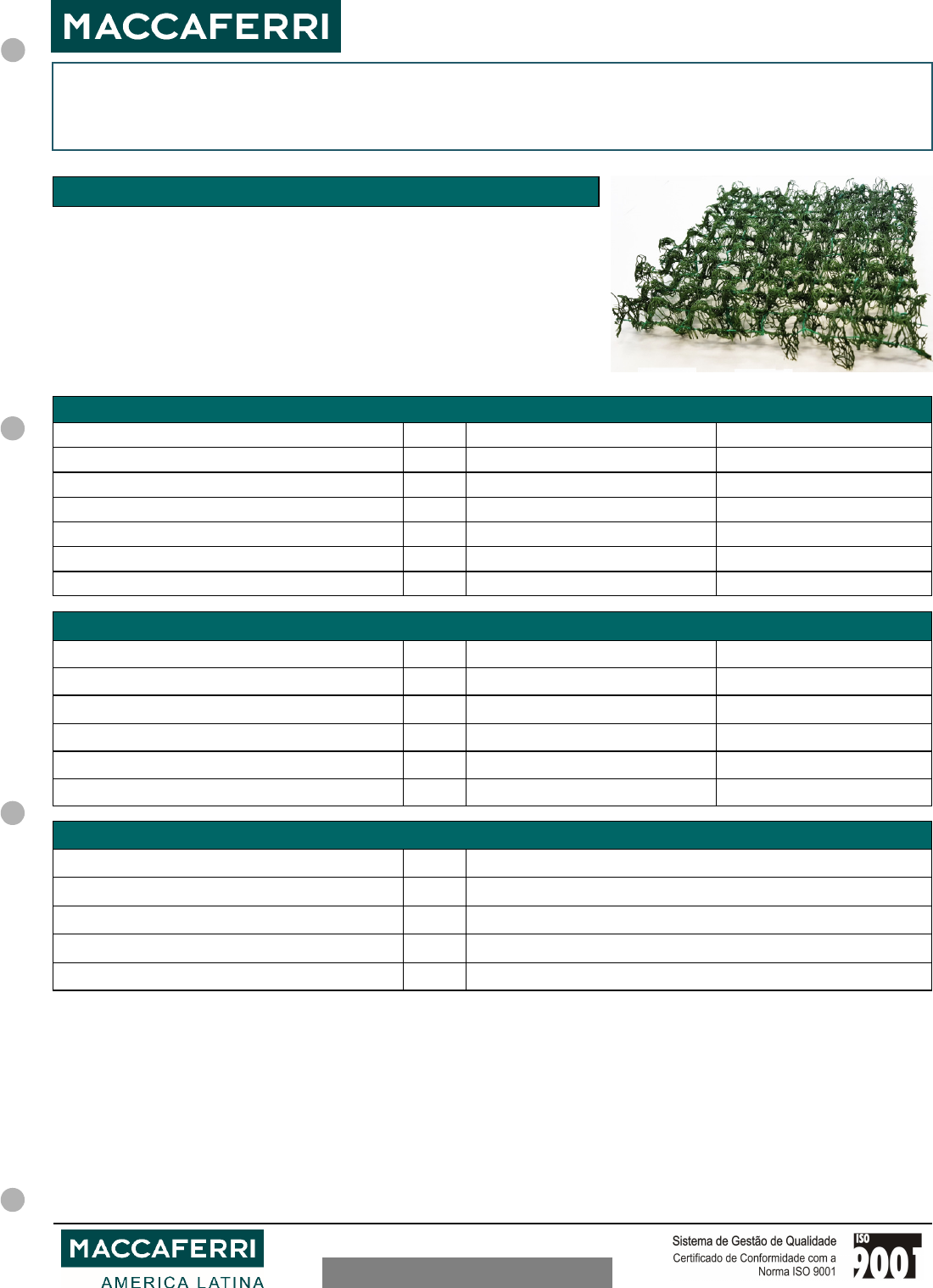 <p>ESPECIFICAÇÃO TÉCNICA</p><p>E-8.2.2-638 - rev. 02 ; Data 18.07.2019.</p><p>Características técnicas</p><p>A Maccaferri reserva-se o direito de revisar estas</p><p>especificações em qualquer momento, de acordo com as</p><p>características dos produtos fabricados.</p><p>w w w . m a c c a f e r r i . c o m / b r</p><p>MacMat</p><p>®</p><p>R3 004</p><p>Fibra GEOMANTA ANTIEROSIVA REFORÇADA</p><p>MacMat® R3 004 é uma geomanta antierosiva reforçada, fabricada a partir de</p><p>filamentos poliméricos fundidos em todos os pontos de contato. Apresenta</p><p>elevada flexibilidade, é tridimensional, apresentando mais de 90% de vazios.</p><p>Foi especialmente desenvolvida para o controle da erosão superficial em</p><p>taludes e cursos d’água.</p><p>Propriedades físicas da geomanta reforçada</p><p>Espessura nominal mm ASTM D5199 10</p><p>Gramatura g/m2 ASTM D5261 ≥400</p><p>Índice de vazios % >90</p><p>Cor(1) Verde</p><p>Polímero predominante Polietileno</p><p>Temperatura de fragilidade do polímero predominante °C ASTM D746 -35</p><p>Resistência UV do polímero predominante ASTM D4355 Estabilizado</p><p>Propriedades mecânicas da geomanta reforçada</p><p>Resistência à tração longitudinal kN/m ASTM D4595 ≥4</p><p>Alongamento na ruptura longitudinal % ASTM D4595 ≤30</p><p>Resistência à tração transversal kN/m ASTM D4595 ≥3</p><p>Alongamento na ruptura transversal % ASTM D4595 ≤30</p><p>Resistência ao rasgo longitudinal Kgf DIN 53.363 5±2</p><p>Resistência ao rasgo transversal Kgf DIN 53.363 5±2</p><p>(1) Cores preto e marrom disponíveis mediante consulta e solicitação prévia.</p><p>Os valores listados anteriormente correspondem a uma média de resultados encontrados em ensaios realizados em laboratórios.</p><p>Falta de cuidados na manipulação, armazenamento e transporte, podem alterar alguns desses resultados.</p><p>Apresentação: Em rolos</p><p>Largura m 2</p><p>Comprimento m 50</p><p>Área m² 100</p><p>Diâmetro médio m 0,68</p><p>Peso kg 40</p>