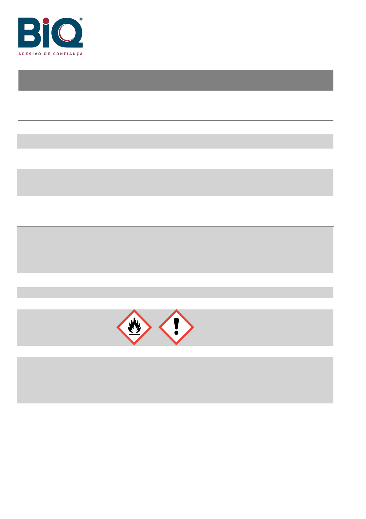 <p>FDS</p><p>Em conformidade com NBR 14725</p><p>FICHA COM DADOS DE SEGURANÇA FICHA COM DADOS DE SEGURANÇA</p><p>HALOGEM 804/14 PRIMER Produto:</p><p>Página: 1/10Data: 16/08/2023 Versão: 05</p><p>1 - IDENTIFICAÇÃO</p><p>Identificação do</p><p>produto:</p><p>HALOGEM 804/14 PRIMER</p><p>Usos recomendados do</p><p>produto químico e</p><p>restrições de uso:</p><p>Primer utilizado na preparação de materiais.</p><p>Detalhes do fornecedor: FORMILINE INDÚSTRIA DE LAMINADOS LTDA.</p><p>Endereço: Estrada Portão do Honda, 120, Rio Abaixo. CEP: 08694-080 - Brasil.</p><p>Telefone: (11) 4741-6301</p><p>Email: comunicacao@biqadesivos.com.br</p><p>Número do telefone de</p><p>emergência:</p><p>(11) 4741-6200</p><p>2 - IDENTIFICAÇÃO DE PERIGOS</p><p>Classificação da</p><p>substância ou mistura:</p><p>Líquidos inflamáveis - Categoria 2;</p><p>Toxicidade aguda - Oral - Categoria 4;</p><p>Toxicidade aguda - Dérmica - Categoria 4;</p><p>Corrosão/irritação da pele - Categoria 3;</p><p>Lesões oculares graves/irritação ocular - Categoria 2A;</p><p>Toxicidade para órgãos-alvo específicos - Exposição única - Categoria 3 - Narcótico;</p><p>Perigoso ao ambiente aquático - Agudo - Categoria 3.</p><p>Sistema de</p><p>classificação utilizado:</p><p>Norma ABNT-NBR 14725.</p><p>Sistema Globalmente Harmonizado para a Classificação e Rotulagem de Produtos Químicos, ONU.</p><p>Elementos de rotulagem do GHS, incluindo frases de precaução</p><p>Pictogramas:</p><p>Palavra de advertência: PERIGO</p><p>Frases de perigo: H225 Líquido e vapores altamente inflamáveis.</p><p>H302 Nocivo se ingerido.</p><p>H312 Nocivo em contato com a pele.</p><p>H316 Provoca irritação moderada à pele.</p><p>H319 Provoca irritação ocular grave.</p><p>H336 Pode provocar sonolência ou vertigem.</p><p>H402 Nocivo para os organismos aquáticos.</p><p>Frases de precaução: PREVENÇÃO:</p><p>P210 Mantenha afastado do calor, superfícies quentes, faíscas, chamas abertas e outras fontes de</p><p>ignição. Não fume.</p><p>P233 Mantenha o recipiente hermeticamente fechado.</p><p>P240 Aterre o vaso contentor e o receptor do produto durante transferências.</p><p>P241 Utilize equipamento elétrico, de ventilação e de iluminação à prova de explosão.</p><p>P242 Utilize apenas ferramentas antifaiscantes.</p><p>P243 Tomar medidas de precaução contra descargas eletrostáticas.</p><p>P261 Evite inalar poeiras/fumos/gases/névoas/vapores/aerossóis.</p><p>P264 Lave cuidadosamente após o manuseio.</p><p>P270 Não coma, beba ou fume durante a utilização deste produto.</p><p>P271 Utilize apenas ao ar livre ou em locais bem ventilados.</p><p>P273 Evite a liberação para o meio ambiente.</p><p>FDS</p><p>Em conformidade com NBR 14725</p><p>FICHA COM DADOS DE SEGURANÇA FICHA COM DADOS DE SEGURANÇA</p><p>HALOGEM 804/14 PRIMER Produto:</p><p>Página: 2/10Data: 16/08/2023 Versão: 05</p><p>P280 Use luvas de proteção, roupa de proteção, proteção ocular, proteção facial e proteção</p><p>auricular.</p><p>RESPOSTA À EMERGÊNCIA:</p><p>P301 + P312 EM CASO DE INGESTÃO: Em caso de mal-estar, contate um CENTRO DE</p><p>INFORMAÇÃO TOXICOLÓGICA ou médico.</p><p>P302 + P352 EM CASO DE CONTATO COM A PELE: Lave com água em abundância.</p><p>P303 + P361 + P353 EM CASO DE CONTATO COM A PELE (ou com cabelo): Retire</p><p>imediatamente toda a roupa contaminada. Enxague a pele com água ou tome uma ducha.</p><p>P304 + P340 EM CASO DE INALAÇÃO: Remova a pessoa para local ventilado e a mantenha em</p><p>repouso em uma posição que não dificulte a respiração.</p><p>P305 + P351 + P338 EM CASO DE CONTATO COM OS OLHOS: Enxague cuidadosamente com</p><p>água durante vários minutos. No caso de uso de lentes de contatos, remova-as, se for fácil.</p><p>Continue enxaguando.</p><p>P312 Em caso de mal-estar, contate um CENTRO DE INFORMAÇÃO TOXICOLÓGICA ou médico.</p><p>P321 Tratamento específico.</p><p>P330 Enxague a boca.</p><p>P332 + P313 Em caso de irritação cutânea: consulte um médico.</p><p>P337 + P313 Caso a irritação ocular persista: consulte um médico.</p><p>P362 + P364 Retire a roupa contaminada. Lave-a antes de usar novamente.</p><p>ARMAZENAMENTO:</p><p>P403 + P233 Armazene em local bem ventilado. Mantenha o recipiente hermeticamente fechado.</p><p>P403 + P235 Armazene em local bem ventilado. Mantenha em local fresco.</p><p>P405 Armazene em local fechado à chave.</p><p>DISPOSIÇÃO:</p><p>P501 Descarte o conteúdo e o recipiente em conformidade com as regulamentações locais.</p><p>Outros perigos que não</p><p>resultam em uma</p><p>classificação:</p><p>O produto não possui outros perigos.</p><p>3 - COMPOSIÇÃO E INFORMAÇÕES SOBRE OS INGREDIENTES</p><p>MISTURA HALOGEM 804/14 PRIMER - Primer bi-componente.</p><p>Ingredientes,</p><p>impurezas e/ou aditivos</p><p>estabilizantes que</p><p>contribuem para o</p><p>perigo:</p><p>Acetato de etila (CAS 141-78-6): 30,0 - 50,0 %;</p><p>Acetona (CAS 67-64-1): 30,0 - 50,0 %;</p><p>Ácido tricloroisocianúrico (CAS 87-90-1): 1,0 - 10,0 %.</p><p>4 - MEDIDAS DE PRIMEIROS-SOCORROS</p><p>Inalação: Remova a vítima para local ventilado e a mantenha em repouso numa posição que não dificulte a</p><p>respiração. Caso sinta indisposição, contate um CENTRO DE INFORMAÇÃO TOXICOLÓGICA ou</p><p>um médico. Leve esta documento.</p><p>Contato com a pele: Lave a pele exposta com quantidade suficiente de água para remoção do material. Remova e isole</p><p>roupas e sapatos contaminados. Em caso de irritação cutânea: Consulte um médico. Leve esta</p><p>documento.</p><p>Contato com os olhos: Enxágue cuidadosamente com água durante vários minutos. No caso de uso de lentes de contato,</p><p>remova-as, se for fácil. Continue enxaguando. Caso a irritação ocular persista: consulte um médico.</p><p>Leve esta documento.</p><p>Ingestão: Não induza o vômito. Nunca forneça algo por via oral a uma pessoa inconsciente. Lave a boca da</p><p>vítim