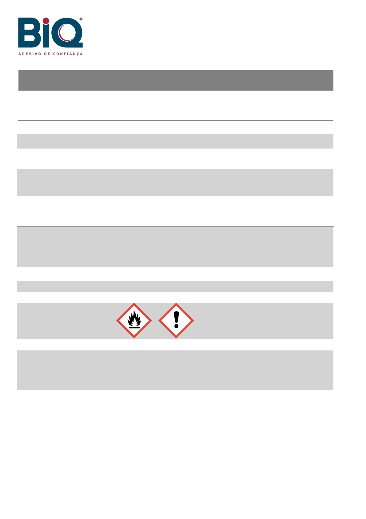 <p>FDS</p><p>Em conformidade com NBR 14725</p><p>FICHA COM DADOS DE SEGURANÇA FICHA COM DADOS DE SEGURANÇA</p><p>ADESIVOS PVC 510 ST SPRAY Produto:</p><p>Página: 1/9Data: 24/08/2023 Versão: 07</p><p>1 - IDENTIFICAÇÃO</p><p>Identificação do</p><p>produto:</p><p>ADESIVOS PVC 510 ST SPRAY</p><p>Usos recomendados do</p><p>produto químico e</p><p>restrições de uso:</p><p>Colagens em geral.</p><p>Detalhes do fornecedor: FORMILINE INDÚSTRIA DE LAMINADOS LTDA.</p><p>Endereço: Estrada Portão do Honda, 120, Rio Abaixo. CEP: 08694-080 - Brasil.</p><p>Telefone: (11) 4741-6301</p><p>Email: comunicacao@biqadesivos.com.br</p><p>Número do telefone de</p><p>emergência:</p><p>(11) 4741-6200</p><p>2 - IDENTIFICAÇÃO DE PERIGOS</p><p>Classificação da</p><p>substância ou mistura:</p><p>Líquidos inflamáveis - Categoria 2;</p><p>Toxicidade aguda - Oral - Categoria 5;</p><p>Corrosão/irritação da pele - Categoria 3;</p><p>Lesões oculares graves/irritação ocular - Categoria 2A;</p><p>Sensibilização da pele - Categoria 1B;</p><p>Toxicidade para órgãos-alvo específicos - Exposição única - Categoria 3 - Narcótico.</p><p>Sistema de</p><p>classificação utilizado:</p><p>Norma ABNT-NBR 14725.</p><p>Sistema Globalmente Harmonizado para a Classificação e Rotulagem de Produtos Químicos, ONU.</p><p>Elementos de rotulagem do GHS, incluindo frases de precaução</p><p>Pictogramas:</p><p>Palavra de advertência: PERIGO</p><p>Frases de perigo: H225 Líquido e vapores altamente inflamáveis.</p><p>H303 Pode ser nocivo se ingerido.</p><p>H316 Provoca irritação moderada à pele.</p><p>H317 Pode provocar reações alérgicas na pele.</p><p>H319 Provoca irritação ocular grave.</p><p>H336 Pode provocar sonolência ou vertigem.</p><p>Frases de precaução: PREVENÇÃO:</p><p>P210 Mantenha afastado do calor, superfícies quentes, faíscas, chamas abertas e outras fontes de</p><p>ignição. Não fume.</p><p>P233 Mantenha o recipiente hermeticamente fechado.</p><p>P240 Aterre o vaso contentor e o receptor do produto durante transferências.</p><p>P241 Utilize equipamento elétrico, de ventilação e de iluminação à prova de explosão.</p><p>P242 Utilize apenas ferramentas antifaiscantes.</p><p>P243 Tomar medidas de precaução contra descargas eletrostáticas.</p><p>P261 Evite inalar poeiras/fumos/gases/névoas/vapores/aerossóis.</p><p>P264 Lave cuidadosamente após o manuseio.</p><p>P271 Utilize apenas ao ar livre ou em locais bem ventilados.</p><p>P272 A roupa de trabalho contaminada não pode sair do local de trabalho.</p><p>P280 Use luvas de proteção, roupa de proteção, proteção ocular, proteção facial e proteção</p><p>auricular.</p><p>FDS</p><p>Em conformidade com NBR 14725</p><p>FICHA COM DADOS DE SEGURANÇA FICHA COM DADOS DE SEGURANÇA</p><p>ADESIVOS PVC 510 ST SPRAY Produto:</p><p>Página: 2/9Data: 24/08/2023 Versão: 07</p><p>RESPOSTA À EMERGÊNCIA:</p><p>P301 + P312 EM CASO DE INGESTÃO: Em caso de mal-estar, contate um CENTRO DE</p><p>INFORMAÇÃO TOXICOLÓGICA ou médico.</p><p>P302 + P352 EM CASO DE CONTATO COM A PELE: Lave com água em abundância.</p><p>P303 + P361 + P353 EM CASO DE CONTATO COM A PELE (ou com cabelo): Retire</p><p>imediatamente toda a roupa contaminada. Enxague a pele com água ou tome uma ducha.</p><p>P304 + P340 EM CASO DE INALAÇÃO: Remova a pessoa para local ventilado e a mantenha em</p><p>repouso em uma posição que não dificulte a respiração.</p><p>P305 + P351 + P338 EM CASO DE CONTATO COM OS OLHOS: Enxague cuidadosamente com</p><p>água durante vários minutos. No caso de uso de lentes de contatos, remova-as, se for fácil.</p><p>Continue enxaguando.</p><p>P312 Em caso de mal-estar, contate um CENTRO DE INFORMAÇÃO TOXICOLÓGICA ou médico.</p><p>P321 Tratamento específico.</p><p>P332 + P313 Em caso de irritação cutânea: consulte um médico.</p><p>P333 + P313 Em caso de irritação ou erupção cutânea: consulte um médico.</p><p>P337 + P313 Caso a irritação ocular persista: consulte um médico.</p><p>P362 + P364 Retire a roupa contaminada. Lave-a antes de usar novamente.</p><p>ARMAZENAMENTO:</p><p>P403 + P233 Armazene em local bem ventilado. Mantenha o recipiente hermeticamente fechado.</p><p>P403 + P235 Armazene em local bem ventilado. Mantenha em local fresco.</p><p>P405 Armazene em local fechado à chave.</p><p>DISPOSIÇÃO:</p><p>P501 Descarte o conteúdo e o recipiente em conformidade com as regulamentações locais.</p><p>Outros perigos que não</p><p>resultam em uma</p><p>classificação:</p><p>O produto não possui outros perigos.</p><p>3 - COMPOSIÇÃO E INFORMAÇÕES SOBRE OS INGREDIENTES</p><p>MISTURA ADESIVOS PVC 510 ST SPRAY - Adesivo de contato termoreativo à base de poliuretano, aditivos e</p><p>solventes orgânicos.</p><p>Ingredientes,</p><p>impurezas e/ou aditivos</p><p>estabilizantes que</p><p>contribuem para o</p><p>perigo:</p><p>Acetona (CAS 67-64-1): 50,0 - 70,0 %;</p><p>Acetato de etila (CAS 141-78-6): 10,0 - 30,0 %.</p><p>4 - MEDIDAS DE PRIMEIROS-SOCORROS</p><p>Inalação: Remova a vítima para local ventilado e a mantenha em repouso numa posição que não dificulte a</p><p>respiração. Caso sinta indisposição, contate um CENTRO DE INFORMAÇÃO TOXICOLÓGICA ou</p><p>um médico. Leve esta documento.</p><p>Contato com a pele: Lave a pele exposta com quantidade suficiente de água para remoção do material. Remova e isole</p><p>roupas e sapatos contaminados. Em caso de irritação cutânea: Consulte um médico. Leve esta</p><p>documento.</p><p>Contato com os olhos: Enxágue cuidadosamente com água durante vários minutos. No caso de uso de lentes de contato,</p><p>remova-as, se for fácil. Continue enxaguando. Caso a irritação ocular persista: consulte um médico.</p><p>Leve esta documento.</p><p>Ingestão: Não induza o vômito. Nunca forneça algo por via oral a uma pessoa inconsciente. Lave a boca da</p><p>vítima com água em abundância. Caso sinta indisposição, contate um CENTRO DE INFOR