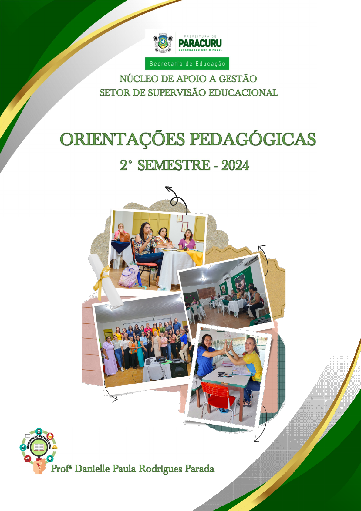 <p>2</p><p>Prezado(a) Supervisor(a),</p><p>É hora de pensar o planejamento para o 2º semestre!</p><p>Agora é hora de rever o que fizemos e as metas que conseguimos atingir para</p><p>redirecionar ações, buscar outras ou mesmo manter aquelas que estão apresentando bons</p><p>resultados. Para isso, devemos fazer uma avaliação do nosso trabalho durante todo o semestre</p><p>que passou.</p><p>Pensando nisso, a Secretaria Municipal de Educação de Paracuru, por intermédio do</p><p>Núcleo de Apoio a Gestão – Setor de Supervisão Educacional apresenta algumas orientações</p><p>pedagógicas gerais para o 2° semestre letivo de 2024, com o propósito de alinhar as práticas</p><p>pedagógicas a serem desenvolvidas nas unidades escolares, oferecendo suporte aos</p><p>supervisores no planejamento das atividades do período.</p><p>As sugestões contidas no material têm como característica dar uma intencionalidade</p><p>pedagógica em todas as ações voltadas para o desenvolvimento do aprendizado que</p><p>proporcionem uma educação de qualidade e equitativa a todos os estudantes da rede</p><p>municipal promovendo, assim, uma clareza nas ações pedagógicas e metodológicas que</p><p>continuarão a apoiar os professores e estudantes ao longo do 2° semestre letivo.</p><p>Com o plano de ação em mãos, o currículo, seus planejamentos e os registros</p><p>realizados durante o percurso do 1° semestre, é hora de focar o olhar para o que ainda é</p><p>necessário ser revisto. Para isso, abordamos três aspectos a serem observados que poderão</p><p>contribuir para a sua reflexão: AVALIAÇÃO, INTERVENÇÃO e ACOMPANHAMENTO.</p><p>Esperamos que o material contribua para o aprimoramento do trabalho da equipe de</p><p>supervisores educacionais, que são os grandes maestros das ações pedagógicas desenvolvidas</p><p>nas escolas da rede municipal de Paracuru.</p><p>Atenciosamente,</p><p>Profª Danielle Paula Rodrigues Parada</p><p>COORDENAORA DO SETOR DE SUPERVISÃO EDUCACIONAL</p><p>3</p><p>1. Acompanhamento pedagógico e Supervisão Educacional................................... 04</p><p>2. Acompanhamento a partir de instrumentos avaliativos...................................... 06</p><p>2.1. Diagnósticos.............................................................................................. 07</p><p>2.2. Avaliações Internas (Bimestrais)............................................................... 09</p><p>2.3. Avaliações Externas.................................................................................. 10</p><p>3. Instrumentos de acompanhamento..................................................................... 11</p><p>3.1. Instrumentos de registro.......................................................................... 13</p><p>3.1.1. Cadernos Pedagógicos de acompanhamento e planejamento.......... 14</p><p>3.2. Sistemas de Acompanhamento................................................................ 15</p><p>SISP.............................................................................................................. 15</p><p>SIGE............................................................................................................. 16</p><p>SAAP............................................................................................................ 16</p><p>Diário Online............................................................................................... 17</p><p>APROVA Brasil............................................................................................. 17</p><p>4. Acompanhamento das intervenções pedagógicas................................................ 18</p><p>4.1. Projetos e ações de recomposição........................................................... 18</p><p>4.1.1. Adaptação curricular......................................................................... 18</p><p>4.1.2. Projetos de sala................................................................................. 19</p><p>4.1.3. Intervenções para a recomposição de aprendizagem....................... 19</p><p>4.2. Acompanhamento de Frequência e Busca ativa....................................... 20</p><p>4.3. Acompanhamento de Recuperação bimestral e Conselho de classe........ 20</p><p>5. Sugestões para iniciar o 2º semestre letivo.......................................................... 21</p><p>4</p><p>O acompanhamento pedagógico é uma das principais funções da equipe supervisora.</p><p>Essa ação visa desde a identificação de dificuldades, estudo de resultados até a verificação se</p><p>as metas educacionais estão sendo atingidas. É a forma como o supervisor chega até ao aluno,</p><p>através do processo de ensino compartilhado com o professor.</p><p>Mais do que nunca este é o momento dos Supervisores Educacionais se colocarem</p><p>como verdadeiros parceiros dos professores, apoiandoos nas suas diversas dificuldades para</p><p>construção de propostas e experiências que auxiliem no seu desenvolvimento profissional e no</p><p>aprimoramento de suas práticas de ensino.</p><p>Depois de um primeiro semestre tão complexo, julho é o mês que iremos usar para</p><p>consolidar o balanço dos últimos seis meses e traçar estratégias para o período seguinte. Os</p><p>desafios relacionados à recomposição das aprendizagens devem continuar presentes e ser</p><p>prioridade.</p><p>Para a realização de um acompanhamento pedagógico efetivo, devem ser utilizados</p><p>instrumentos e metodologias que abranjam as dimensões abaixo:</p><p>•Recomposição</p><p>•Reforço</p><p>•Busca ativa</p><p>•Sistemas</p><p>•Instrumentais</p><p>•Observação</p><p>•Coleta de dados</p><p>•Estudo</p><p>•Comparativo</p><p>•Metas</p><p>•Diagnósticos</p><p>•Internas</p><p>•Externas</p><p>•Autoavaliação</p><p>5</p><p>O trabalho da Supervisão Educacional no acompanhamento pedagógico tem o objetivo</p><p>de obt