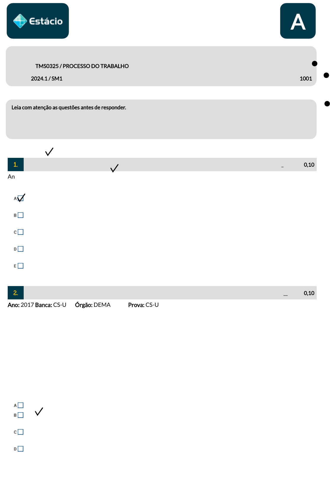 <p>6984276015 A</p><p>16/04/2024 18:40</p><p>Nome: Matrícula: ________________</p><p>Disciplina: TMS0325 / PROCESSO DO TRABALHO Data: ___ /___ /______</p><p>Período: 2024.1 / SM1 Turma: 1001</p><p>Leia com atenção as questões antes de responder.</p><p>É proibido o uso de equipamentos eletrônicos portáteis e consulta a materiais de qualquer natureza durante a realização da prova.</p><p>Boa prova.</p><p>1. _______ de 0,10</p><p>Analise as seguintes proposições sobre o jus postulandi e ao �nal com base na legislação, jurisprudência paci�cada e</p><p>doutrina predominante aponte a alternativa correta:</p><p>O jus postulandi das partes pode ser exercido perante o TST na hipótese de quaisquer ações de competência</p><p>originária daquele tribunal, como a ação rescisória, o mandado de segurança e os dissídios coletivos;</p><p>O jus postulandi das partes limita-se às Varas do Trabalho e aos Tribunais Regionais do Trabalho, não alcançando</p><p>os recursos de competência do Tribunal Superior do Trabalho;</p><p>O jus postulandi é inconstitucional, diante do artigo 133 da CF que prevê o advogado como indispensável à</p><p>administração da justiça.</p><p>Uma vez que as partes possuem jus postulandi podem ajuizar qualquer tipo de ação perante a Justiça do Trabalho,</p><p>independentemente da constituição de advogado para representá-las em juízo;</p><p>O jus postulandi pode ser exercido tanto pelo empregado quanto pelo empregador pessoa física, mas não pelas</p><p>pessoas jurídicas;</p><p>2. _______ de 0,10</p><p>Ano: 2017 Banca: CS-UFG Órgão: DEMAE - GO Prova: CS-UFG - 2017 - DEMAE - GO - Procurador Autárquico</p><p>Lei o caso a seguir.</p><p>R. S., nascido em Salvador ¿ BA e residente em Caldas Novas ¿ GO, celebrou na cidade de Itumbiara ¿ GO um contrato de</p><p>trabalho com a empresa Lua Cheia, com sede no município de São Luiz dos Montes Belos ¿ GO, para trabalhar na cidade de</p><p>Porangatu ¿ GO.</p><p>A Consolidação das Leis do Trabalho estabelece regras claras quanto à competência territorial a ser observada em possíveis</p><p>con�itos de interesses exsurgidos da relação de emprego. Nesses termos, considerando o caso relatado,</p><p>sem respostas</p><p>a Vara do Trabalho da cidade de Itumbiara, local da celebração do contrato de trabalho, terá a competência</p><p>territorial para processar e julgar qualquer Reclamação Trabalhista decorrente da relação empregatícia</p><p>o juízo da Vara do Trabalho da cidade de Salvador, local onde o empregado hipossu�ciente nasceu, será</p><p>competente para processar e julgar a lide decorrente da relação empregatícia.</p><p>o empregado poderá optar entre a Vara do Trabalho do seu domicílio ou a Vara do Trabalho da sede da empresa,</p><p>para protocolizar Reclamação Trabalhista decorrente da relação empregatícia.</p><p>55819</p><p>Máquina de escrever</p><p>202008444853</p><p>55819</p><p>Máquina de escrever</p><p>23</p><p>55819</p><p>Máquina de escrever</p><p>04</p><p>55819</p><p>Máquina de escrever</p><p>2024</p><p>o juízo da Vara do Trabalho da cidade de Porangatu, local da prestação de serviço, será competente para processar</p><p>e julgar a lide decorrente da relação empregatícia.</p><p>3. _______ de 0,10</p><p>Um estudante de Direito, irresignado pelo fato de sua mãe haver perdido uma causa trabalhista,</p><p>estuda com a�nco todos os contornos da lide, a doutrina e a jurisprudência correlatas durante um</p><p>ano, �ndo o qual prepara uma ação rescisória, colhe a assinatura de sua mãe na peça e distribui a</p><p>ação no prazo legal. Considerando a situação retratada e o entendimento consolidado do TST,</p><p>marque o item correto.</p><p>A demanda nos termos propostos só seria viável se a petição da ação rescisória fosse</p><p>assinada pelo estudante de Direito.</p><p>A demanda nos termos propostos na questão é viável, porque o princípio do jus postulandi</p><p>assegura às partes o direito de postular na Justiça do Trabalho sem advogado.</p><p>A demanda nos termos propostos na questão será recebida e processada perante o Tribunal</p><p>Superior do Trabalho, não havendo qualquer vício formal ou material.</p><p>A demanda nos termos propostos na questão é inviável, porque a ação rescisória não pode</p><p>ser proposta com uso do jus postulandi, conforme prevê a Súmula 425 do TST.</p><p>O jus postulandi é cabível para propor ação rescisória e recursos junto ao Tribunal Superior do Trabalho.</p><p>4. _______ de 0,10</p><p>Em relação à competência territorial da Justiça do Trabalho, é correto a�rmar:</p><p>Em se tratando de empregador que promova realização de atividades fora do lugar do contrato de trabalho, é</p><p>assegurado ao empregado apresentar reclamação no foro da extinção do contrato de trabalho;</p><p>Quando for parte de dissídio trabalhador avulso, a competência será da Vara do Trabalho da localidade em que a</p><p>empresa tenha agência ou �lial e a esta o empregado esteja subordinado e, na falta, será competência a Junta da</p><p>localização em que o empregado tenha domicílio ou a localidade mais próxima;</p><p>A competência das Varas do Trabalho estende-se aos dissídios ocorridos em agência ou �lial no estrangeiro, desde</p><p>que o empregado seja brasileiro e não haja convenção internacional dispondo em contrário;</p><p>Quando for parte de dissídio agente ou viajante comercial, a competência será da Vara do Trabalho da localidade</p><p>em que a empresa tenha sede;</p><p>A competência é determinada pela localidade onde o empregado prestar serviços ou pela cláusula do foro de</p><p>eleição;</p><p>5. _______ de 0,10</p><p>Em relação aos princípios gerais do processo trabalhista, é correto a�rmar que:</p><p>Não há previsão para a ampliação dos poderes instrutórios do Juiz, sendo a iniciativa probatória exclusiva das</p><p>partes;</p><p>O princípio