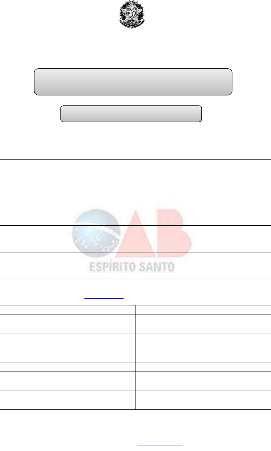 <p>Ordem dos Advogados do Brasil</p><p>Seção do Espírito Santo</p><p>Comissão de Estágio</p><p>1</p><p>Comissão de Estágio – OAB-ES</p><p>Rua Alberto de Oliveira Santos, 59 – Ed. Ricamar – 3º andar – Centro – Vitória –ES 29010-908</p><p>Telefone: 3232-5606 - e-mail: comissoes@oabes.org.br</p><p>comissao.estagio@oabes.org.br</p><p>ESTÁGIO PROFISSIONAL DE ADVOCACIA</p><p>OU ESTÁGIO EM DIREITO</p><p>RELATÓRIO DE ATIVIDADES</p><p>ESCRITÓRIO/SOCIEDADE/EMPRESA:</p><p>CNPJ/CPF nº:</p><p>Endereço Completo:</p><p>E-mail:</p><p>Telefones de Contato:</p><p>Possui Credenciamento: Sim ( ) Não ( ). Caso não possua o credenciamento, providenciar a</p><p>documentação relacionada no CHECK LIST abaixo.</p><p>CLASSIFICAÇÃO ÁREA DE ATIVIDADE PREDOMINANTE</p><p>( ) Escritório de Advocacia ( ) Direito Administrativo</p><p>( ) Sociedade de Advogados ( ) Direito Civil</p><p>( ) Departamento Jurídico de Empresa Privada ( ) Direito Criminal</p><p>( ) Departamento Jurídico de Empresa Pública ( ) Direito do Trabalho</p><p>( ) Núcleo de Prática Jurídica ( ) Direito Previdenciário</p><p>( ) Procuradoria Jurídica ( ) Direito Tributário</p><p>( ) Direito do Consumidor</p><p>( ) Direito de Família e Sucessões</p><p>( ) Todas as Anteriores</p><p>Ordem dos Advogados do Brasil</p><p>Seção do Espírito Santo</p><p>Comissão de Estágio</p><p>2</p><p>Comissão de Estágio – OAB-ES</p><p>Rua Alberto de Oliveira Santos, 59 – Ed. Ricamar – 3º andar – Centro – Vitória –ES 29010-908</p><p>Telefone: 3232-5606 - e-mail: comissoes@oabes.org.br</p><p>comissao.estagio@oabes.org.br</p><p>INFORMAÇÕES SOBRE A UNIDADE</p><p>Diretor ou Chefe da Unidade: OAB/ES nº</p><p>Coordenador: OAB/ES nº</p><p>Número de Advogados ou Procuradores em Exercício na Unidade</p><p>Número de Vagas para Estagiários de Direito a partir do 4º ano de</p><p>Graduação</p><p>Número de Coordenadores de Estágio</p><p>DADOS DO ESTAGIÁRIO E DO CONTRATO DE ESTÁGIO:</p><p>Nome do Estagiário:</p><p>Coordenador/Supervisor Direto do estagiário:</p><p>Instituição de Ensino:</p><p>Início e término do contrato de estágio junto à Instituição:</p><p>Semestre que o aluno está cursando:</p><p>Horário em que o estagiário atua na entidade:</p><p>O contrato de estágio foi renovado? Se sim, informar os dados do contrato que foi renovado:</p><p>Telefone de contato e e-mail do aluno:</p><p>Informar obrigatoriamente pelo menos 2 atos em que o estagiário tenha participado, tais como:</p><p>atividades simuladas (elaboração de peças processuais e formação de processos, da distribuição ao trânsito</p><p>em julgado); análises de autos findos; visitas comprovadas mediante relatórios sumários aos organismos</p><p>judiciários, audiências e sessões, delegacias de polícia, penitenciárias; técnicas de negociação, conciliação e</p><p>arbitragem; e atuação em processos reais e demais serviços jurídicos de assessoria e consultoria. Anexar</p><p>documentos ao relatório.</p><p>Ordem dos Advogados do Brasil</p><p>Seção do Espírito Santo</p><p>Comissão de Estágio</p><p>3</p><p>Comissão de Estágio – OAB-ES</p><p>Rua Alberto de Oliveira Santos, 59 – Ed. Ricamar – 3º andar – Centro – Vitória –ES 29010-908</p><p>Telefone: 3232-5606 - e-mail: comissoes@oabes.org.br</p><p>comissao.estagio@oabes.org.br</p><p>Solicitamos nosso credenciamento como UNIDADE CONCEDENTE DE ESTÁGIO para os fins previstos</p><p>no Estatuto da Advocacia e da OAB (Lei n.º 8.906 de 04 de julho de 1994), seu Regulamento Geral (arts. 27</p><p>e segs.) e arts. 8º a 11º do Provimento nº 001/2017 da OAB/ES1.</p><p>Vitória/ES, de de</p><p>Assinatura do Advogado Responsável</p><p>OAB/ES nº</p><p>1 https://sistemas.tjes.jus.br/ediario/index.php/component/ediario/488113?view=content</p>
