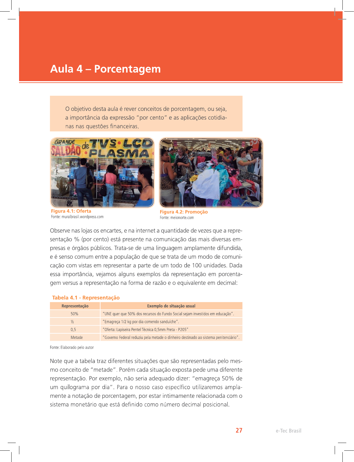 <p>Aula 4 - Porcentagem O objetivo desta aula é rever conceitos de porcentagem, ou seja, a importância da expressão "por cento" e as aplicações cotidia- nas nas questões financeiras. GRANDE SALDÃO de TVSLCD PLASMA Figura 4.1: Oferta Figura 4.2: Promoção Fonte: muralbrasil.wordpress.com Fonte: meionorte.com Observe nas lojas os encartes, e na internet a quantidade de vezes que a repre- sentação % (por cento) está presente na comunicação das mais diversas em- presas e órgãos públicos. Trata-se de uma linguagem amplamente difundida, e é senso comum entre a população de que se trata de um modo de comuni- cação com vistas em representar a parte de um todo de 100 unidades. Dada essa importância, vejamos alguns exemplos da representação em porcenta- gem versus a representação na forma de razão e o equivalente em decimal: Tabela 4.1 Representação Representação Exemplo de situação usual 50% "UNE quer que 50% dos recursos do Fundo Social sejam investidos em educação" 1/2 "Emagreça 1/2 kg por dia comendo sanduíche" 0,5 "Oferta: Lapiseira Pentel Técnica 0,5mm Preta P205" Metade "Governo Federal reduziu pela metade dinheiro destinado ao sistema Fonte: Elaborado pelo autor Note que a tabela traz diferentes situações que são representadas pelo mes- mo conceito de Porém cada situação exposta pede uma diferente representação. Por exemplo, não seria adequado dizer "emagreça 50% de um quilograma por dia". Para o nosso caso específico utilizaremos ampla- mente a notação de porcentagem, por estar intimamente relacionada com o sistema monetário que está definido como número decimal posicional. 27 e-Tec Brasil</p><p>Toda razão da forma a/b na qual denominador b =100, é chamada taxa de porcentagem ou simplesmente porcentagem ou ainda percentagem. Historicamente, a expressão por cento aparece nas principais obras de arit- mética de autores italianos do século XV. O símbolo % surgiu como uma abreviatura da palavra cento utilizada nas operações mercantis. Para indicar um índice de 10 por cento, escrevemos 10% e isto significa que em cada 100 unidades de algo, tomaremos 10 unidades. O cálculo de 10% de 80, por exemplo, pode ser obtido como produto de 10% por 80, isto é: 10%.80 10 .80 = 100 Situações mais elementares, como a citada anteriormente, podem ser re- solvidas "de cabeça" (cálculo mental). Imagine que os 80 citados são na verdade valor da conta de um jantar em família; sobre esse valor vamos acrescentar a taxa de serviço de garçom que é de 10% sobre consumo to- tal. Sendo assim, basta dividir por 10 valor da conta, resultando em 8, ou melhor, em 8,00 reais e somar este resultado ao total consumido: R$8,00 + Em geral, para indicar um índice de M por cento, escrevemos M% e para calcular M% de um número N, realizamos produto: Produto = M%.N = 100 Exemplo 1. Um fichário tem 25 fichas numeradas, sendo que 52% dessas fichas estão etiquetadas com um número par. Quantas fichas têm a etiqueta com número par? Quantas fichas têm a etiqueta com número Solução: Etiquetas Pares = 52% de 25 fichas = 52%.25 = 100 = 13. O restante, (100% 52% = 48% são de fichas número Poderíamos ainda calcular valor de 50% e acrescentar 2% (1% + 1%), vejamos: e-Tec Brasil 28 Matemática Financeira</p><p>(metade de 25) 50% de 25 = centésima parte de 25) 1% de 25 + 1% de 25 0,5. A soma Nesse fichário, há 13 fichas etiquetadas com número par e 12 fichas com número Exemplo 2. Num torneio de basquete, uma determinada seleção disputou quatro partidas na primeira fase e venceu três. Qual a porcentagem de vitórias obtida por essa seleção nessa fase? Solução: Vamos indicar por X% número que representa essa porcentagem. Esse problema pode ser expresso da seguinte forma: X% de 4 = 3 Assim temos: 100 100 4x=300 Ou ainda poderíamos utilizar conceito de razão: 3/4 = 0,75, ou seja, na primeira fase a porcentagem de vitórias foi de Exemplo 3. Ao comprar uma mercadoria, obtive um desconto de 8% sobre o preço mar- cado na etiqueta. Pagou-se R$690,00 pela mercadoria. Qual preço original da mercadoria? Aula 4 - Porcentagem 29 e-Tec Brasil</p><p>Solução: Seja X preço original da mercadoria. Se obtive 8% de desconto sobre preço da etiqueta, preço que paguei representa 100%-8%=92% do preço original, e isto significa que 92% de X = 690 Assim temos: 92% (92) X = 690 100 ( 92x ) 690 100 92. X = 69.000 O preço original da mercadoria era de R$750,00. Saiba mais Abreviaturas empregadas na notação das taxas: Abreviatura Significado a.d. ao dia a.m. ao mês a.b. ao bimestre a.t. ao trimestre a.q. ao quadrimestre a.s. ao semestre a.a. Ano civil ou exato: formado por 365 ou 366 dias (ano bissexto); Ano comercial: formado por 360 dias. Resumo Nesta aula, revisamos o conceito de porcentagem, ou seja, a importância do "por cento" e das aplicações cotidianas nas questões financeiras utilizando apenas denominador 100 nas razões do tipo a/b (com b sempre igual a 100). e-Tec Brasil 30 Matemática Financeira</p><p>Aula 5 - Porcentagem II O objetivo agora consiste no intenso treinamento do conceito de porcentagem por meio de exercícios resolvidos e de apren- dizagem, sendo estes últimos taxados de obrigatórios, ou seja, é primordial a sua resolução por parte dos alunos deste curso. Exercício 1 Dos 35 candidatos que prestaram um concurso, 28 foram aprovados. Sendo assim, qual foi a taxa de aprovação? Solução: A razão que representa os candidatos aprovados seria Para obtermos a taxa percentual, vamos dividir numerador pelo denominador (28: 35), obtendo assim 0,8. Contudo, podemos escrever assim: = 80% 80 100 Resposta: Nesse concurso, 80% dos candidatos inscritos receberam a aprovação. Exercício 2 Numa fábrica, trabalhavam 600 funcionários. Neste ano, o número de tra- balhadores aumentou em 15%. Sendo assim, quantos funcionários têm a fábrica agora? Solução: Cálculo de 15% de 100 15 600 = = 0,15.600 = 90 funcionários 600 + 90 = 690 funcion