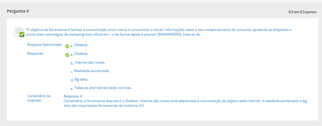<p>Pergunta 4 0,5 em 0,5 pontos "O objetivo da ferramenta é facilitar a comunicação entre marca e consumidor e extrair informações sobre seu comportamento de consumo, ajudando as empresas a construirem estratégias de marketing mais eficientes - e de forma rápida e precisa" (MINDMINERS) trata-se de: Resposta Selecionada: a. Respostas: a. b. Internet das Realidade aumentada. d. Big e. Todas as alternativas estão Comentário da Resposta: A resposta: Comentário: a ferramenta descrita é o chatbots. Internet das coisas está relacionada à comunicação de objetos pela internet. A realidade aumentada e big data são importantes ferramentas da Indústria 4.0.</p>