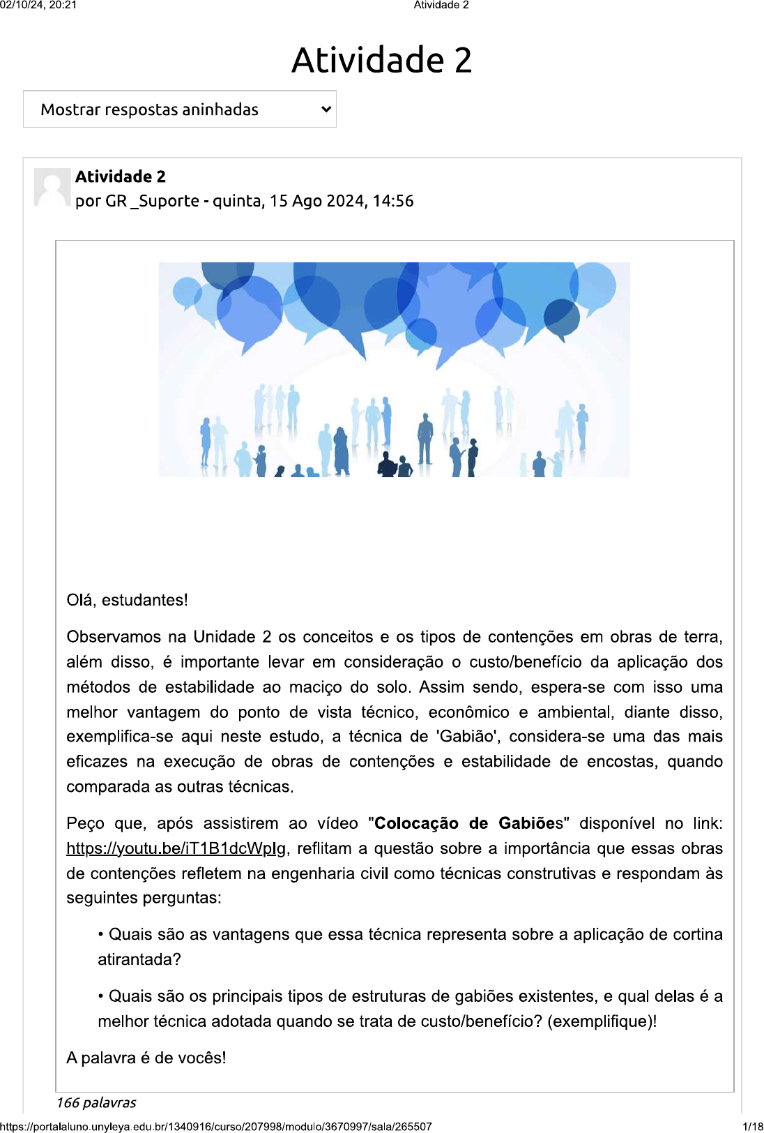 <p>02/10/24, 20:21 Atividade 2 Atividade 2 Mostrar respostas aninhadas Atividade 2 por GR _Suporte - quinta, 15 Ago 2024, 14:56 Olá, estudantes! Observamos na Unidade 2 os conceitos e os tipos de contenções em obras de terra, além disso, é importante levar em consideração o custo/benefício da aplicação dos métodos de estabilidade ao do solo. Assim sendo, espera-se com isso uma melhor vantagem do ponto de vista técnico, econômico e ambiental, diante disso, exemplifica-se aqui neste estudo, a técnica de 'Gabião', considera-se uma das mais eficazes na execução de obras de contenções e estabilidade de encostas, quando comparada as outras técnicas. Peço que, após assistirem ao vídeo "Colocação de Gabiões" disponível no link: https://youtu.be/iT1B1dcWplg, reflitam a questão sobre a importância que essas obras de contenções refletem na engenharia civil como técnicas construtivas e respondam às seguintes perguntas: Quais são as vantagens que essa técnica representa sobre a aplicação de cortina atirantada? Quais são os principais tipos de estruturas de gabiões existentes, e qual delas é a melhor técnica adotada quando se trata de custo/benefício? (exemplifique)! A palavra é de vocês! 166 palavras 1/18</p><p>02/10/24, 20:21 Atividade 2 Marcar como não lida Responder Re: Atividade 2 por MANUEL GONCALVES DE ABREU quarta, 11 Set 2024, 22:57 Vantagens da técnica de gabiões em relação a cortina atirantada é que além da economia, por usar materiais naturais obtido no local da obra ou em torna da mesma,não utiliza concreto ou argamassa e permite uma melhor drenagem da água. Os principais tipos de estruturas de gabiões são: Caixa, colchão e saco. Caixa possui estrutura metálica em formato de paralelepípedo com base e tampa integradas, com diversas divisões internas conhecidas como células. A malha da base é unida com painéis formando as paredes e diafragmas. Também pode ser tipo ancorado onde possui o diafragma posicionado em seu centro, dividindo a caixa em molduras de cada, garantido maior conformidade ao conjunto. Cochão semelhante ao estilo caixa, também é de estrutura metálica em formato de paralelepípedo, possui um formato mais achatado e consequentemente, mais largo e menos espesso. A exemplo do de caixa possui a malha de dupla com base e tampa separada. E'mais usado em canais e margens de córregos e rios, canaletas de drenagens, revestimentos de taludes, afim de estabilizar o solo. Saco possui sua forma estrutural que se assemelha a um saco,com aspecto cilindrico. Para que suas extremidades sejam tampadas, são utilizados arames de aço posicionados de forma alternada nas malhas das bordas que estão livres. è utilizado para fundações das estruturas de gabiões em geral, em obras hidraulicas, instalações com grande profundidade, principalmente em solo muito frágil. Para custo beneficio o melhor tipo é o de caixa. 245 palavras Marcar como não lida Mostrar principal Responder Re: Atividade 2 por Jackson Moreira Souza segunda, 16 Set 2024, 15:17 Olá, caríssimo Manuel, estimo que esteja bem! Agradeço pelas contribuições e já quero destacar alguns pontos: Embora a resposta tenha abordado as características técnicas dos gabiões, faltou uma comparação mais detalhada entre os tipos em termos de custo/benefício. A escolha do gabião tipo caixa como o de melhor custo/benefício é válida, pois ele tem ampla aplicabilidade e boa durabilidade. No entanto, seria interessante detalhar o motivo, como o fato de o gabião tipo caixa exigir menos mão de obra especializada e ser mais versátil em diferentes situações de contenção, além de ser mais fácil de empilhar e conectar em estruturas maiores. Poderia ter sido feito um contraponto em termos de aplicações específicas onde os outros tipos de gabiões 2/18</p><p>02/10/24, 20:21 Atividade 2 são mais vantajosos. Por exemplo, os gabiões tipo colchão são mais adequados para áreas de fluxo de água constante, enquanto os tipo saco são úteis em locais de difícil acesso e terrenos instáveis. Cordialmente, Jackson Souza. Marcar como não lida Mostrar principal Responder Re: Atividade 2 por MIGUEL BATISTA FILHO sábado, 14 Set 2024, 00:06 Vantagens dos Gabiões em Relação às Cortinas Atirantadas Custo: Em geral, os gabiões tendem a ser mais econômicos do que as cortinas atirantadas. Os materiais para gabiões (malha de arame e pedras) são frequentemente mais baratos do que os materiais e a mão-de-obra necessários para montar uma cortina atirantada. Simplicidade de Instalação: A instalação de gabiões é relativamente simples e não requer equipamentos pesados, como perfuratrizes e ancoragens, o que pode reduzir o custo e o tempo de construção. Flexibilidade: Os gabiões são mais flexíveis e podem acomodar movimentos do solo e pequenas deformações sem perder a funcionalidade. Isso é especialmente útil em áreas sujeitas a movimentações de terras e instabilidade. Estética e Integração Ambiental: Gabiões tendem a se integrar melhor ao ambiente natural, pois as pedras podem se revestir com vegetação ao longo do tempo, o que pode ser esteticamente mais agradável do que as cortinas atirantadas. Além disso, o uso de gabiões pode ajudar a criar habitats para a fauna local. Drenagem: Gabiões permitem uma excelente drenagem da água, o que é benéfico para evitar o acúmulo de água e reduzir a pressão sobre a estrutura, enquanto as cortinas atirantadas podem exigir sistemas de drenagem adicionais. Principais Tipos de Estruturas de Gabiões e Custo/Benefício Gabiões de Caixa: São os tipos mais comuns e consistem em caixas de malha de arame preenchidas com pedras. Eles são bastante versáteis e usados para muros de contenção, proteção de encostas e controle de erosão. Custo/benefício: Geralmente, são uma boa escolha em termos de custo/benefício devido à sua simplicidade e eficácia. Eles podem ser construídos com materiais relati