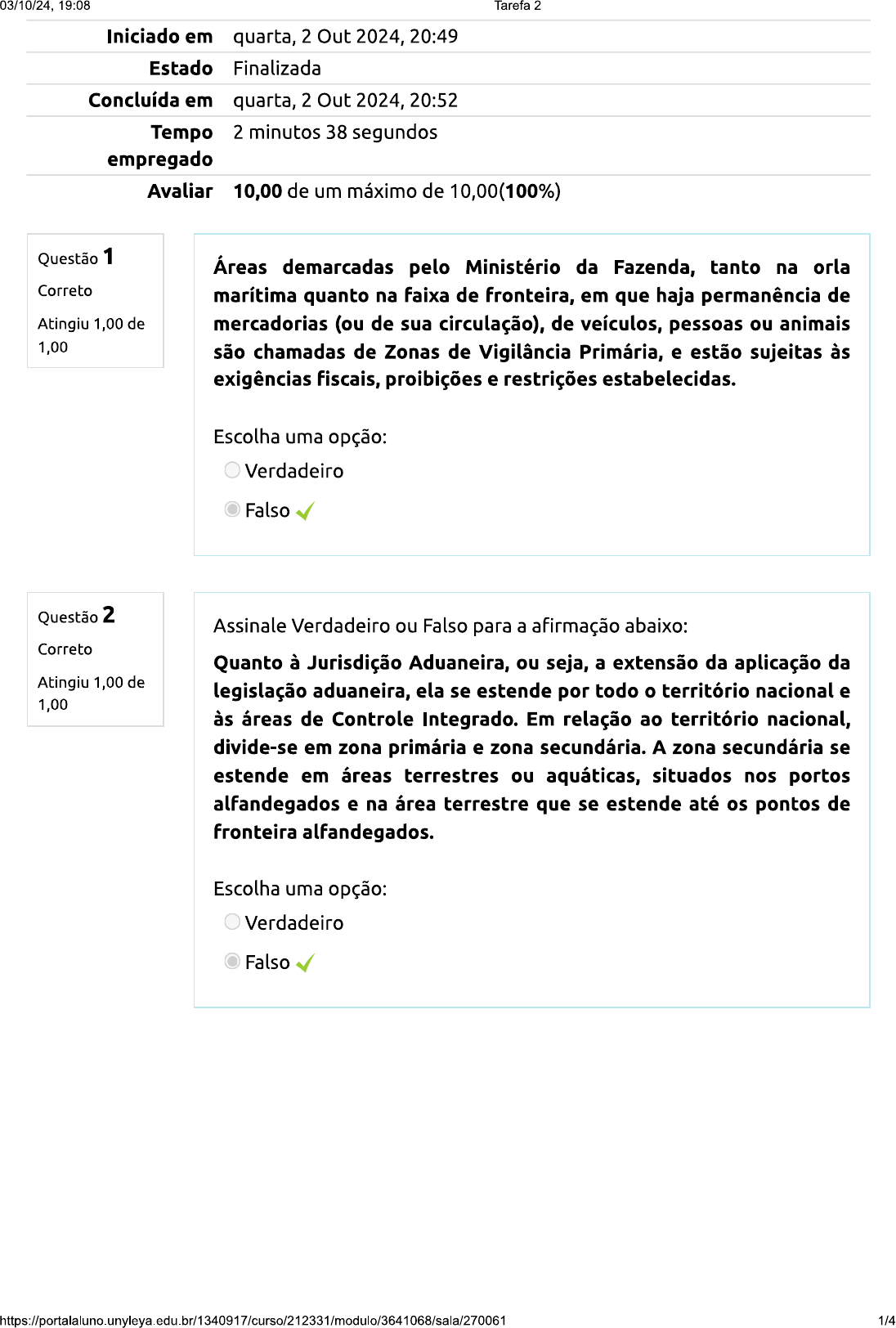 <p>03/10/24, 19:08 Tarefa 2 Iniciado em quarta, 2 Out 2024, 20:49 Estado Finalizada Concluída em quarta, 2 Out 2024, 20:52 Tempo 2 minutos 38 segundos empregado Avaliar 10,00 de um máximo de 10,00(100%) Questão 1 Áreas demarcadas pelo Ministério da Fazenda, tanto na orla Correto marítima quanto na faixa de fronteira, em que haja permanência de Atingiu 1,00 de mercadorias (ou de sua circulação), de veículos, pessoas ou animais 1,00 são chamadas de Zonas de Vigilância Primária, e estão sujeitas às exigências fiscais, proibições e restrições estabelecidas. Escolha uma opção: Verdadeiro Falso Questão 2 Assinale Verdadeiro ou Falso para a afirmação abaixo: Correto Quanto à Jurisdição Aduaneira, ou seja, a extensão da aplicação da Atingiu 1,00 de legislação aduaneira, ela se estende por todo o território nacional e 1,00 às áreas de Controle Integrado. Em relação ao território nacional, divide-se em zona primária e zona secundária. A zona secundária se estende em áreas terrestres ou aquáticas, situados nos portos alfandegados e na área terrestre que se estende até os pontos de fronteira alfandegados. Escolha uma opção: Verdadeiro Falso 1/4</p><p>03/10/24, 19:08 Tarefa 2 Questão 3 Conforme a Lei 9.432 de 8 de janeiro de 1997, que dispõe sobre a Correto Atingiu 3,00 de ordenação do transporte aquaviário, relacione os conceitos que se 3,00 apresentam abaixo: (1) afretamento a casco nu (2) afretamento por viagem (3) suspensão provisória de bandeira (4) navegação de cabotagem (5) navegação interior (6) navegação a longo curso a ( 6 ) é realizada entre portos brasileiros e estrangeiros. b. ( 1 ) é o contrato celebrado em virtude do qual o afretador tem a posse, o uso e o controle da embarcação, por um certo tempo, além de incluir o direito de designar o comandante da tripulação. C. ( 3 ) é o ato pelo qual o proprietário da embarcação suspense, de forma temporária, o uso da bandeira de origem com vistas de um novo registro em outro país. d. ( 2 ) é o contrato em que o fretador é obrigado a colocar uma parte ou toda a embarcação - até a tripulação - a disposição do afretador para realizar o transporte em uma ou mais viagens. e. ( 4 ) é realizada entre portos ou pontos do território brasileiro e, para tanto, utiliza a via marítima ou esta e as vias navegáveis interiores. 5 é aquela realizada em hidrovias interiores, em percurso nacional. 2/4</p><p>03/10/24, 19:08 Tarefa 2 Sua resposta está correta. Questão 4 No que tange a divisão de zonas primárias e secundárias quanto a Correto Atingiu 3,00 de sua extensão, estudada no Capítulo 2, faça as associações corretas 3,00 de acordo com a divisão: 1. Zona Primária; 2. Zona Secundária; a. ( 1 ) Portos; b. ( 2 ) Terminais alfandegados C. ( 1 ) Área terrestre, situado nos aeroportos alfandegados. d. ( 1 ) Área terrestre, que se estende até os pontos de fronteira alfandegados. e. ( 2 ) restante do território nacional f. ( 1 ) Zonas de Processamento de Exportações, para fins de controle aduaneiro Sua resposta está correta. 3/4</p><p>03/10/24, 19:08 Tarefa 2 Questão 5 Em relação aos intervenientes no Sistema Mercante, assinale a Correto alternativa INCORRETA: Atingiu 2,00 de 2,00 Escolha uma opção: a. Transportador é interveniente no sistema mercante; b. A Agência Nacional de Transportes Aquaviários não é interveniente no sistema mercante; C. Departamento da Marinha Mercante é interveniente no sistema mercante; Receita Federal do Brasil (RFB) é interveniente no sistema mercante; e. Banco Nacional de Desenvolvimento Econômico e Social é interveniente no sistema mercante; Sua resposta está correta. 4/4</p>