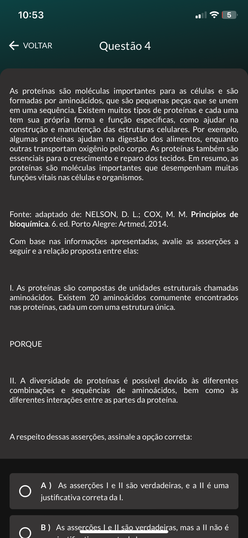 <p>10:53 5 VOLTAR Questão 4 As proteínas são moléculas importantes para as células e são formadas por aminoácidos, que são pequenas peças que se unem em uma Existem muitos tipos de proteínas e cada uma tem sua própria forma e função específicas, como ajudar na construção e manutenção das estruturas celulares. Por exemplo, algumas proteínas ajudam na digestão dos alimentos, enquanto outras transportam oxigênio pelo corpo. As proteínas também são essenciais para crescimento e reparo dos tecidos. Em resumo, as proteínas são moléculas importantes que desempenham muitas funções vitais nas células e organismos. Fonte: adaptado de: NELSON, D. L.; COX, M. M. Princípios de bioquímica. 6. ed. Porto Alegre: Artmed, 2014. Com base nas informações apresentadas, avalie as asserções a seguir e a relação proposta entre elas: I. As proteínas são compostas de unidades estruturais chamadas aminoácidos. Existem 20 aminoácidos comumente encontrados nas proteínas, cada um com uma estrutura única. PORQUE II. A diversidade de proteínas é possível devido às diferentes combinações e sequências de aminoácidos, bem como às diferentes interações entre as partes da proteína. A respeito dessas asserções, assinale a opção correta: A ) As asserções e II são verdadeiras, e a II é uma justificativa correta da I. B) As asserções são verdadeiras, mas a II não é</p>