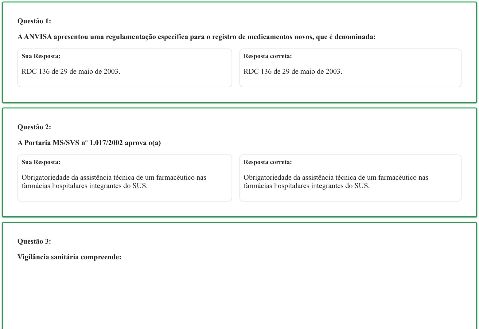 <p>Questão 1:</p><p>A ANVISA apresentou uma regulamentação específica para o registro de medicamentos novos, que é denominada:</p><p>Sua Resposta:</p><p>RDC 136 de 29 de maio de 2003.</p><p>Resposta correta:</p><p>RDC 136 de 29 de maio de 2003.</p><p>Questão 2:</p><p>A Portaria MS/SVS nº 1.017/2002 aprova o(a)</p><p>Sua Resposta:</p><p>Obrigatoriedade da assistência técnica de um farmacêutico nas</p><p>farmácias hospitalares integrantes do SUS.</p><p>Resposta correta:</p><p>Obrigatoriedade da assistência técnica de um farmacêutico nas</p><p>farmácias hospitalares integrantes do SUS.</p><p>Questão 3:</p><p>Vigilância sanitária compreende:</p><p>04/10/2024, 10:59 Rever Avaliação</p><p>https://ava.institutoprominas.com.br/notas/rever-avaliacao 1/4</p><p>Sua Resposta:</p><p>Conjunto de ações com o objetivo de eliminar, diminuir, bem como</p><p>prevenir riscos à saúde.</p><p>Resposta correta:</p><p>Conjunto de ações com o objetivo de eliminar, diminuir, bem como</p><p>prevenir riscos à saúde.</p><p>Questão 4:</p><p>A Legislação responsável pela instituição do Sistema de Controle e Fiscalização em toda a cadeia dos produtos farmacêuticos foi criada pela:</p><p>Sua Resposta:</p><p>Portaria MS/GM nº 802 08/10/1998.</p><p>Resposta correta:</p><p>Portaria MS/GM nº 802 08/10/1998.</p><p>Questão 5:</p><p>A Lei nº 13.021/2014 dispõe sobre o exercício e a fiscalização das atividades farmacêuticas onde se pode afirmar:</p><p>Sua Resposta:</p><p>Assistência farmacêutica envolve processo de pesquisa,</p><p>desenvolvimento e armazenamento de fármacos até o momento da</p><p>dispensação e avaliação do uso na população.</p><p>Resposta correta:</p><p>Assistência farmacêutica envolve processo de pesquisa,</p><p>desenvolvimento e armazenamento de fármacos até o momento da</p><p>dispensação e avaliação do uso na população.</p><p>Questão 6:</p><p>A Lei nº 9782 de 26/01/1999 é responsável pelo(a):</p><p>04/10/2024, 10:59 Rever Avaliação</p><p>https://ava.institutoprominas.com.br/notas/rever-avaliacao 2/4</p><p>Sua Resposta:</p><p>Criação do Conselho Nacional de Biossegurança (CNBS).</p><p>Resposta correta:</p><p>Criação da Agência Nacional de Vigilância Sanitária.</p><p>Questão 7:</p><p>Segundo a Lei Federal 5991/73, que se relaciona ao controle sanitário do comércio de drogas, medicamentos e insumos farmacêuticos,</p><p>podemos afirmar que:</p><p>Sua Resposta:</p><p>Droga é uma substância com finalidade medicamentosa ou sanitária.</p><p>Resposta correta:</p><p>Droga é uma substância com finalidade medicamentosa ou sanitária.</p><p>Questão 8:</p><p>“Os medicamentos ofertados a comunidade precisam ter qualidade, segurança e eficácia terapêutica, englobando o uso racional de</p><p>medicamentos pelos usuários e profissionais.” Essas diretrizes foram estabelecidas pelo(a):</p><p>Sua Resposta:</p><p>Política Nacional de Assistência Farmacêutica (PNAF).</p><p>Resposta correta:</p><p>Organização Mundial da Saúde (OMS).</p><p>Questão 9:</p><p>“A vigilância sanitária media os interesses da saúde e os econômicos.” Essa afirmação no âmbito da vigilância sanitária se refere ao seguinte</p><p>conceito:</p><p>04/10/2024, 10:59 Rever Avaliação</p><p>https://ava.institutoprominas.com.br/notas/rever-avaliacao 3/4</p><p>Sua Resposta:</p><p>Regulação.</p><p>Resposta correta:</p><p>Regulação.</p><p>Questão 10:</p><p>Assim que o medicamento é disponibilizado no mercado são iniciados os estudos da fase IV, que compreendem:</p><p>Sua Resposta:</p><p>Farmacovigilância.</p><p>Resposta correta:</p><p>Farmacovigilância.</p><p>04/10/2024, 10:59 Rever Avaliação</p><p>https://ava.institutoprominas.com.br/notas/rever-avaliacao 4/4</p>
