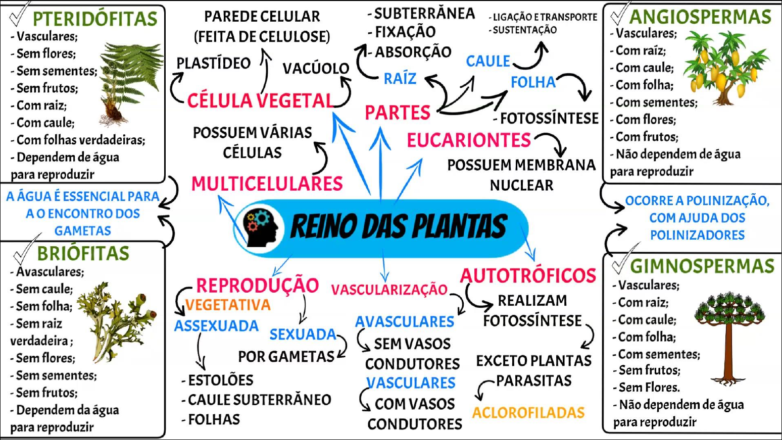 <p>PTERIDÓFITAS PAREDE CELULAR - LIGAÇÃO E TRANSPORTE ANGIOSPERMAS Vasculares; (FEITA DE CELULOSE) FIXAÇÃO SUSTENTAÇÃO - Vasculares; - Sem flores; ABSORÇÃO - Com raíz; PLASTÍDEO VACÚOLO CAULE - Sem sementes; - Com caule; RAÍZ - Sem frutos; FOLHA - Com folha; - Com raiz; - Com sementes; PARTES - Com caule; Com flores; POSSUEM VÁRIAS Com folhas verdadeiras; EUCARIONTES Com frutos; - Dependem de água CÉLULAS ) - Não dependem de água POSSUEM MEMBRANA para reproduzir para reproduzir MULTICELULARES NUCLEAR A ÁGUA É ESSENCIAL PARA OCORRE A POLINIZAÇÃO, A o ENCONTRO DOS REINO DAS PLANTAS COM AJUDA DOS GAMETAS POLINIZADORES BRIOFITAS Avasculares; GIMNOSPERMAS AUTOTROFICOS - Sem caule; VASCULARIZAÇÃO Vasculares; Sem folha; VEGETATIVA REALIZAM - Com raiz; - Sem raiz ASSEXUADA AVASCULARES FOTOSSÍNTESE - Com caule; SEXUADA SEM VASOS - Com folha; - Sem flores; POR GAMETAS EXCETO PLANTAS Com sementes; CONDUTORES Sem sementes; Sem frutos; - ESTOLÕES VASCULARES PARASITAS Sem frutos; Sem Flores. - CAULE - Dependem da água COM VASOS - Não dependem de água ACLOROFILADAS - FOLHAS para reproduzir CONDUTORES para reproduzir</p>