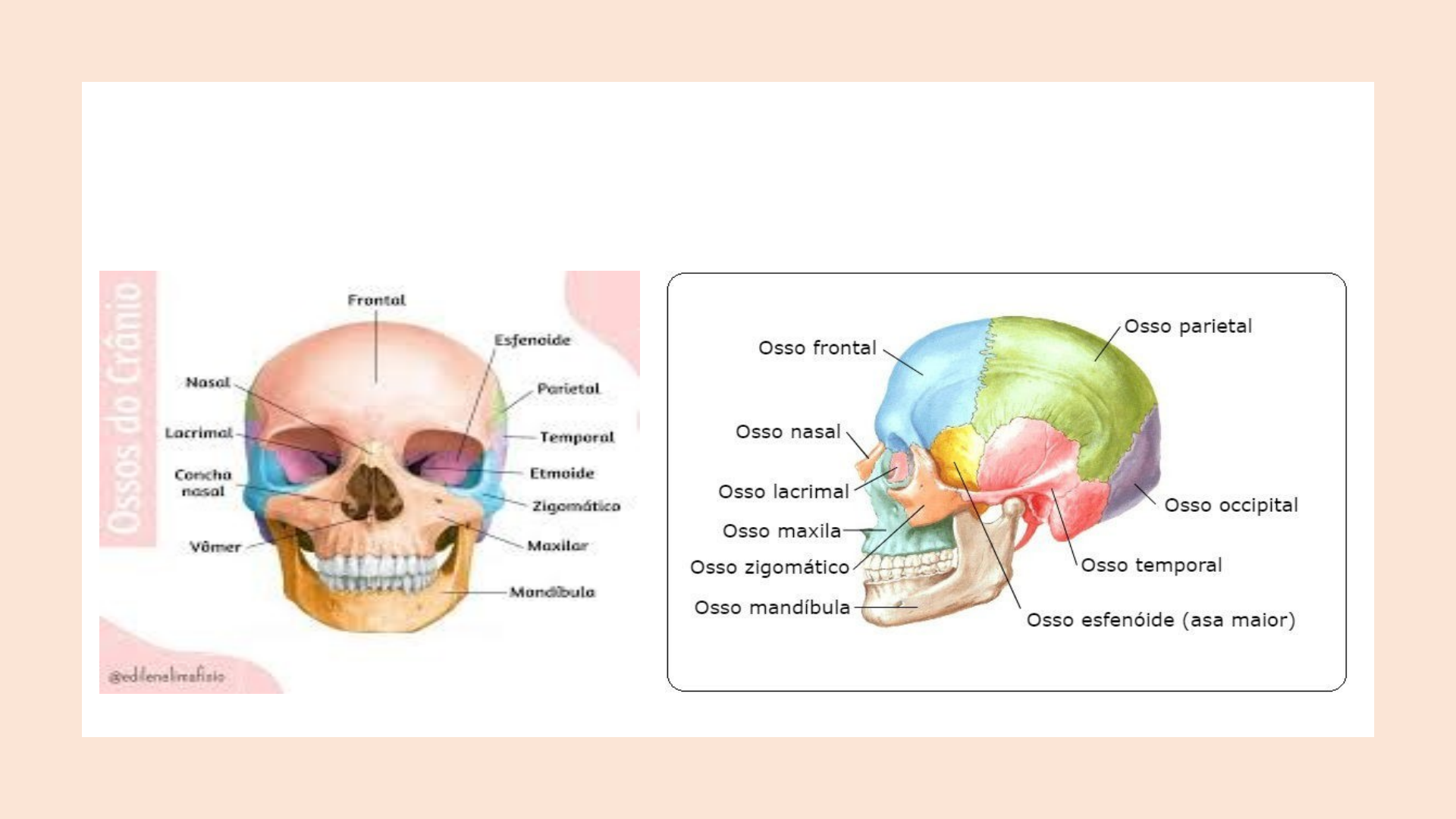 <p>ROTEIRO DE ESTUDO: PROVA PRÁTICA 1</p><p>Sistema esquelético:</p><p>Ossos do crânio (frontal, parietal, temporal, occipital, nasal, zigomático, maxilar, mandíbula, esfenóide);</p><p>Coluna vertebral (Vértebras cervicais, torácicas, lombares, sacrais e coccígeas);</p><p>Tórax (Esterno – manúbrio, corpo do esterno e processo xifóide, costelas);</p><p>Membros superiores (clavícula, escápula, úmero, ulna, rádio, ossos do carpo, ossos do metacarpo, falanges);</p><p>Membros inferiores (Ossos</p><p>do quadril – Ílio, ísquio e púbis, fêmur, patela, tíbia, fíbula, ossos do tarso, ossos do metatarso, falanges).</p><p>image1.png</p><p>image2.png</p>