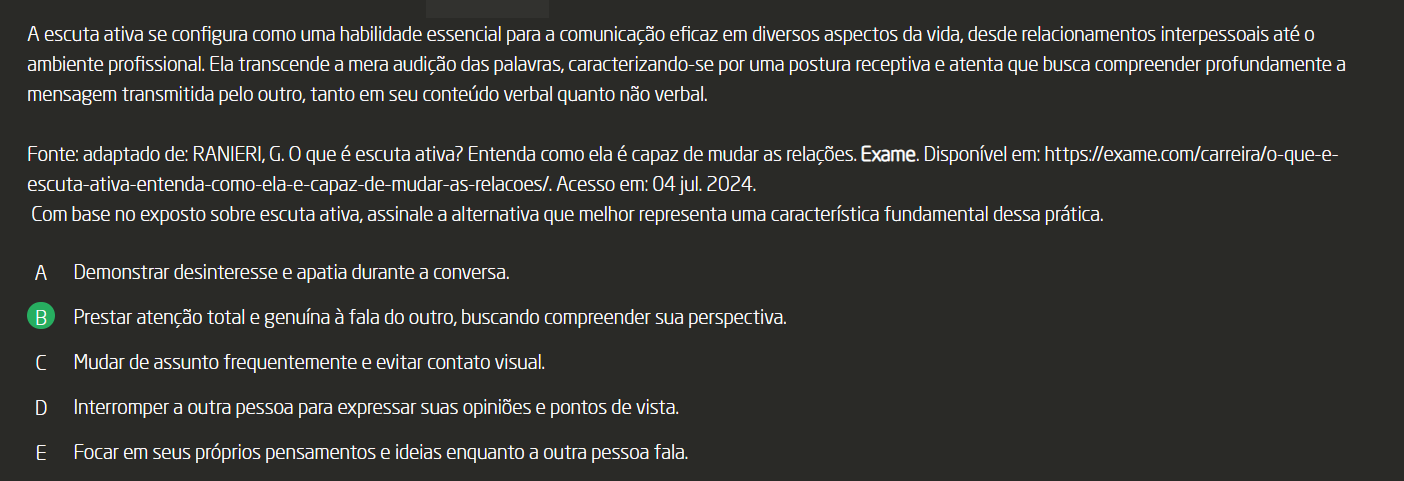 <p>A escuta ativa se configura como uma habilidade essencial para a comunicação eficaz em diversos aspectos da vida, desde relacionamentos interpessoais até ambiente profissional. Ela transcende a mera audição das palavras, caracterizando-se por uma postura receptiva e atenta que busca compreender profundamente a mensagem transmitida pelo outro, tanto em seu conteúdo verbal quanto não verbal. Fonte: adaptado de: RANIERI, G. 0 que é escuta ativa? Entenda como ela é capaz de mudar as relações. Exame. Disponível em: https://exame.com/carreira/o-que-e- Acesso em: 04 jul. 2024. Com base no exposto sobre escuta ativa, assinale a alternativa que melhor representa uma característica fundamental dessa prática. A Demonstrar desinteresse e apatia durante a conversa. B Prestar atenção total e genuína à fala do outro, buscando compreender sua perspectiva. Mudar de assunto frequentemente e evitar contato visual. D Interromper a outra pessoa para expressar suas opiniões e pontos de vista. E Focar em seus próprios pensamentos e ideias enquanto a outra pessoa fala.</p>