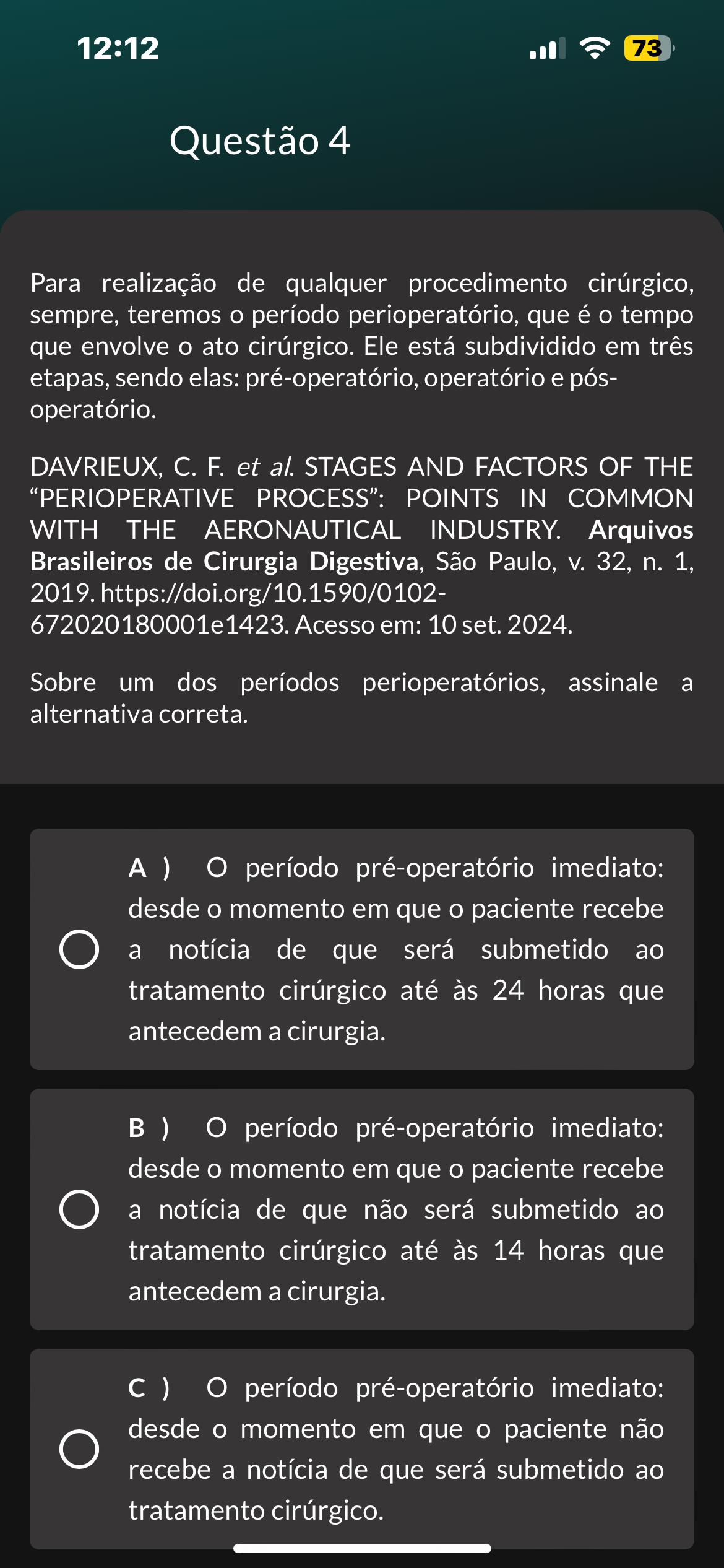 <p>12:12 73 Questão 4 Para realização de qualquer procedimento cirúrgico, sempre, teremos período perioperatório, que é tempo que envolve ato cirúrgico. Ele está subdividido em três etapas, sendo elas: pré-operatório, operatório e pós- operatório. DAVRIEUX, C. F. et al. STAGES AND FACTORS OF THE "PERIOPERATIVE PROCESS": POINTS IN COMMON WITH THE AERONAUTICAL INDUSTRY. Arquivos Brasileiros de Cirurgia Digestiva, São Paulo, V. 32, n. 1, 2019. https://doi.org/10.1590/0102 672020180001e1423. Acesso em: 10 set. 2024. Sobre um dos períodos perioperatórios, assinale a alternativa correta. A ) O período pré-operatório imediato: desde momento em que O paciente recebe a notícia de que será submetido ao tratamento cirúrgico até às 24 horas que antecedem a cirurgia. B ) O período pré-operatório imediato: desde momento em que O paciente recebe a notícia de que não será submetido ao tratamento cirúrgico até às 14 horas que antecedem a cirurgia. ) O período pré-operatório imediato: desde O momento em que paciente não recebe a notícia de que será submetido ao tratamento cirúrgico.</p>